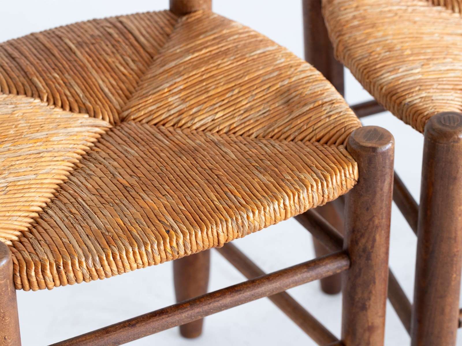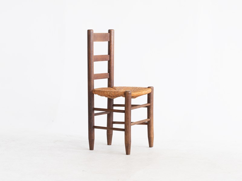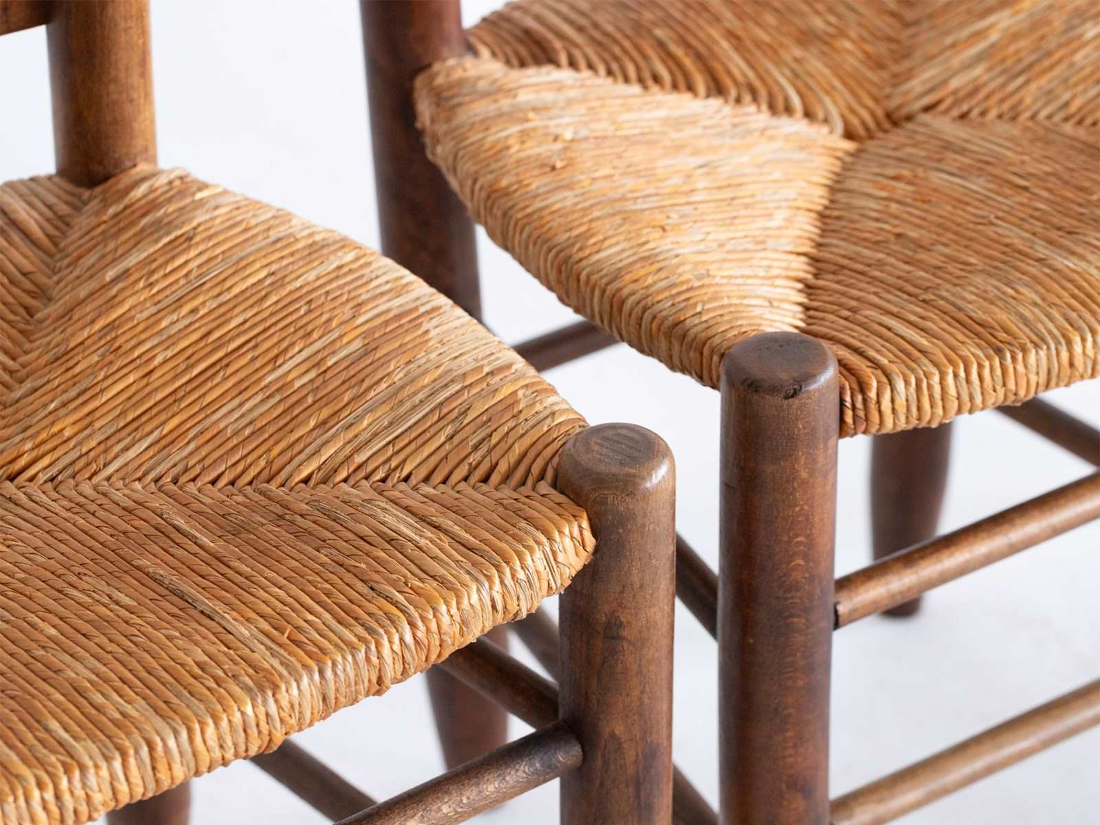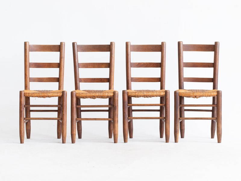 A set of four beech and rush dining chairs in the manner of Charlotte Perriand’s No 19 Bauche model. French, mid 20C.