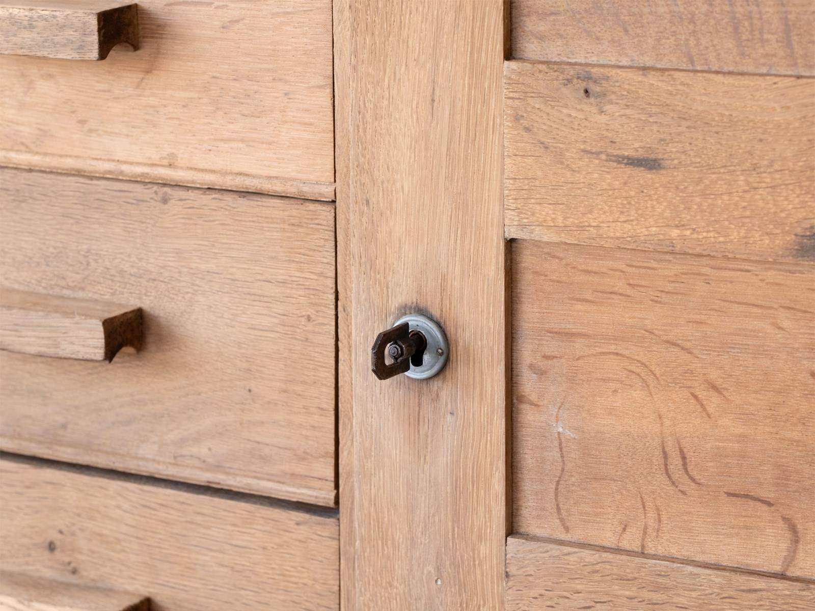 Restored to a natural oak finish. Working locks with two keys. Traces of historic woodworm which has been treated as a precautionary and preventative measure.
