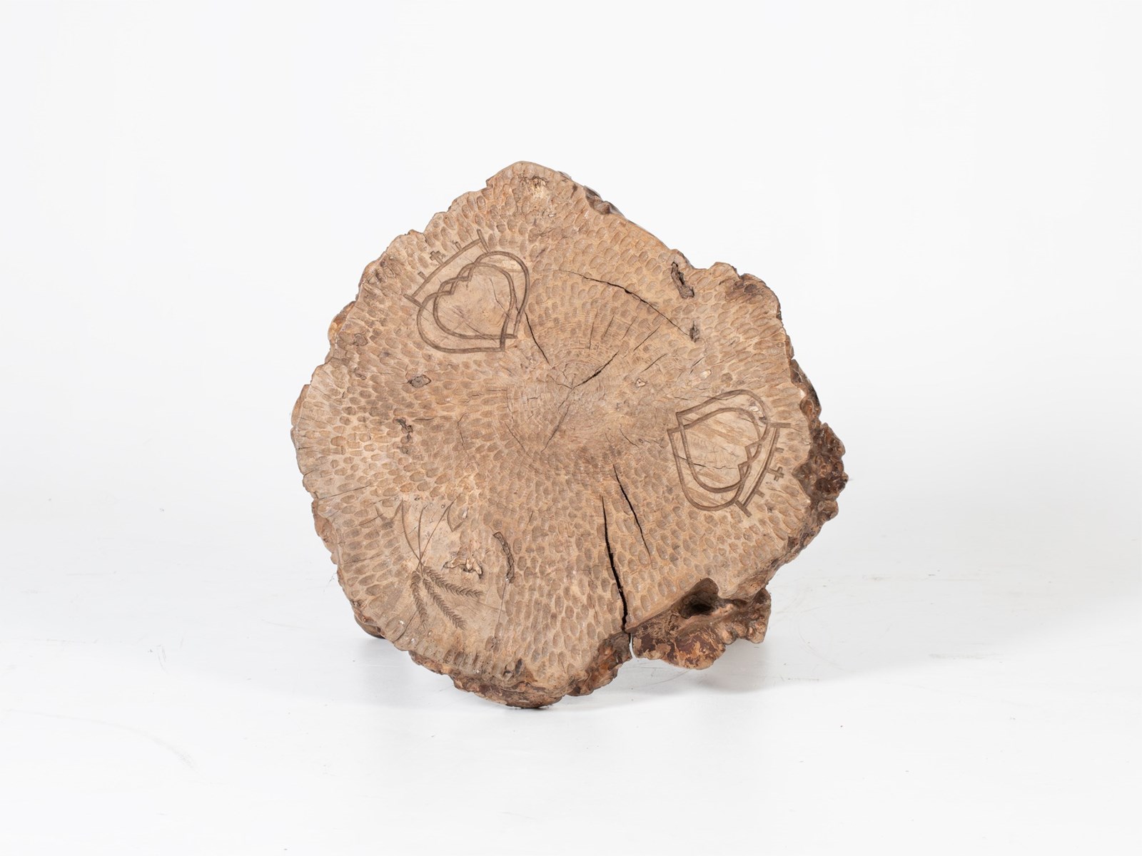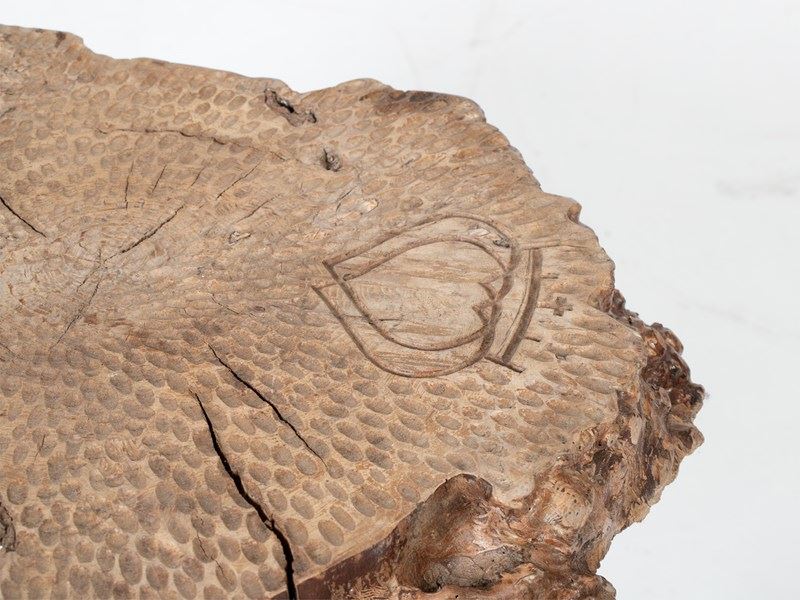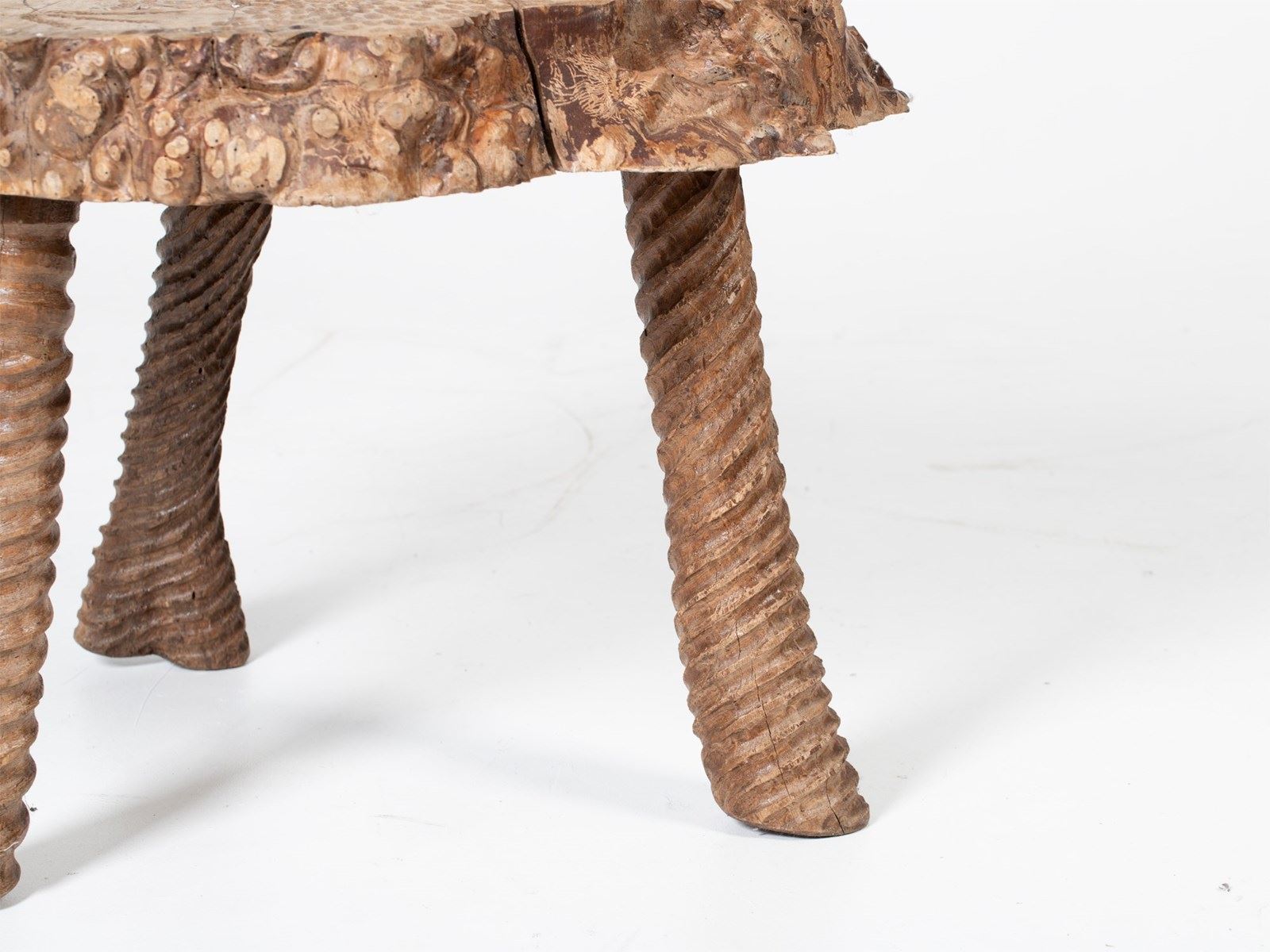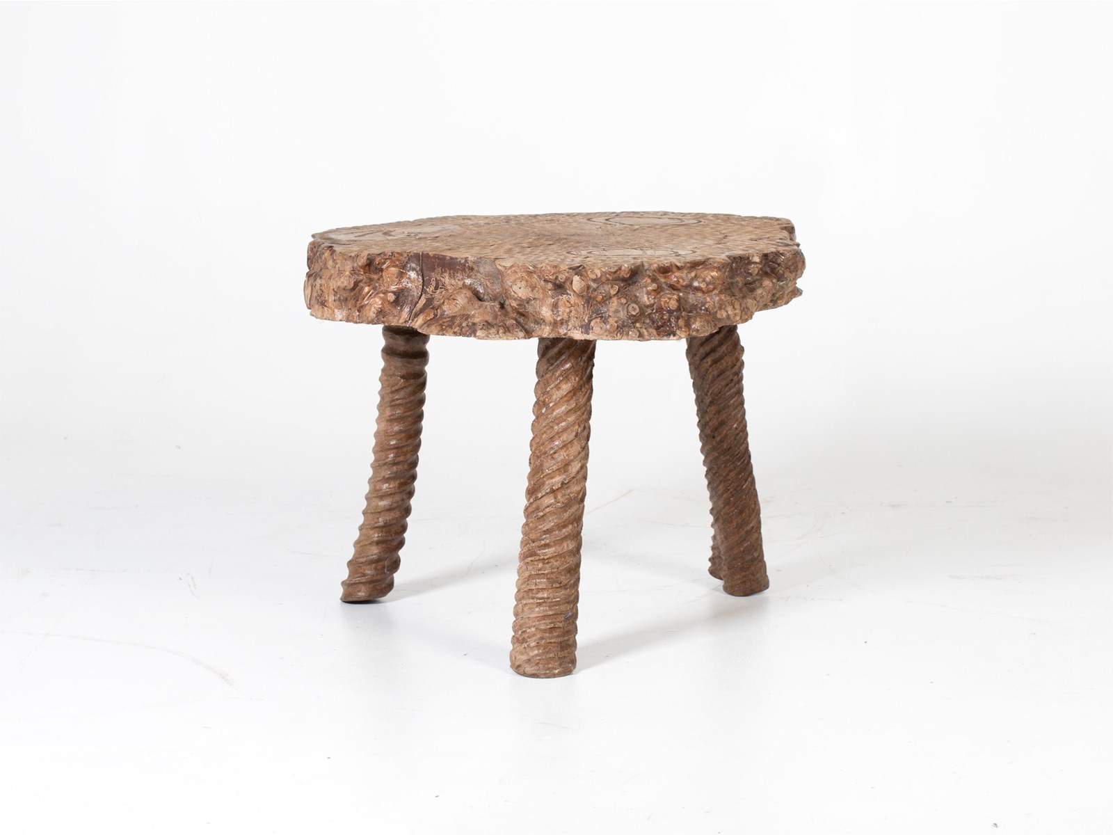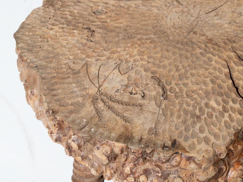 A naturalistic elm side table with decoratively-carved top. French, c. 1900.