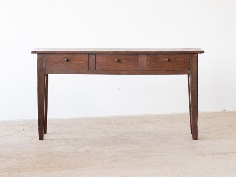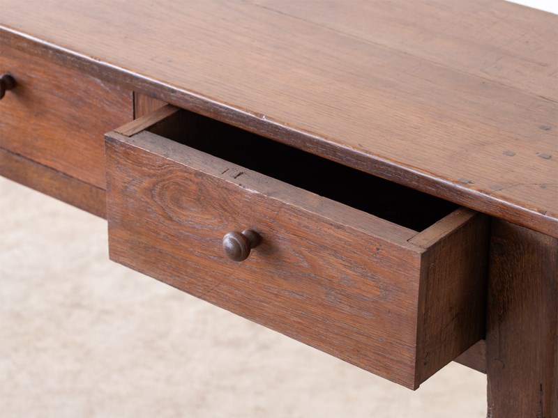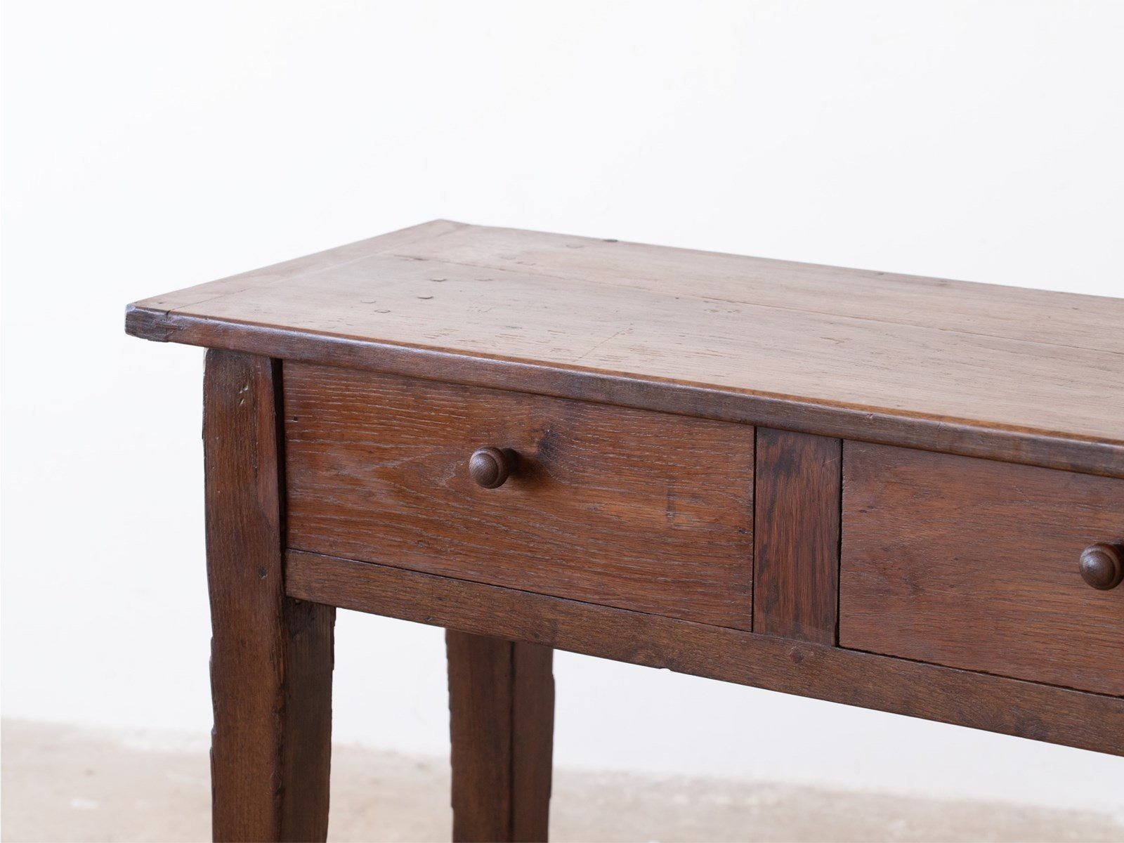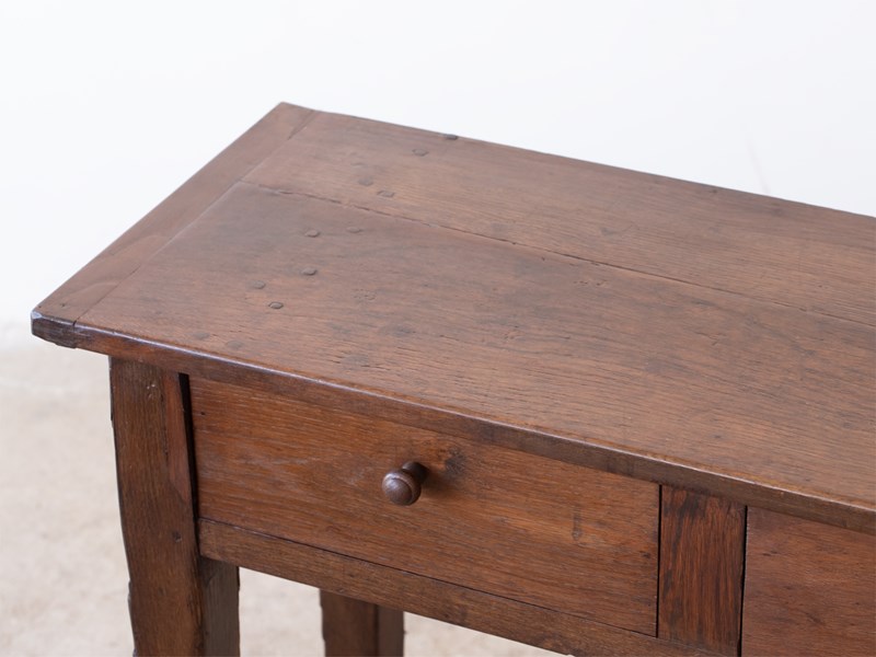 A three-drawer oak serving table or console adapted from a large antique French table.