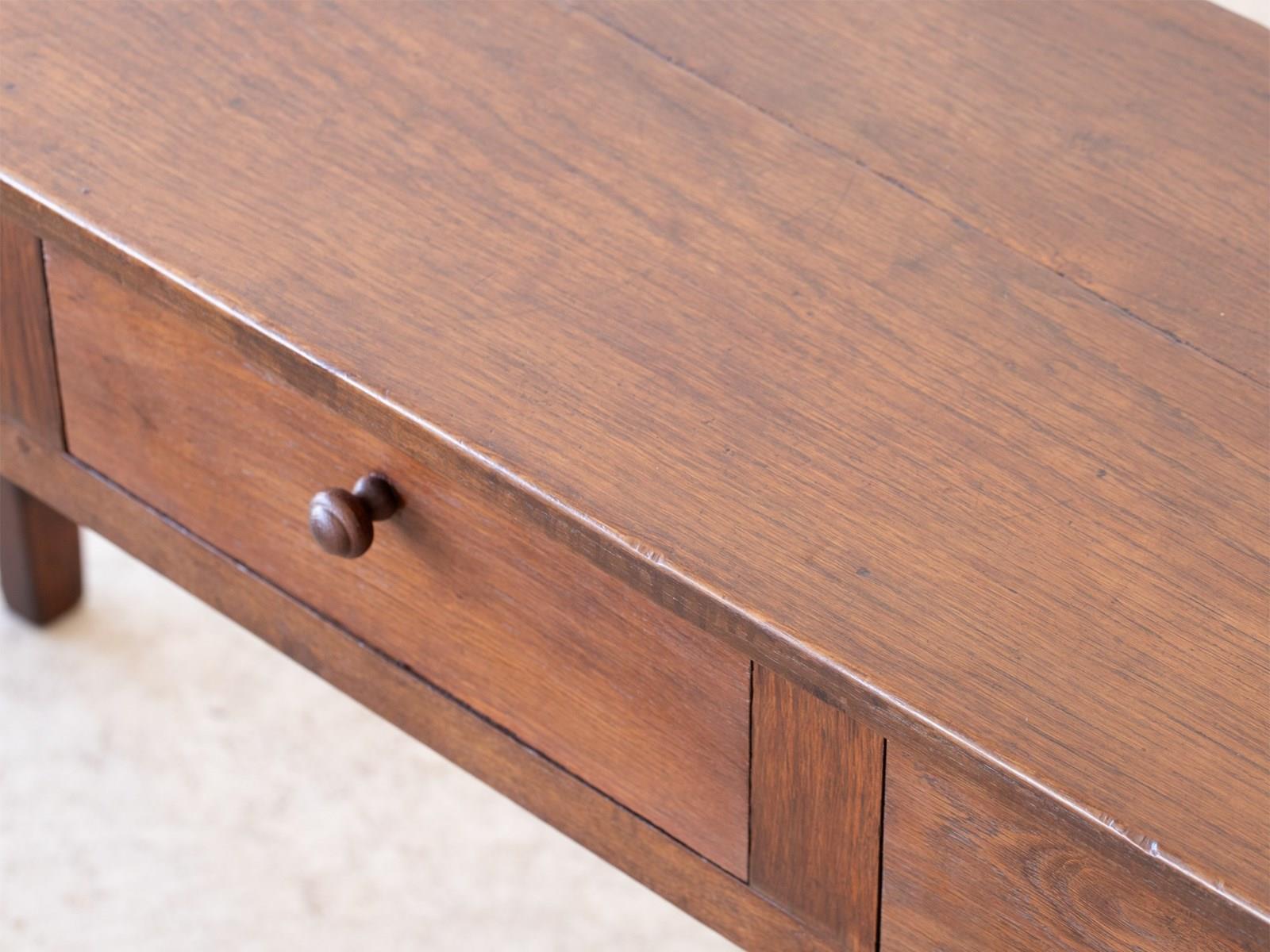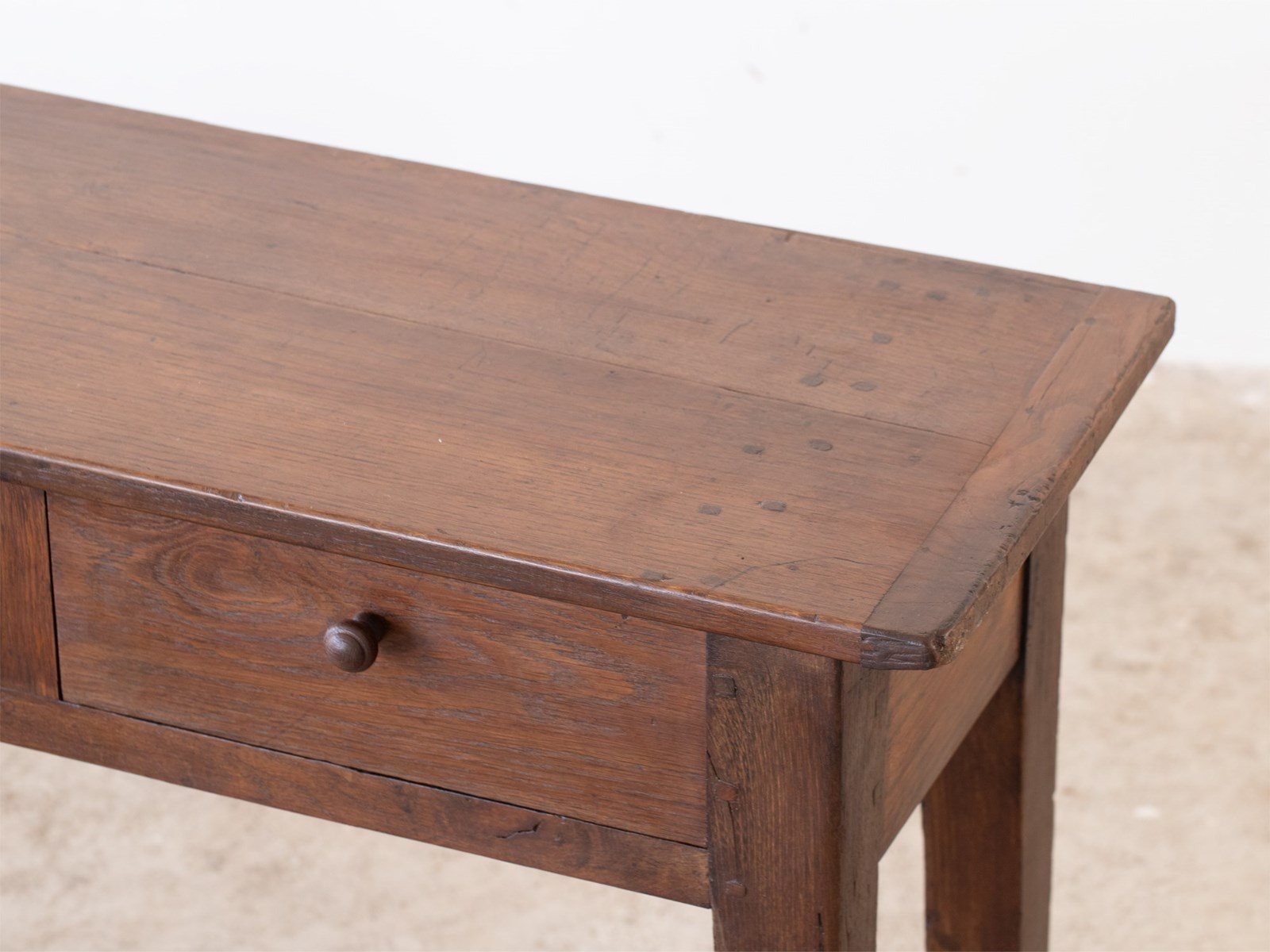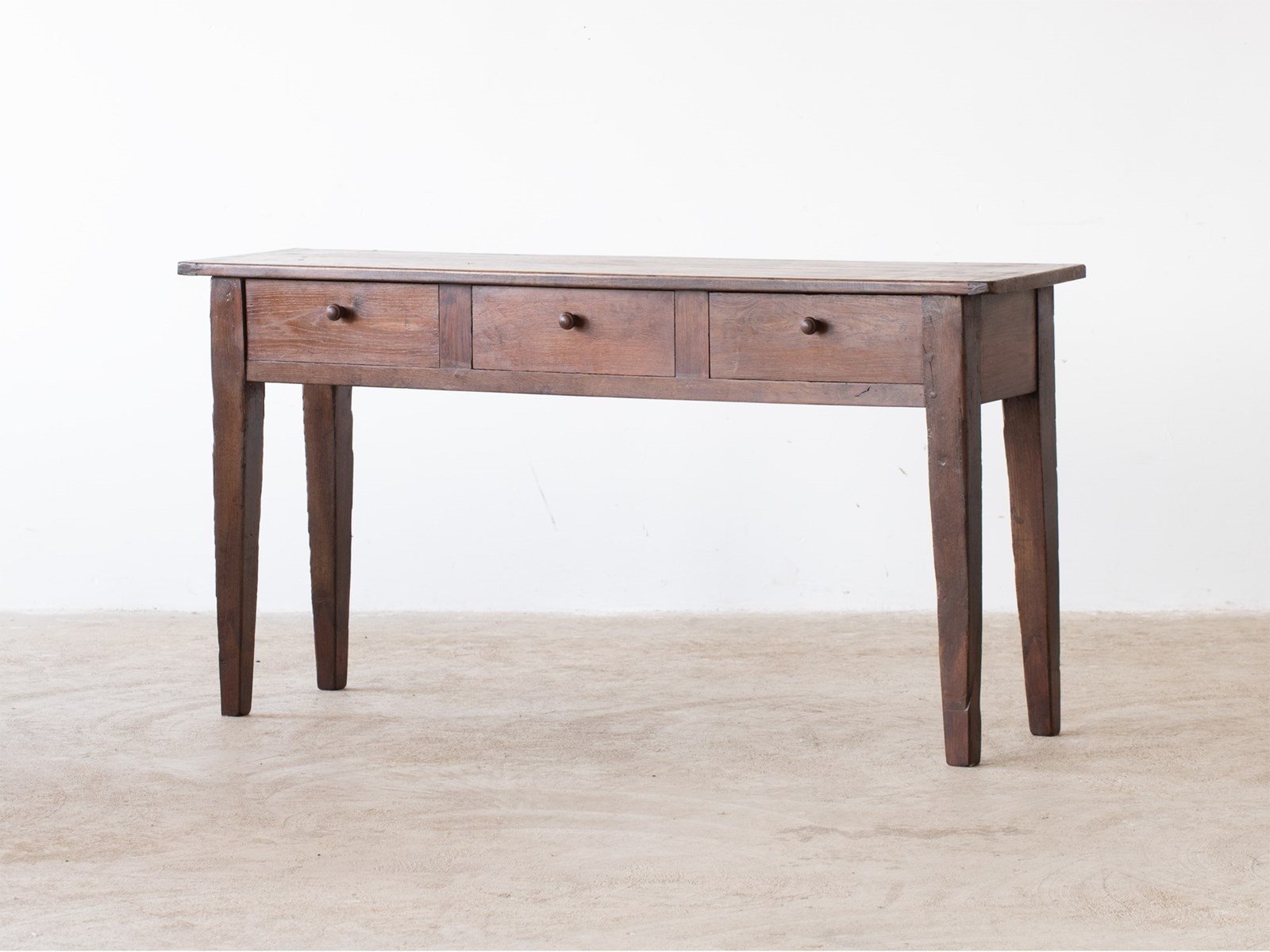 A three-drawer oak serving table or console adapted from a large antique French table.