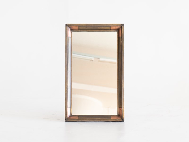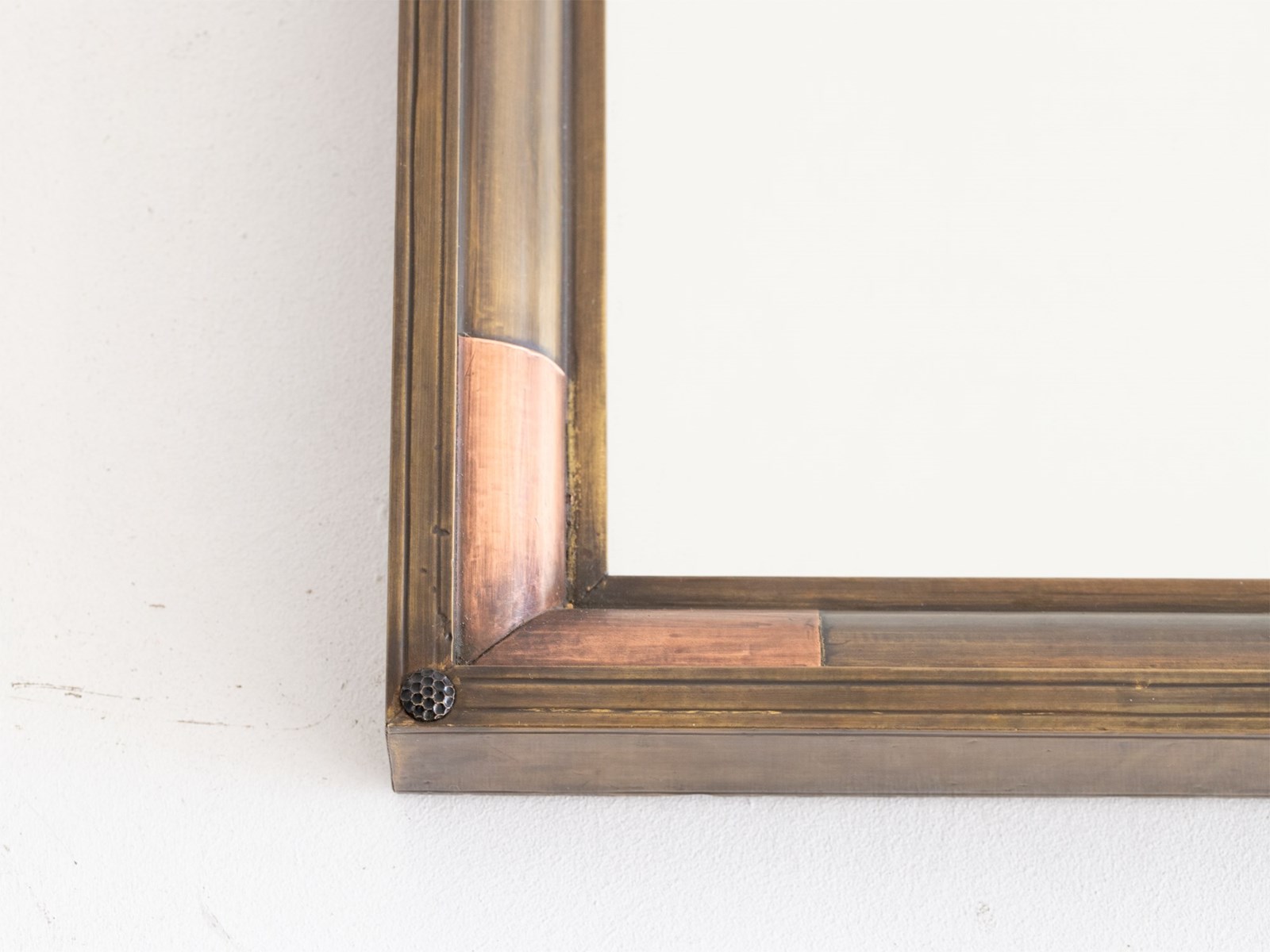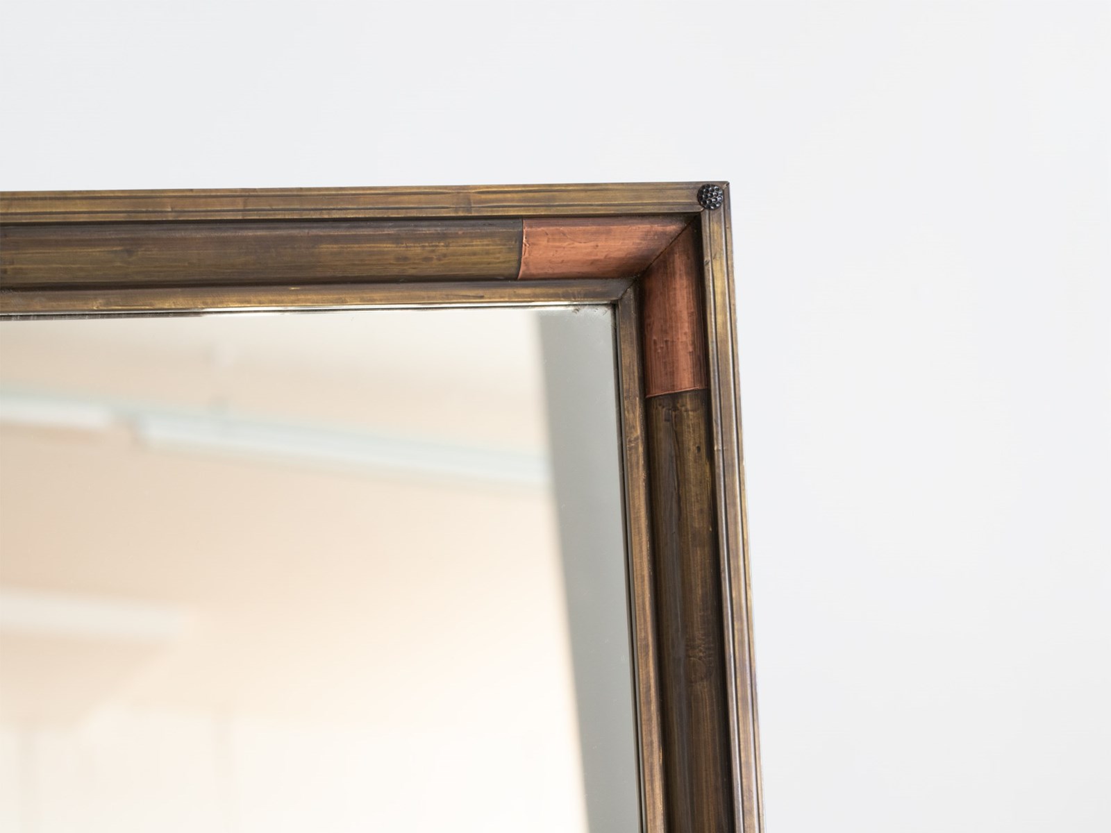 A patinated brass- and copper-clad mirror signed A. Passot. French, mid 20C.