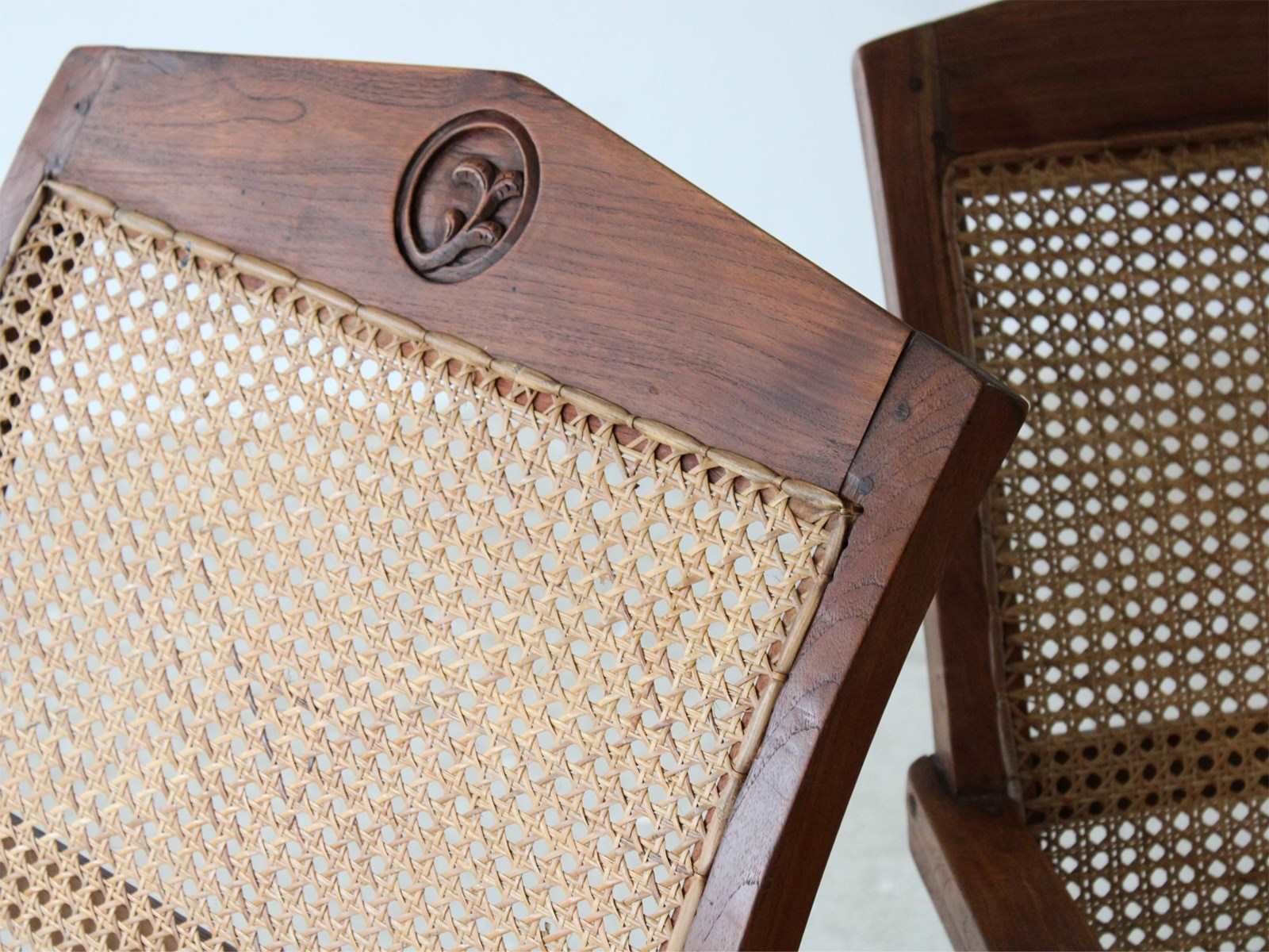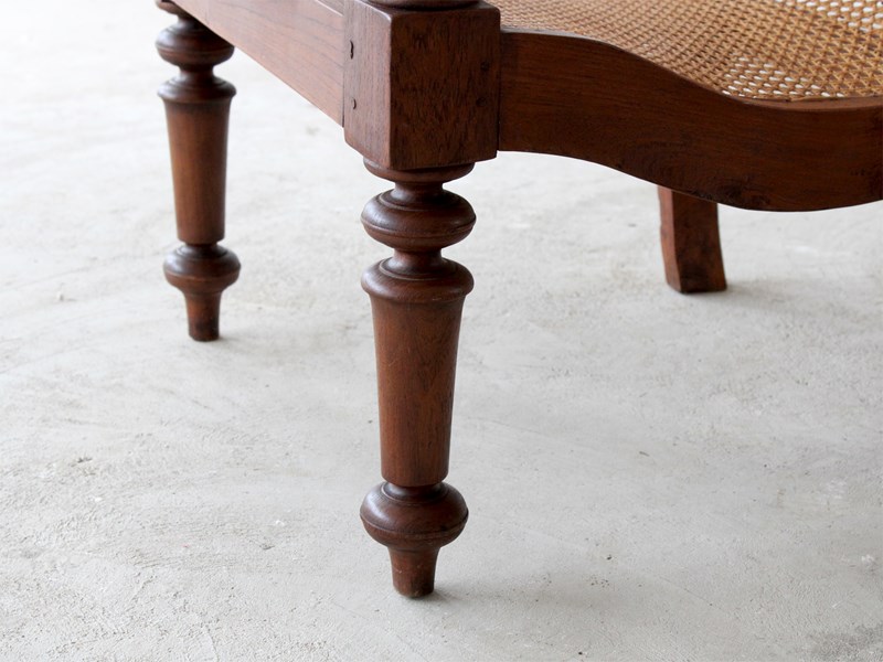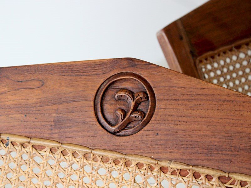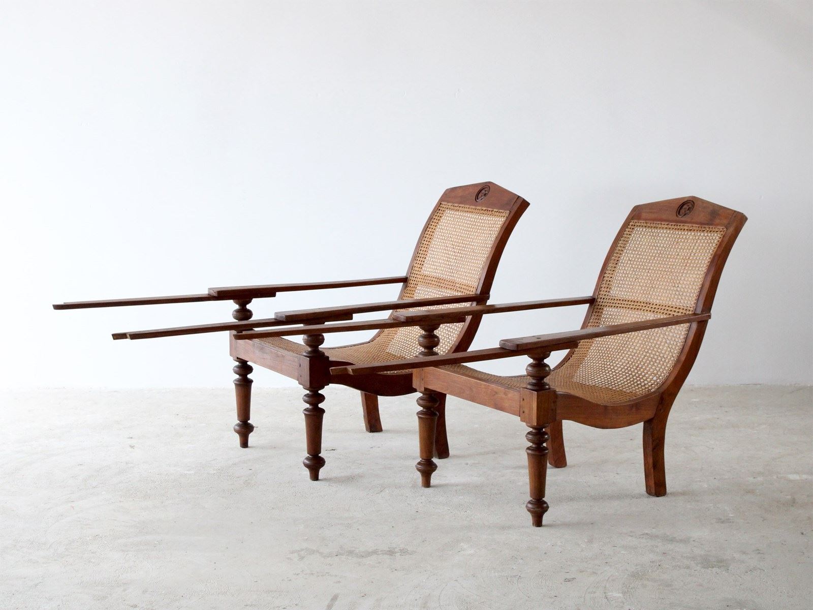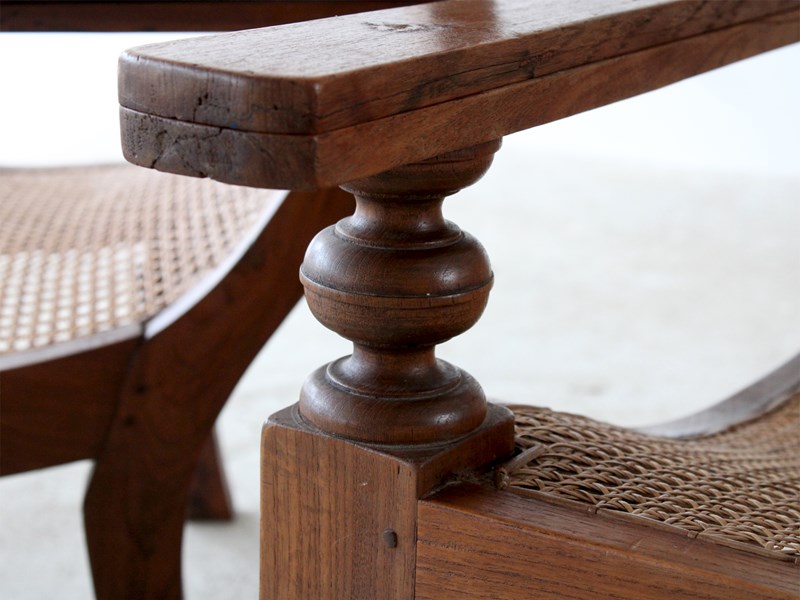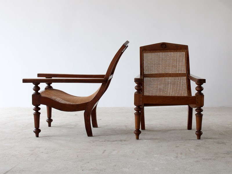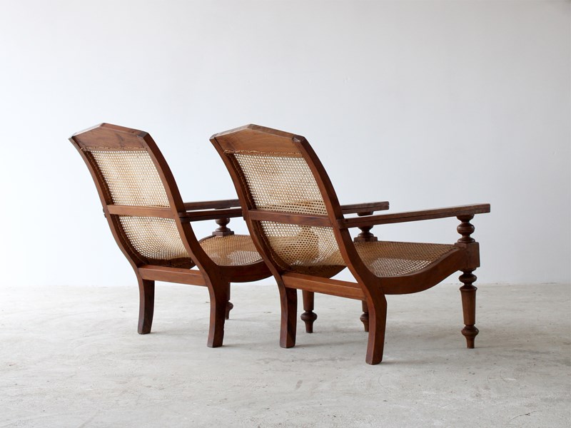 A pair of teak plantation chairs with caned seats, c. 1900.