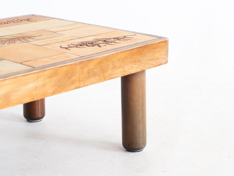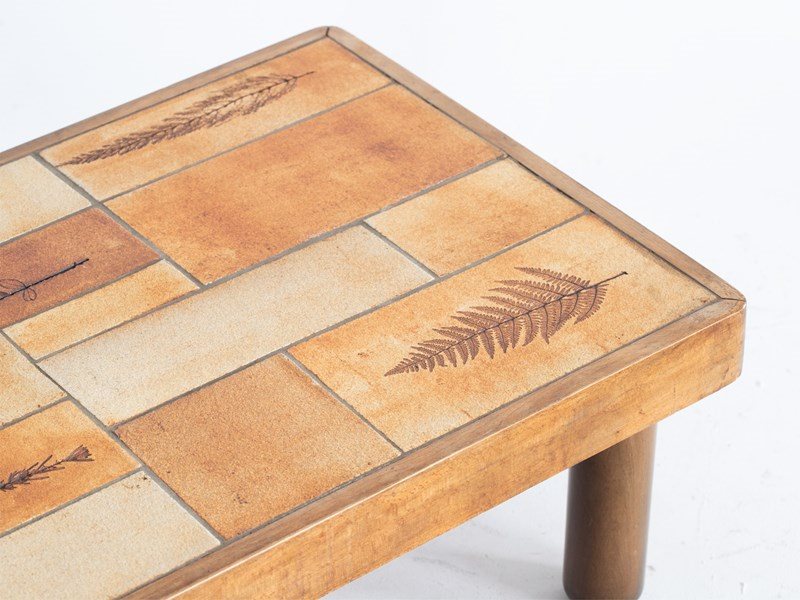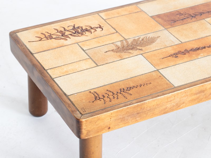 A Vallauris ceramic and beech coffee table with dried flowers pressed into the tiles. By Raymond Leduc, French, c. 1960s.