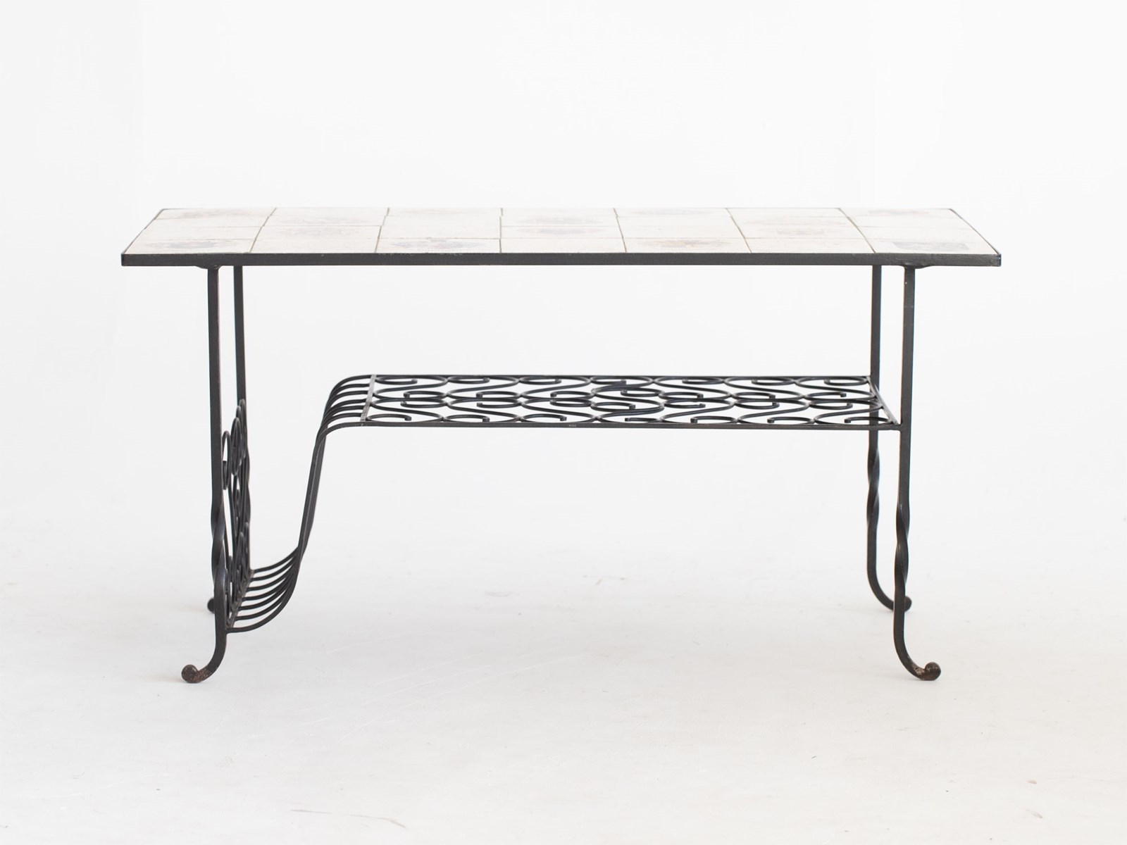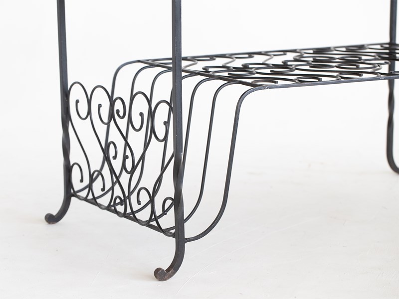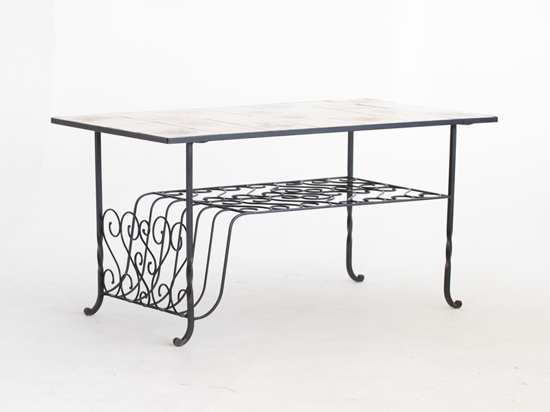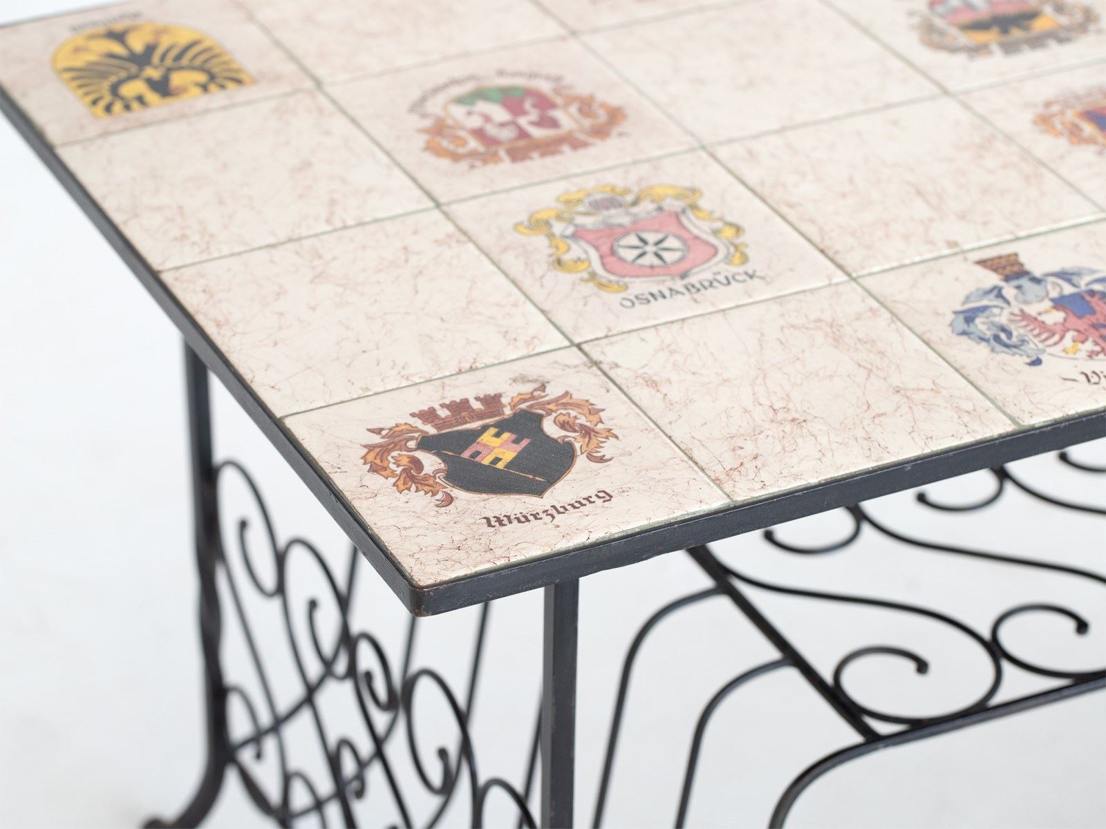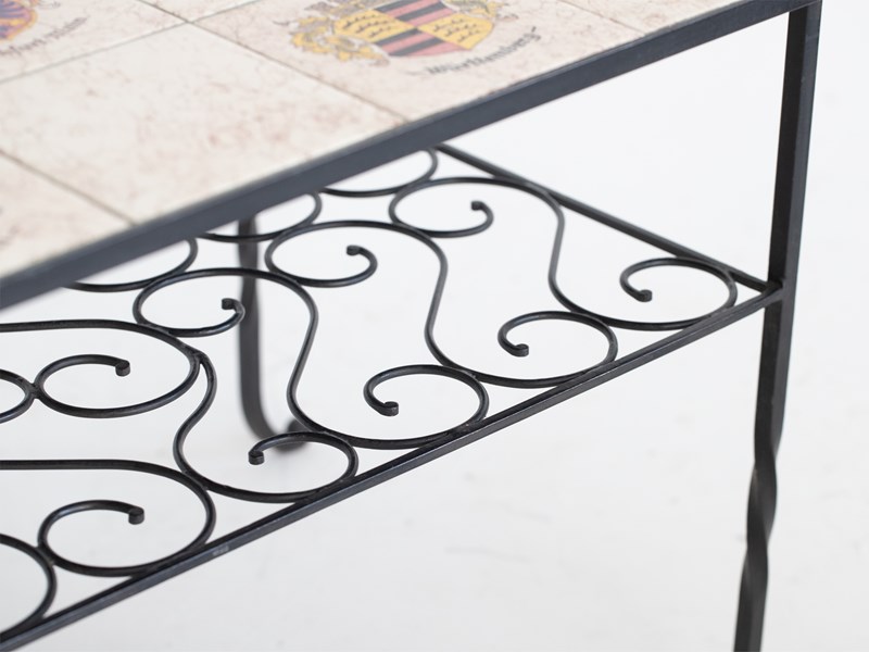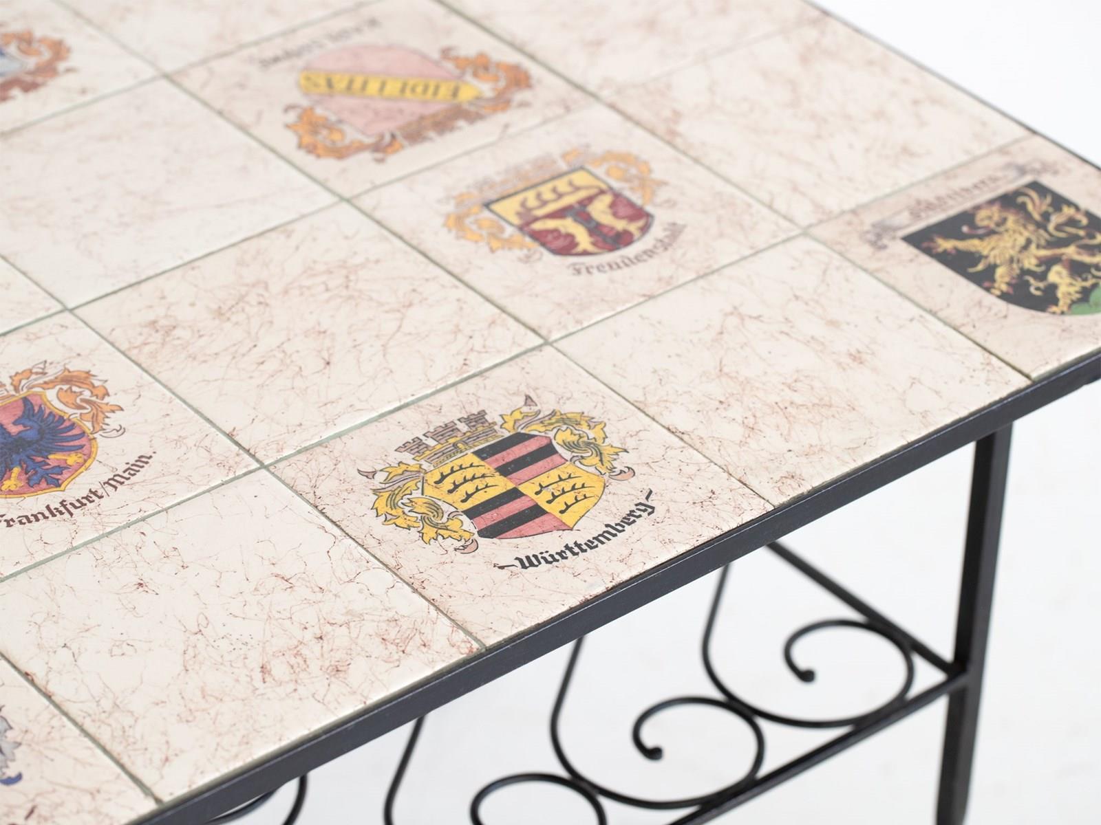 Marbleised tile-top with the coats of arms of 14 West German towns, raised on a tiered wrought iron base with integrated magazine rack.