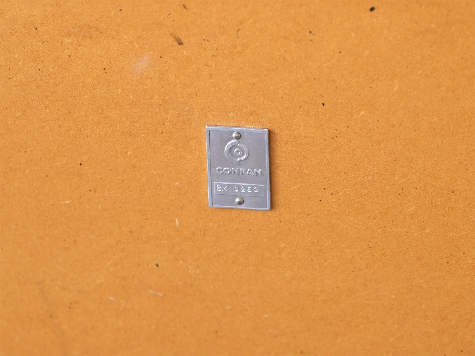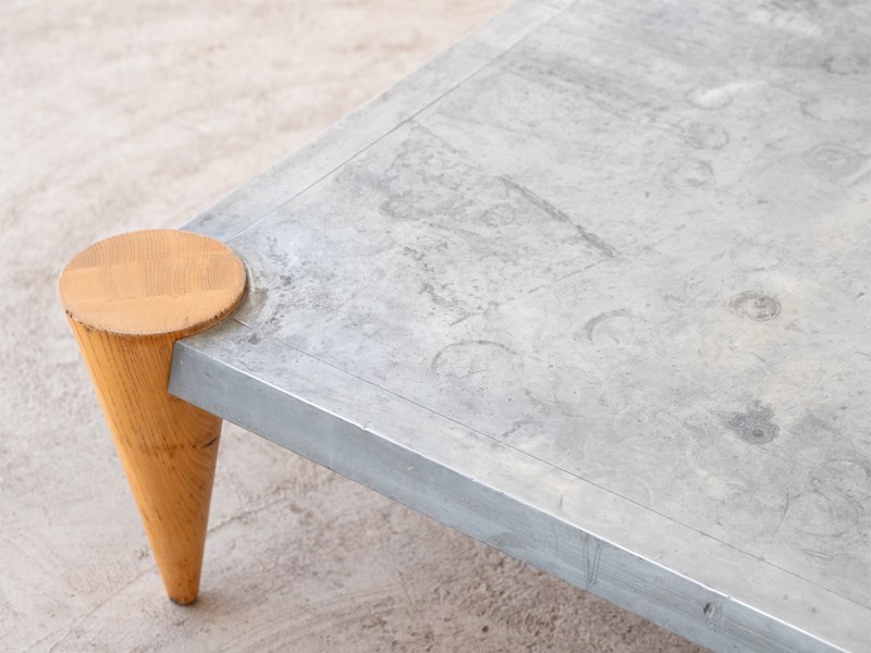 A postmodern zinc-clad coffee table raised on conical oak legs by Terence Conran. English, c. 1980s.