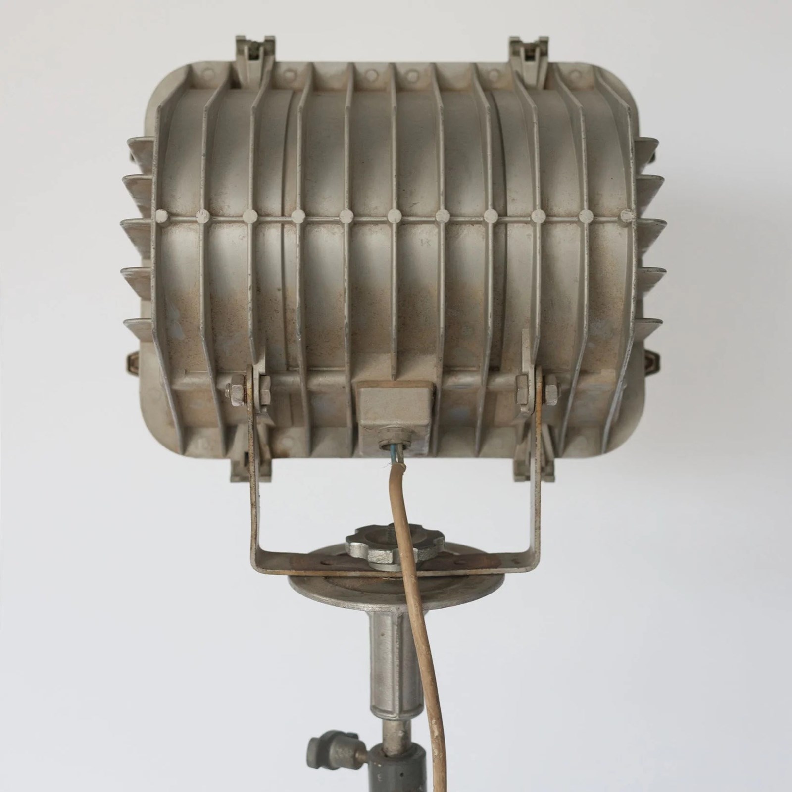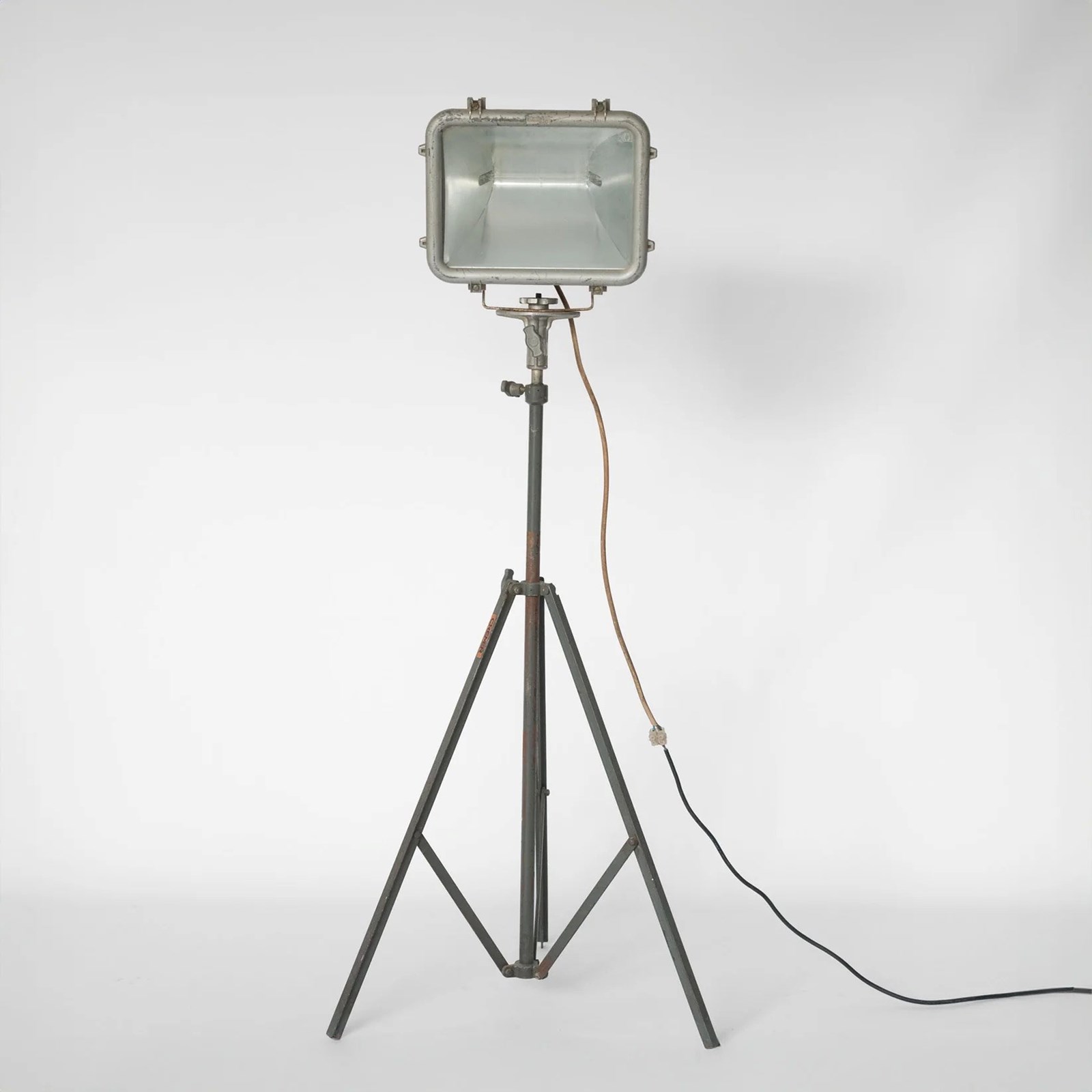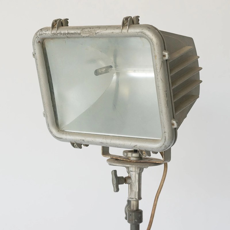 This 1950s industrial floor lamp features a robust metal spotlight head mounted on an adjustable tripod stand, exemplifying mid-century functional design. The rectangular housing, with its ribbed rear casing and thick glass front panel, reflects the utilitarian engineering of post-war industrial lighting, while the aged metal surface and visible hardware lend it an authentic workshop aesthetic. Subtle patina and light surface wear enhance its character, emphasizing its original purpose-built construction. The adjustable tilt mechanism and extendable stand introduce both sculptural presence and practical versatility, allowing the lamp to direct light with precision. Its restrained palette of muted greys and weathered steel underscores a clean, architectural silhouette that aligns seamlessly with modern, loft, or minimalist spaces. A distinctive statement piece, it offers both atmospheric illumination and strong decorative impact for refined contemporary settings.
