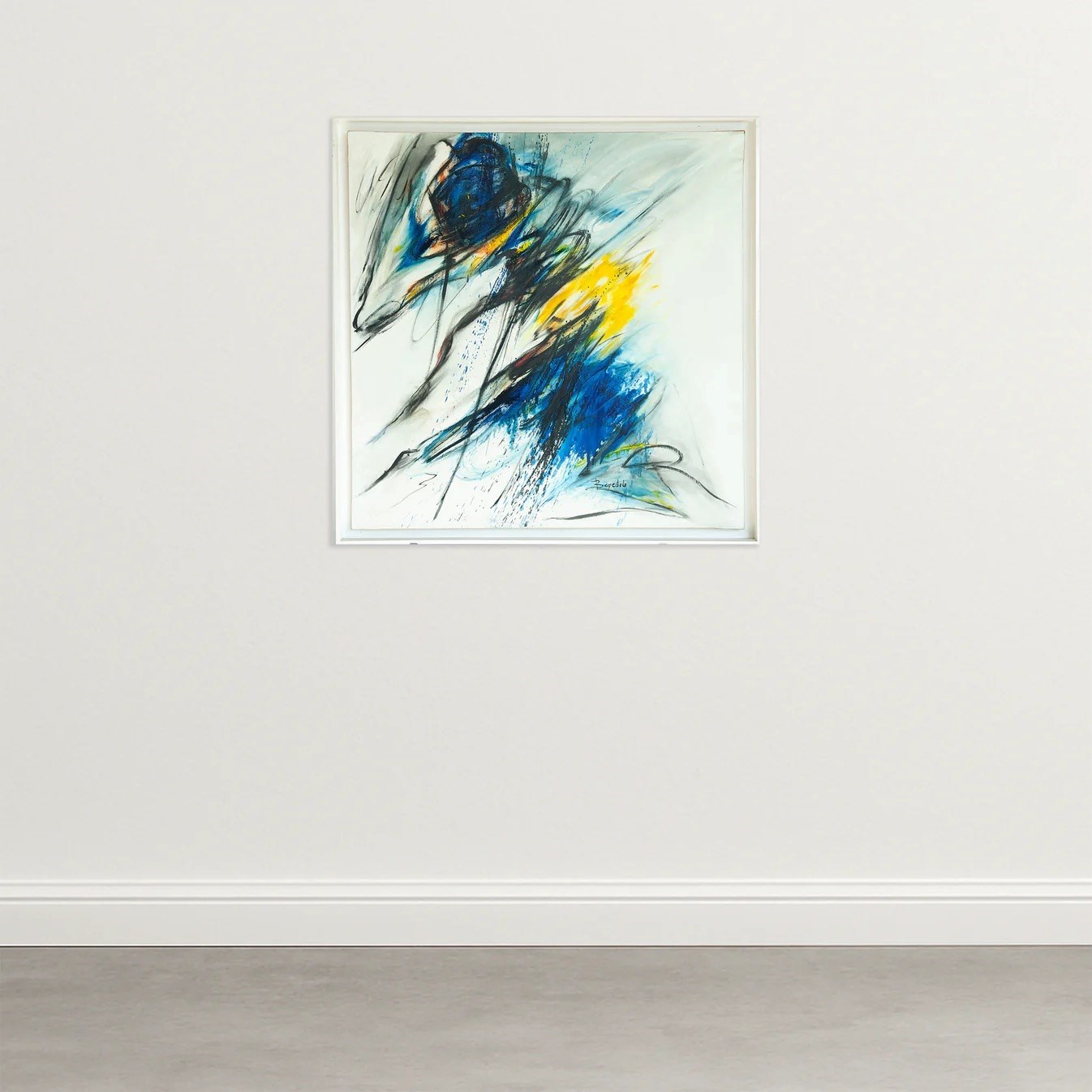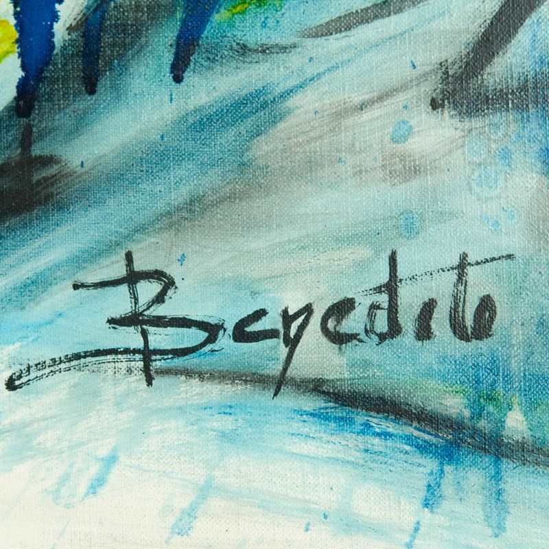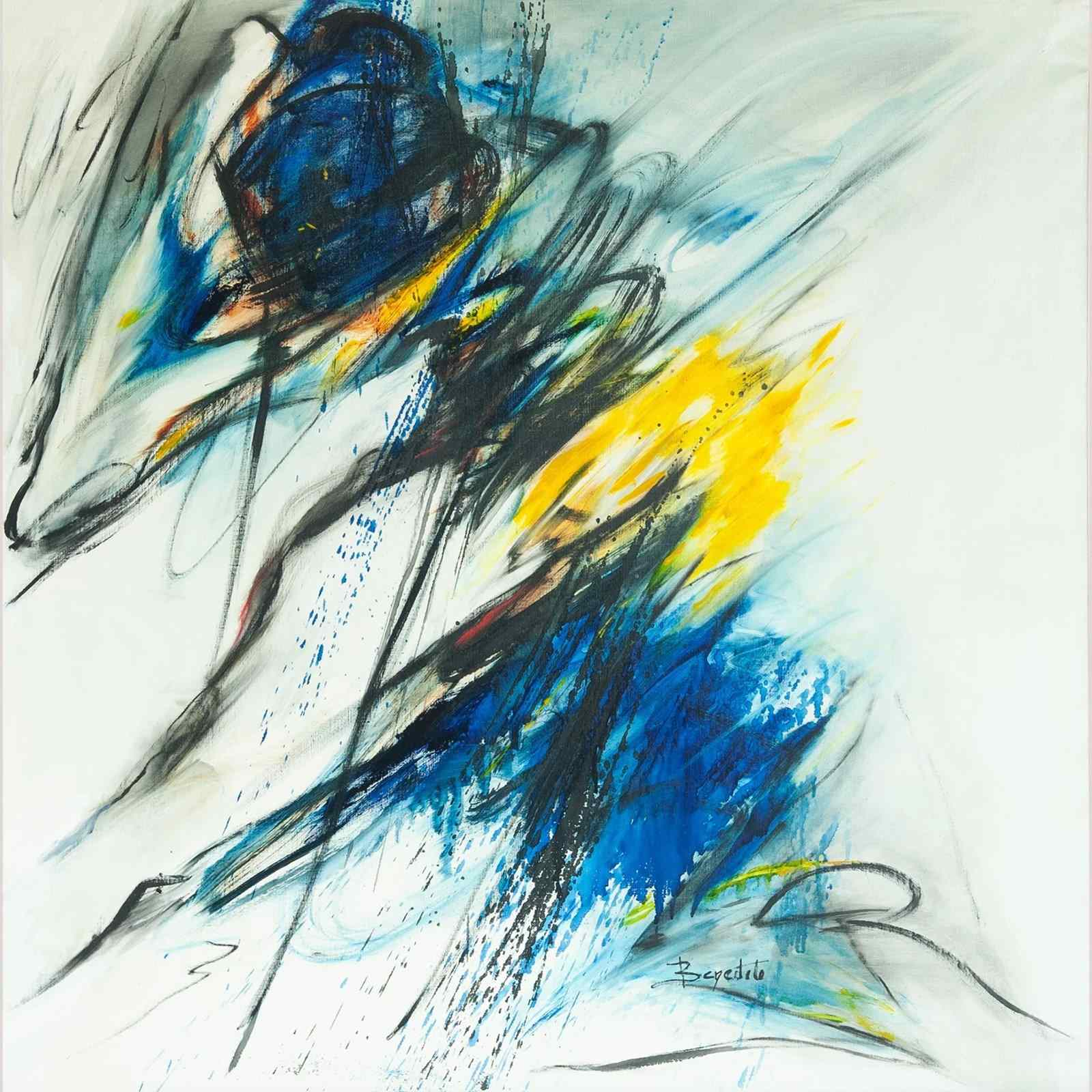 This expressive abstract composition by Concha Benedito (1936) captures the energetic and spontaneous force of postwar abstraction. The artist employs sweeping gestural strokes of deep cobalt, indigo, and electric blue, counterbalanced by radiant bursts of yellow and white that inject light and tension into the composition. The dynamic layering and free-flowing lines create a sense of movement and emotional intensity, while subtle tonal gradations suggest both depth and fluidity. Benedito’s confident handling of pigment and motion reflects a mature abstract language rooted in emotion and rhythm rather than representation. The work may allude to the pictorial relationship of energy and confrontation found in the movement of a bullfight — expressed here through pure form, velocity, and chromatic contrast. Both meditative and vigorous, this painting embodies the refined sensibility of lyrical abstraction and the raw vitality of gestural art.