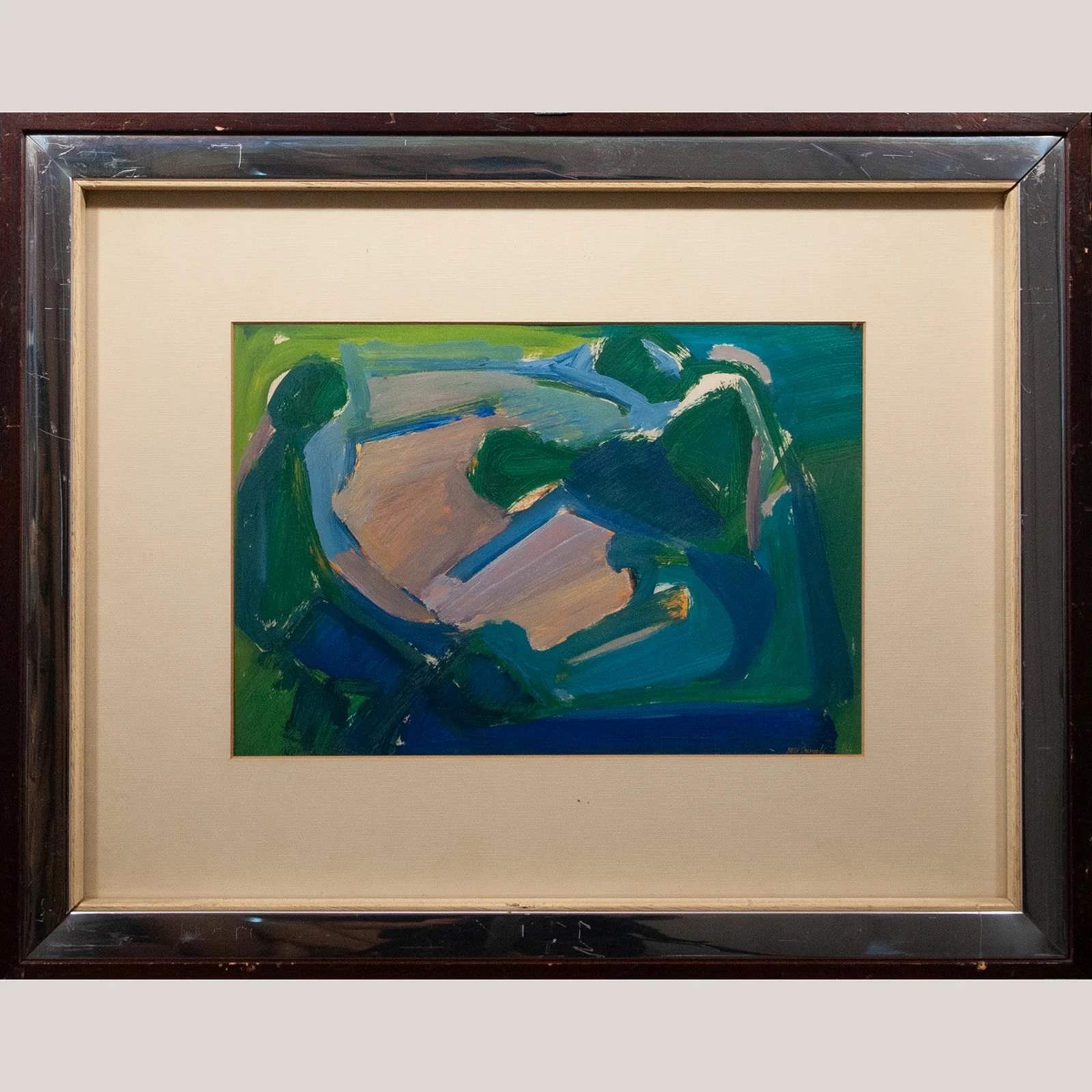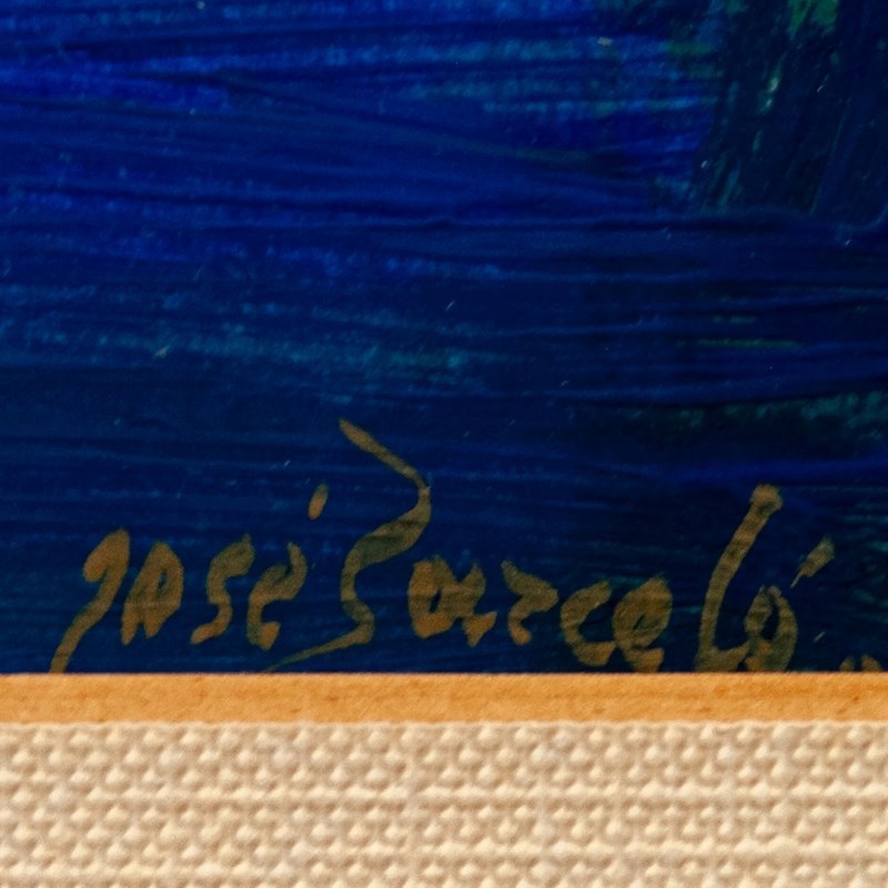 This acrylic work by José Barceló Albaladejo presents an abstract composition built through layered, gestural fields of blue, green, and muted ochre. The structure emerges from intersecting chromatic planes, creating balance between opacity and translucency across the surface. Broad directional strokes establish energy and movement, while softer blended passages introduce tonal harmony. Barceló Albaladejo’s approach reflects his late-20th-century exploration of colour relationships and spatial tension, favouring expressive mark-making over descriptive form. The interplay of cool and warm tones generates depth without relying on representation, aligning with the traditions of Spanish lyrical abstraction. The overall effect is a refined modernist statement with strong visual impact.