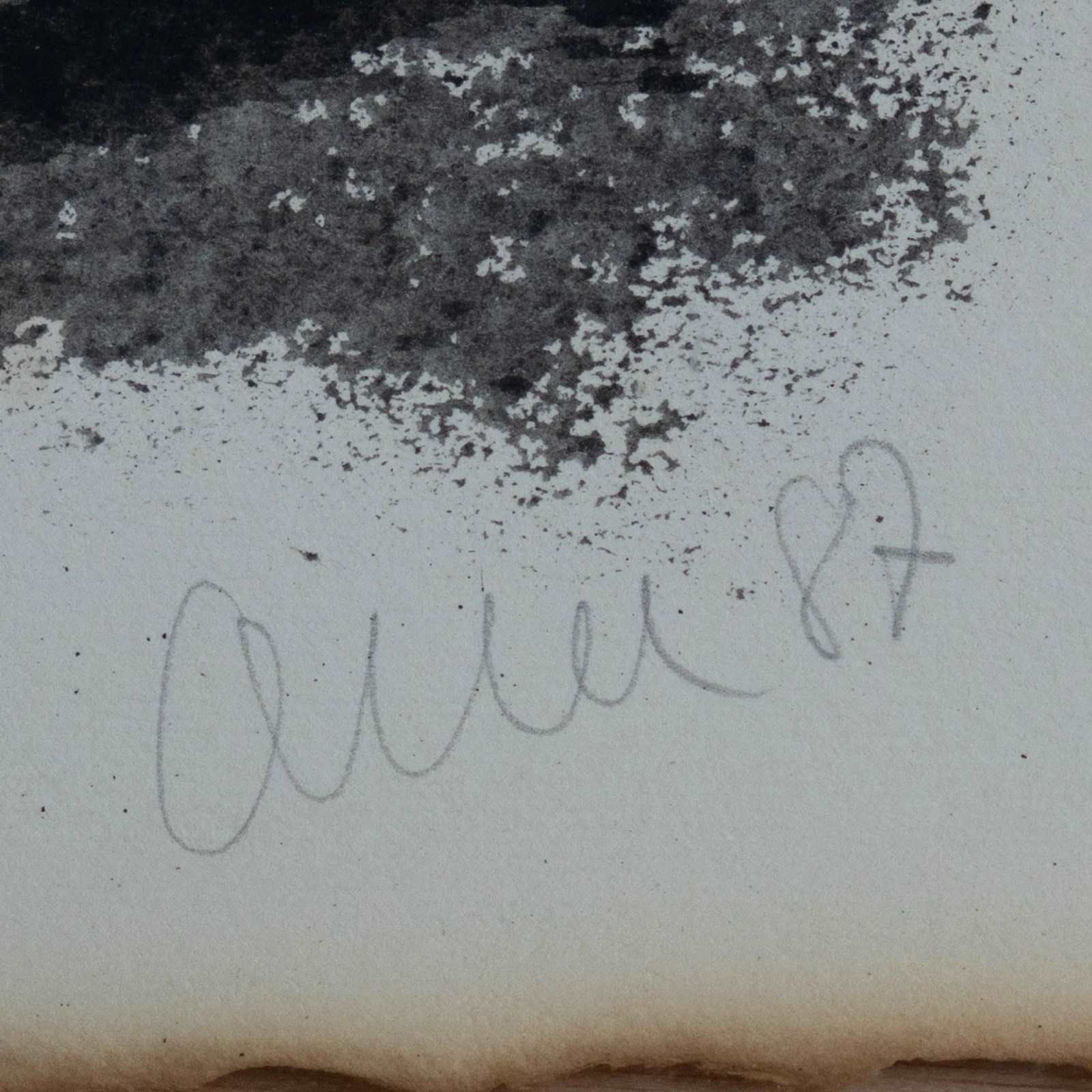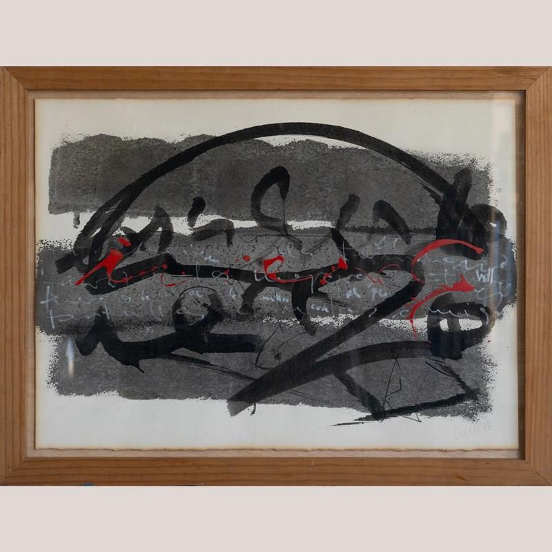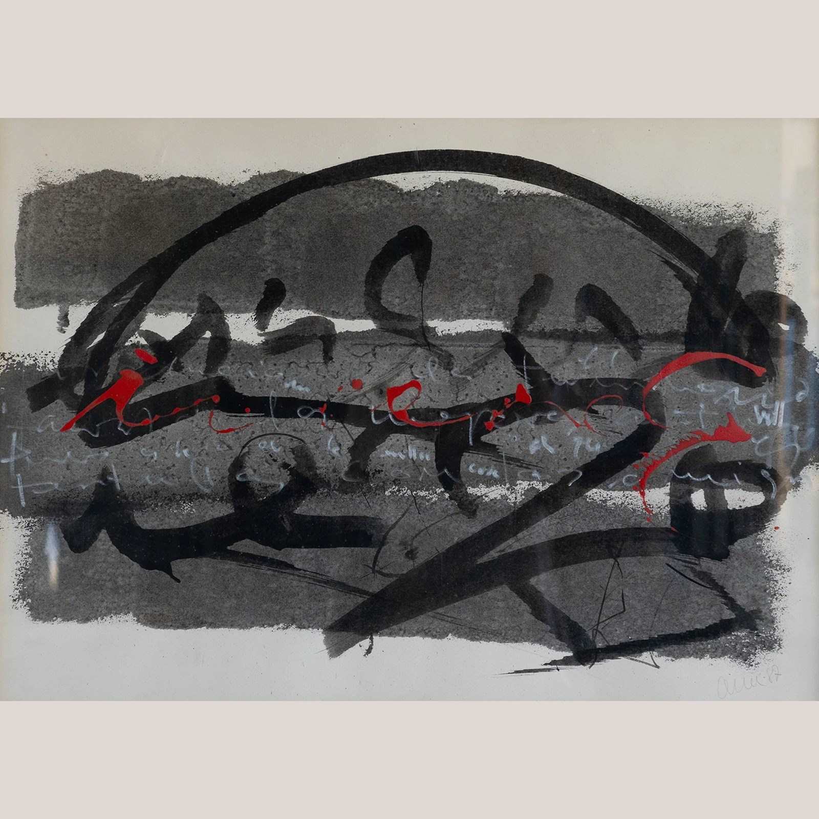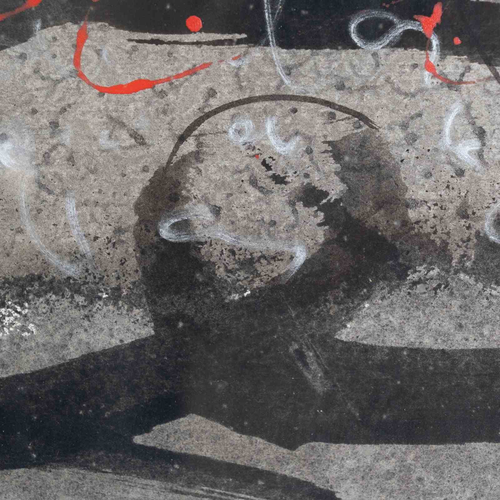 Created by Josep Güell in 1987 using mixed media on paper, this expressive abstract composition resonates with quiet intensity and layered emotion. Swathes of dark grey and black dominate the surface, forming a textured field where calligraphic strokes in white and urgent flashes of red create a sense of movement and hidden meaning. The rhythmic marks and arcing forms evoke a language both visual and poetic, while the delicate overlay of handwritten elements suggests a conversation between presence and absence. Güell’s refined sense of balance—between density and emptiness, gesture and silence—places the work within the lineage of lyrical abstraction and metaphysical expression. The palette is restrained yet commanding, offering an atmosphere of contemplative depth. This visually arresting piece carries emotional gravity and invites extended looking, adding a profound narrative undercurrent to modern environments.