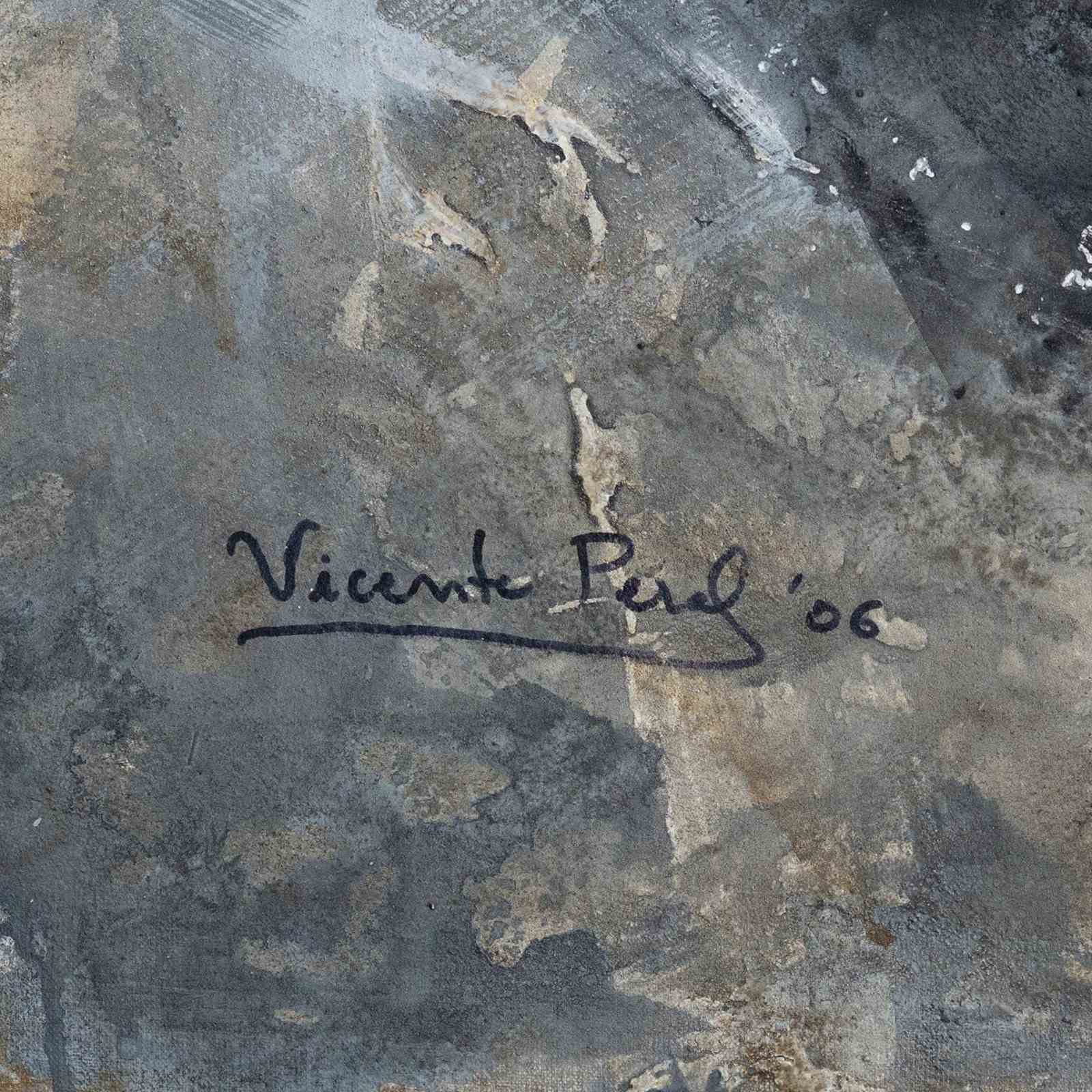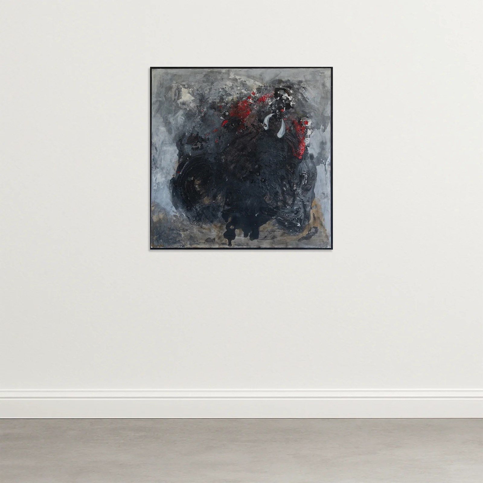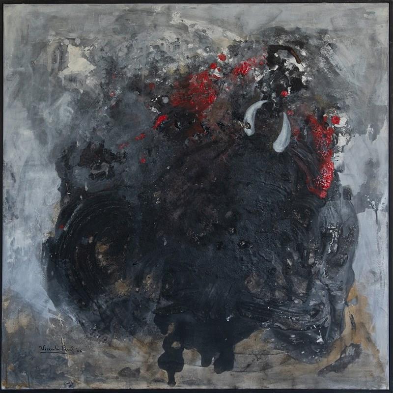 This powerful abstract composition, painted in 2006, captures a sense of primal energy and motion that may relate to the pictorial intensity of a bullfight. The artist employs a bold interplay of black, grey, and red, evoking the clash of strength and vitality characteristic of that symbolic Spanish spectacle. Thick impasto and gestural brushwork convey a visceral energy, while the layered greys and sweeping black forms suggest both chaos and structure. The vivid crimson accents break through the darker masses like flashes of movement and emotion, emphasizing drama and tension. Executed with striking textural depth and painterly vigor, the work reflects the expressive physicality of postwar abstraction. With its balance of violence and elegance, it evokes both the brutality and beauty of raw instinct captured in artistic form.
