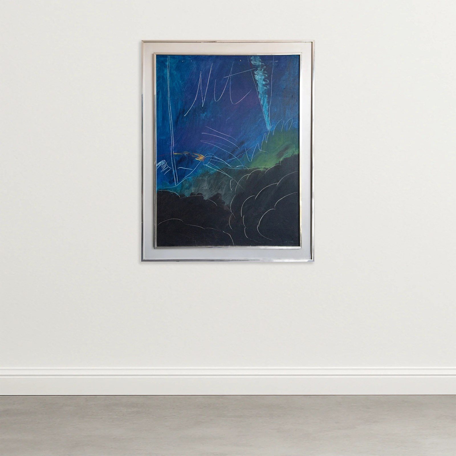This signed mixed-media abstract composition presents a deep, atmospheric field of shifting blues, greens, and blacks enlivened by fine linear gestures drawn across the surface. The artist constructs the scene through layered, expressive brushwork, building a sense of depth and movement within a nocturnal palette. Sweeping white lines cut through the darker tones, while subtle accents of yellow and red introduce a controlled luminosity that animates the centre of the arrangement. The balance between opaque painted passages and freely inscribed marks suggests an interest in gesture, spatial ambiguity, and controlled improvisation. The work aligns with late 20th-century abstraction where drawing and painting converge, and colour fields are used as active environments for graphic intervention. The overall result is a dynamic yet contemplative composition suited to refined contemporary settings.