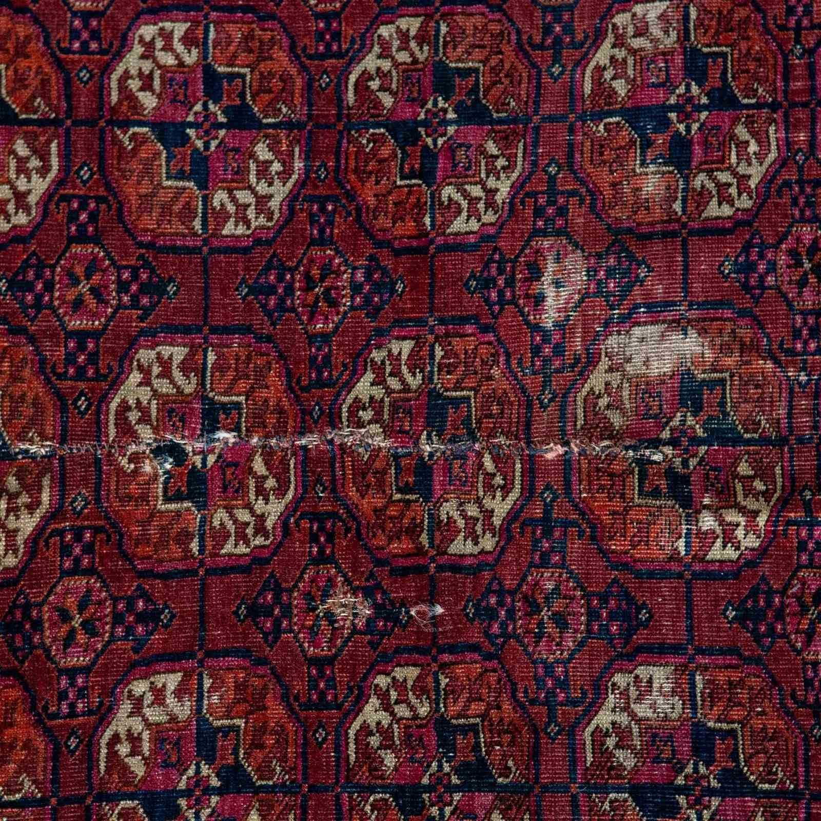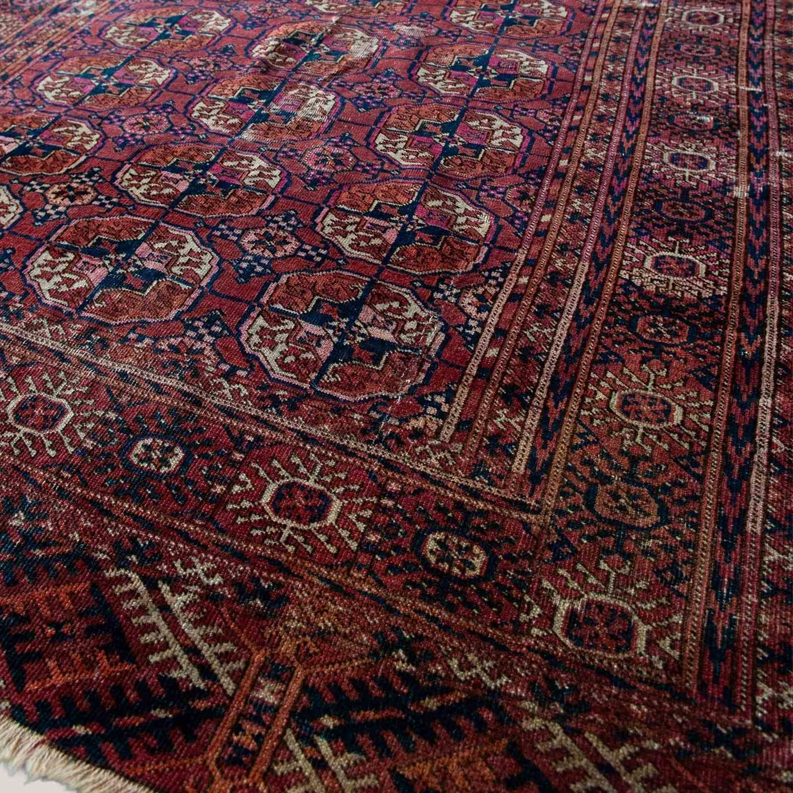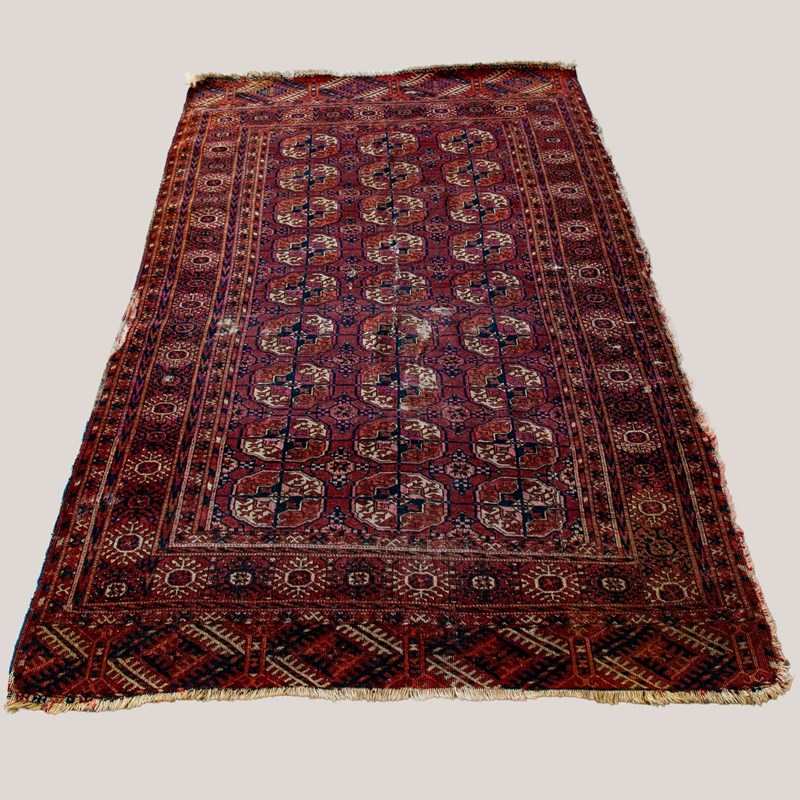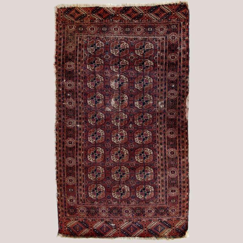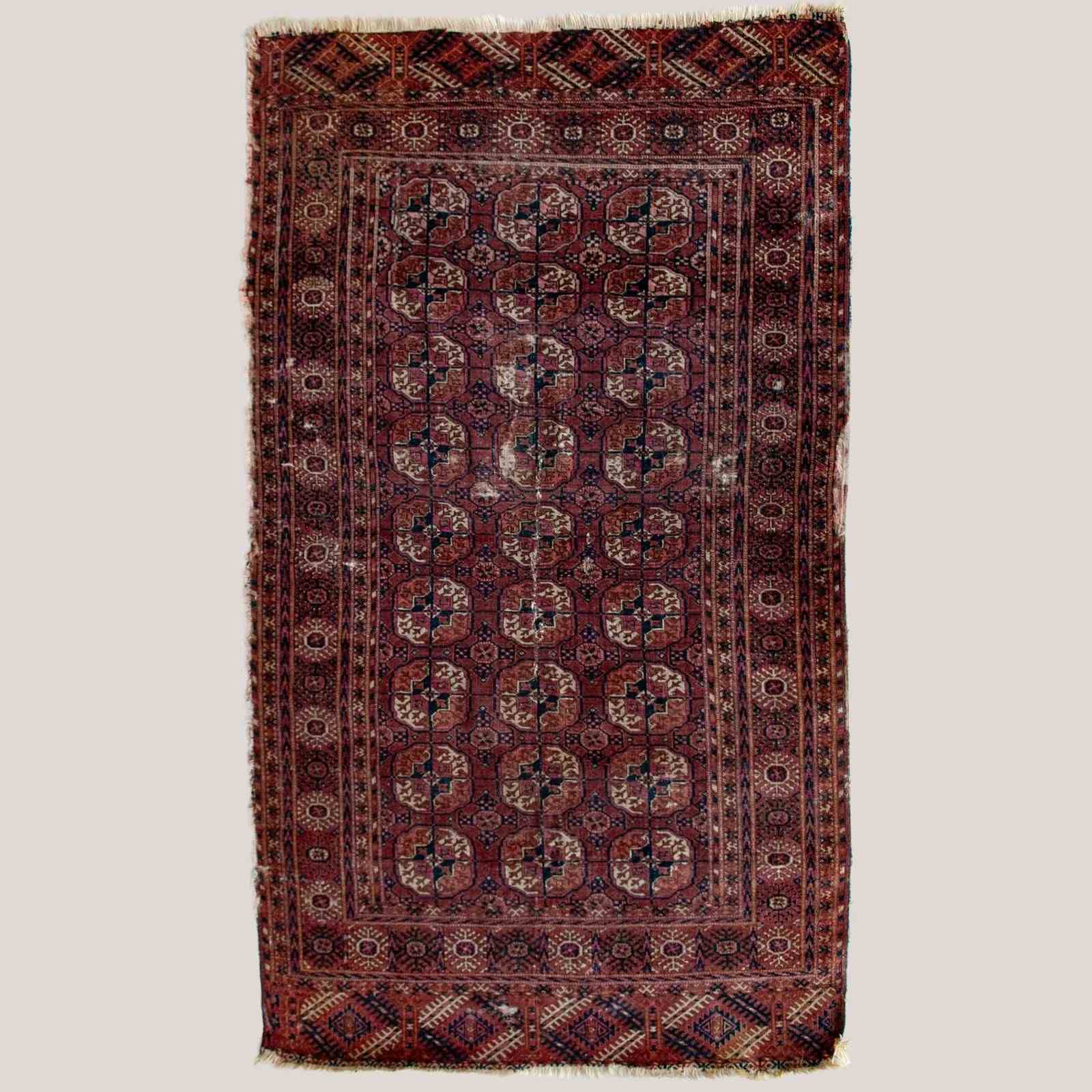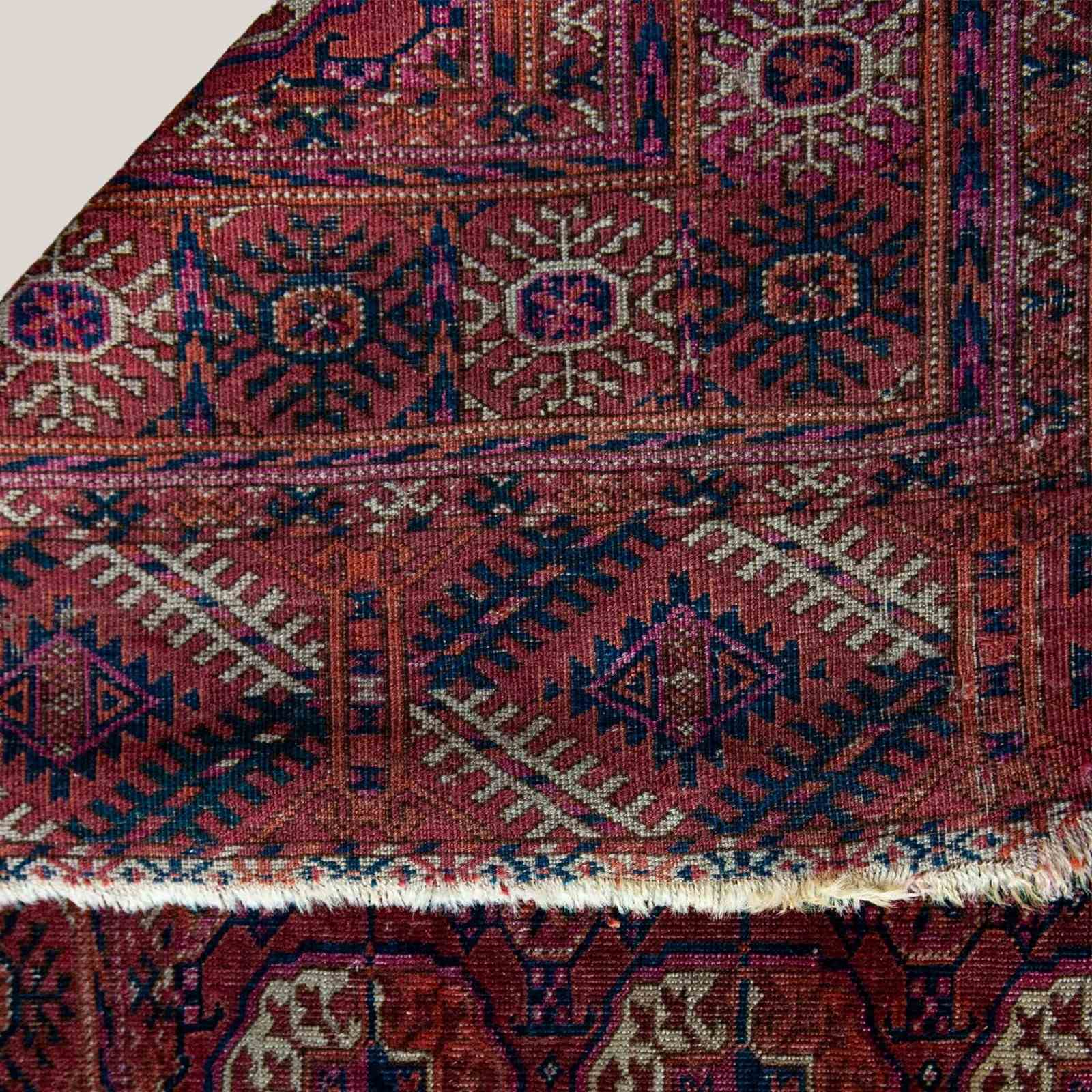 This finely knotted wool rug presents a classic Ersari-Beshir design from the Turkmen weaving tradition, characterised by its elongated octagonal guls arranged in disciplined vertical rows. The deep madder-red ground is complemented by indigo, walnut brown, ivory, and rose tones, producing a palette typical of 19th-century Central Asian nomadic work. The motifs show the hallmarks of Beshir workshops: angular leaf forms, stepped floral devices, and repeated secondary guls outlined in midnight blue. The borders feature a chain of sunburst medallions and geometric guard stripes, giving the piece a balanced architectural frame. The tight asymmetric knotting and soft, aged handle indicate an earlier weave, while visible wear reflects long traditional use. This example sits firmly within the classical Turkmen aesthetic, appealing to those drawn to historical textile craftsmanship, rich patination, and tribal geometry.