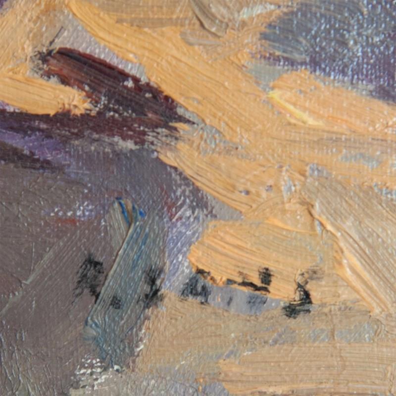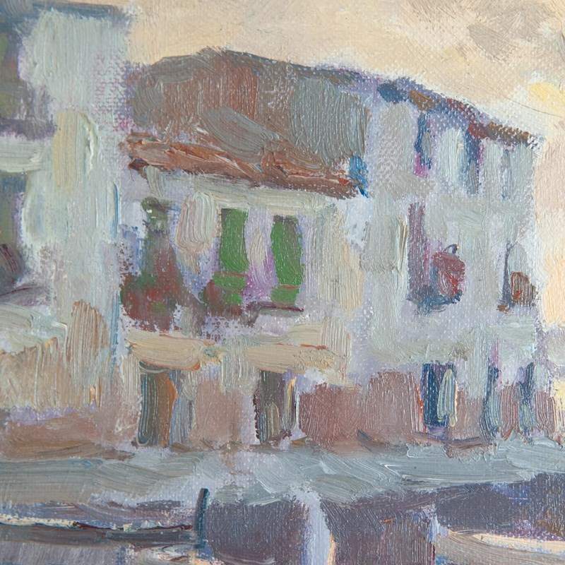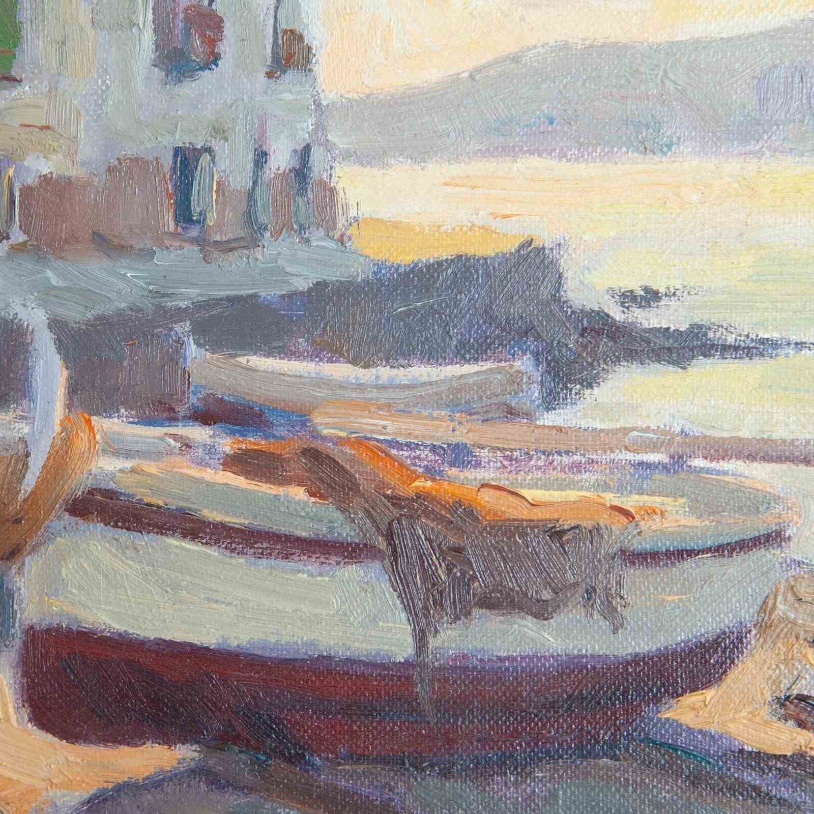 This evocative coastal scene, signed R. Sans, portrays a tranquil Mediterranean morning or evening along the Catalan coastline. Painted in oil on canvas, the composition captures moored fishing boats resting on sunlit sands before whitewashed seaside houses, their facades reflecting the soft hues of the setting or rising sun. The artist’s loose, impressionistic brushwork conveys shimmering light and atmosphere rather than strict realism, blending gentle tones of ochre, lilac, and pearl grey to suggest the fleeting effects of dawn or dusk. The use of thick impasto and expressive texture imbues the work with immediacy and warmth, evoking the spirit of plein-air painting. The overall harmony of light and color reflects a lyrical interpretation of coastal life in Catalonia, reminiscent of the golden age of Spanish Impressionism, when painters sought to capture the Mediterranean’s luminous beauty