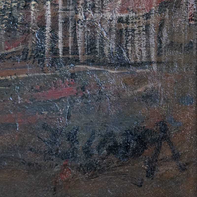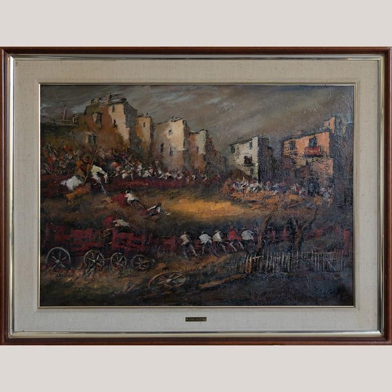Juan Escoda Corominas presents a powerful oil on canvas composition depicting a bullring scene charged with movement and collective intensity. The painting captures the spectacle unfolding against an urban backdrop of compacted buildings beneath a dramatic, unsettled sky. Executed with expressive, textured brushwork, the surface is built from layered strokes that dissolve detail in favor of atmosphere and momentum. A restrained yet forceful palette of ochres, deep reds, earthy browns, and muted blues reinforces the emotional gravity of the scene, while passages of light cut through the darker tonal field to guide the viewer’s eye. The composition prioritizes rhythm and mass over individual figures, evoking the visceral energy of public ritual rather than literal narration. Rooted in mid-20th-century Spanish figurative expression, the work reflects a painterly approach concerned with social experience, tradition, and emotional resonance, distilled into a compact and visually concentrated format.