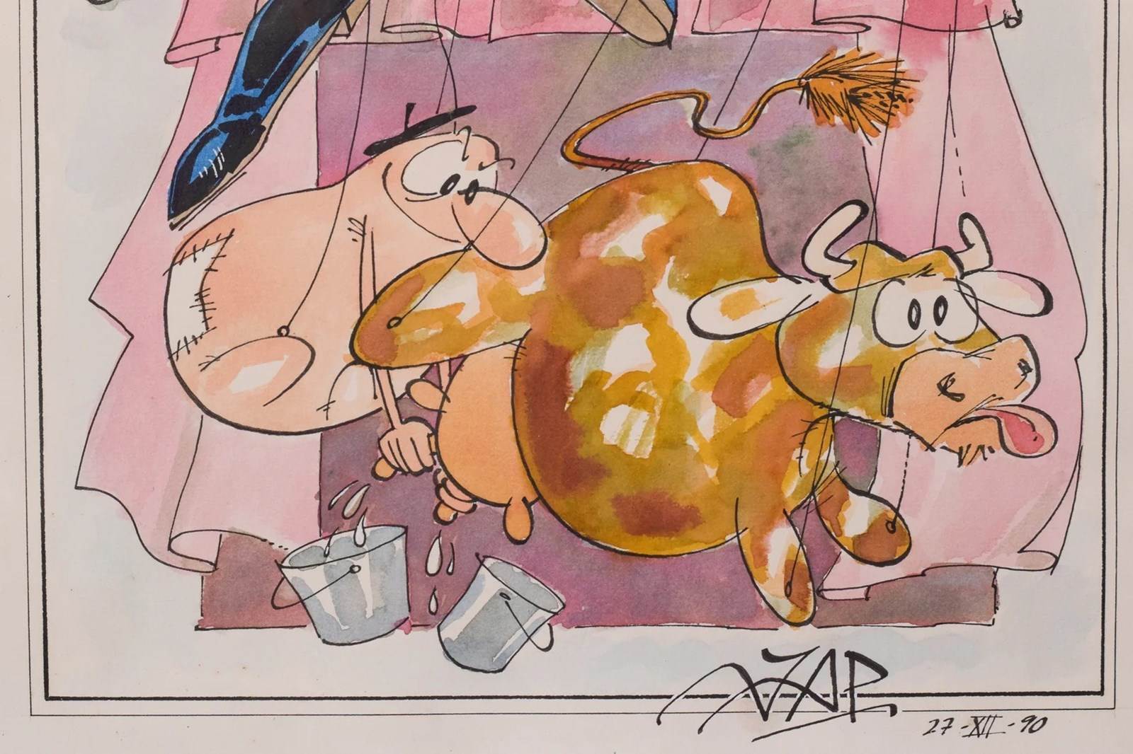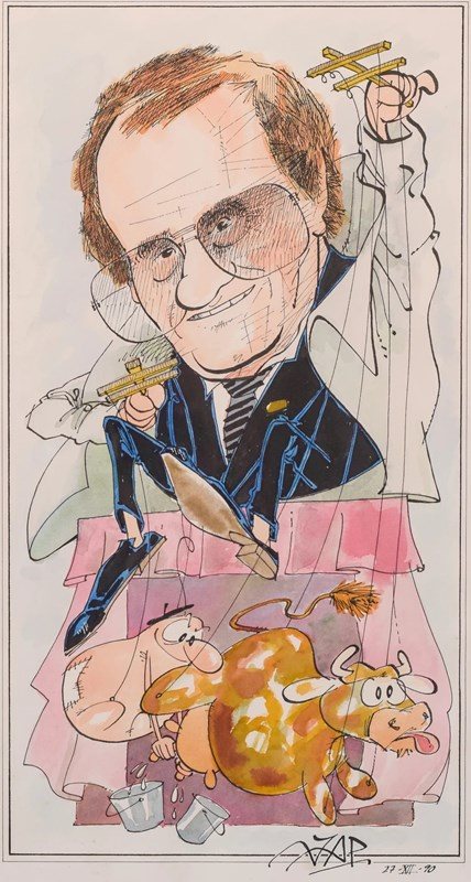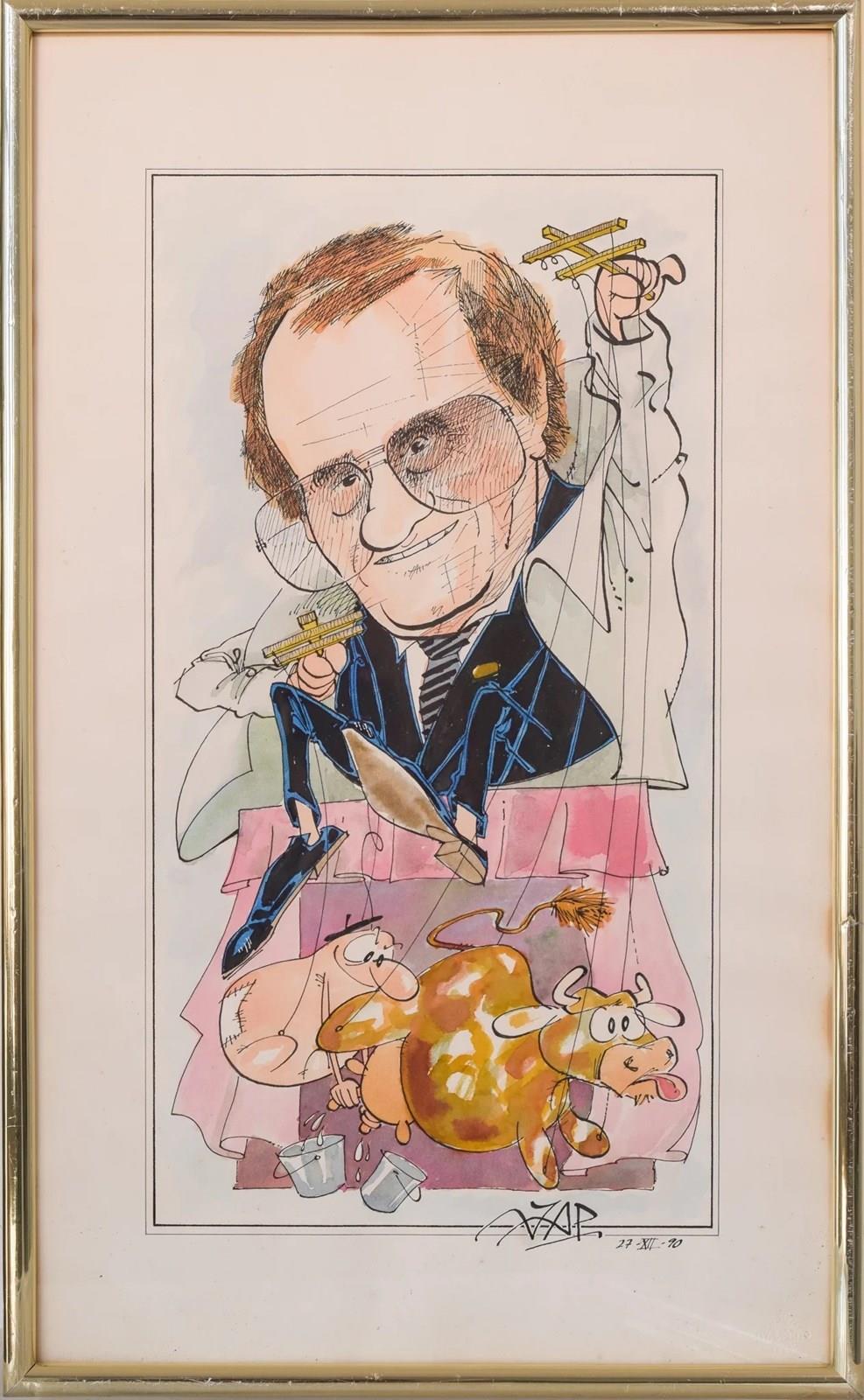 A humorous and playful image, this unique caricature shows a puppet master controlling his puppets of a man milking a cow. Filled with symbolism and meaning, this whimsical piece was originally a gift for an admired friend.