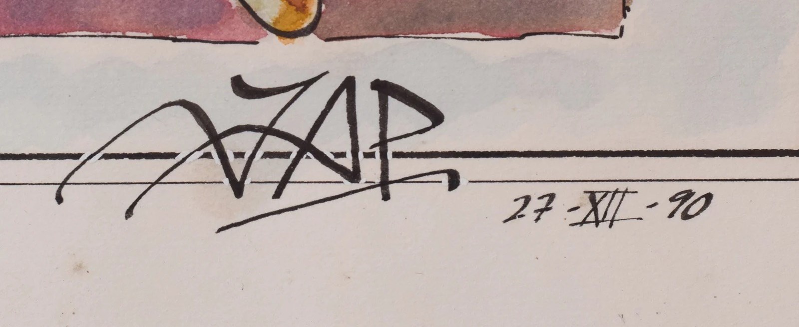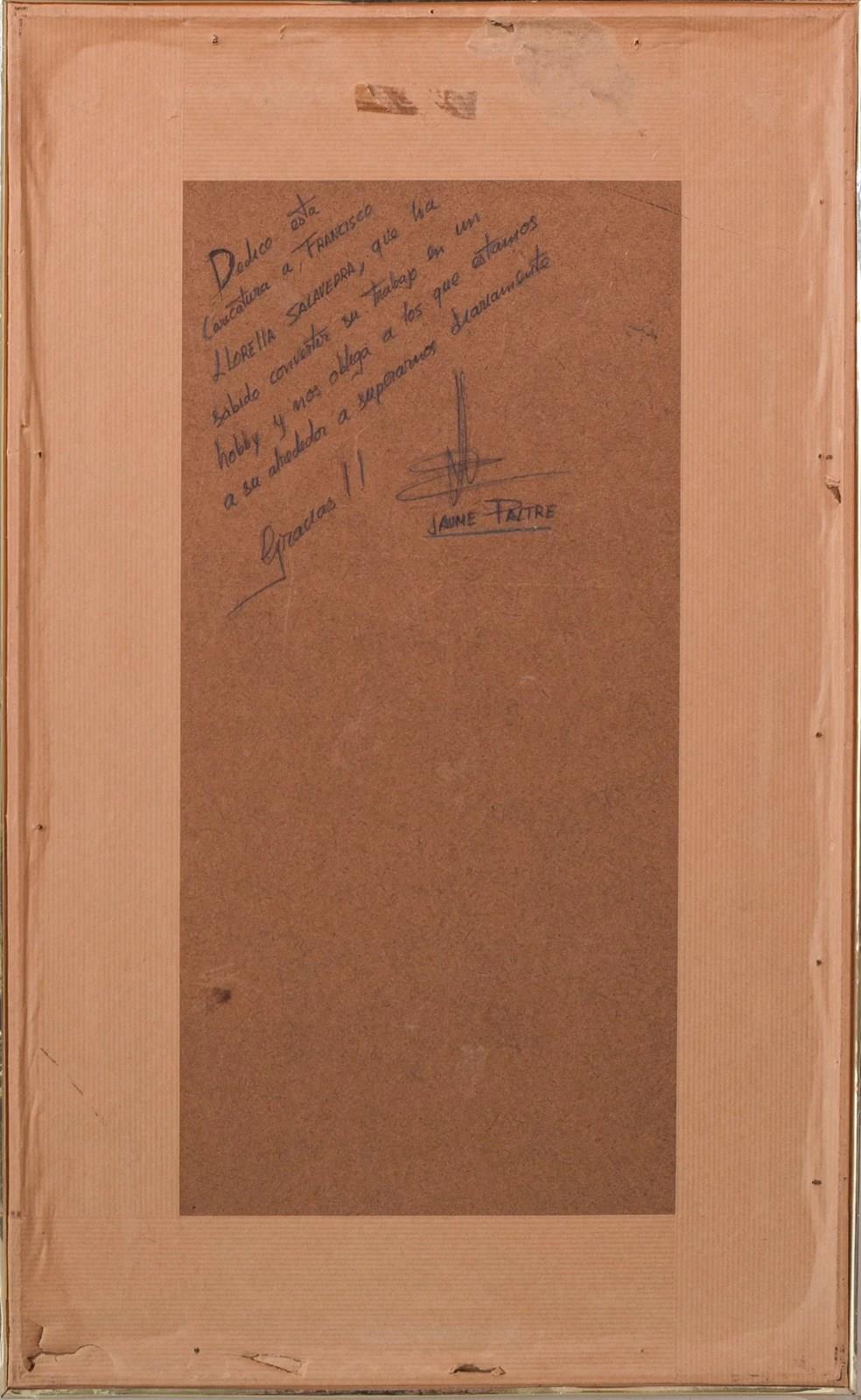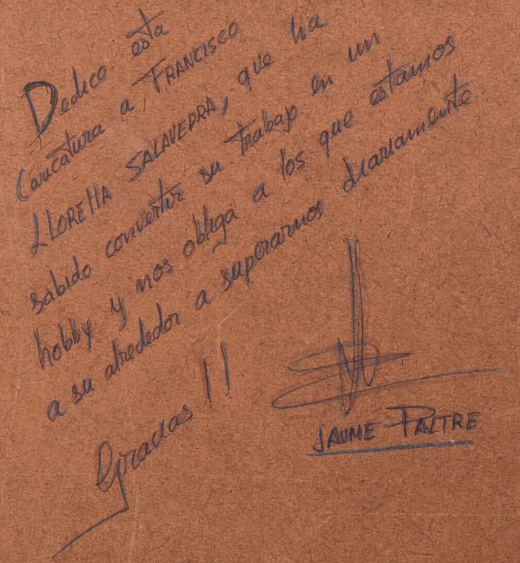Signed on reverse [in Spanish] 'Dedico esta caricatura a Francisco Llorella Salavedra, que ha sabido convertir su trabajo en un hobby y nos obliga a los que estamos a su alrededor a superamos diariamente. Gracias!! Jaume Paltre'