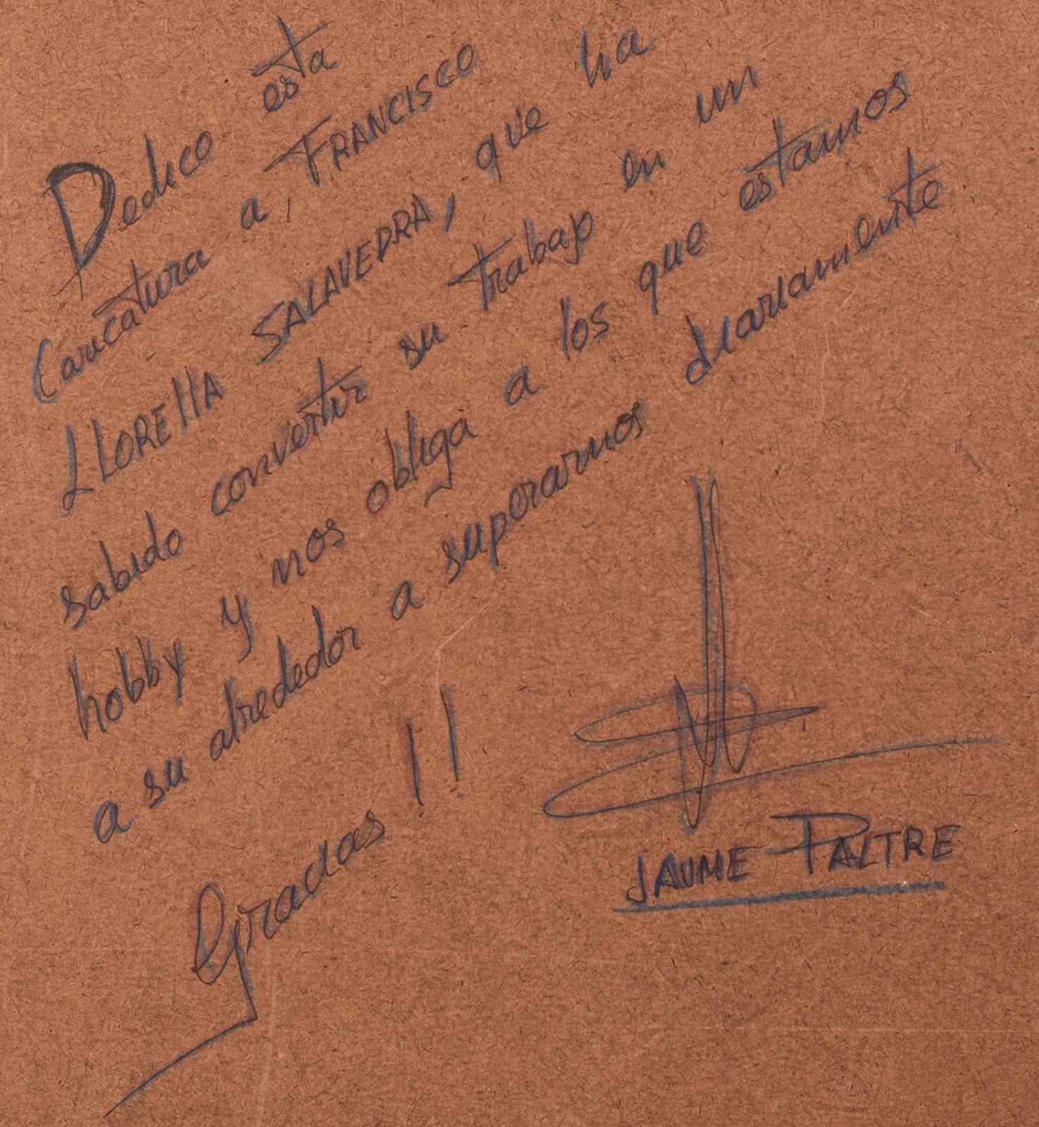 Translation: 'I dedicate this caricature to Francisco Llorella Salavedra, who has been able to turn his work into a hobby and forces those of us around him to overcome daily. Thank you!! - Jaume Paltre'