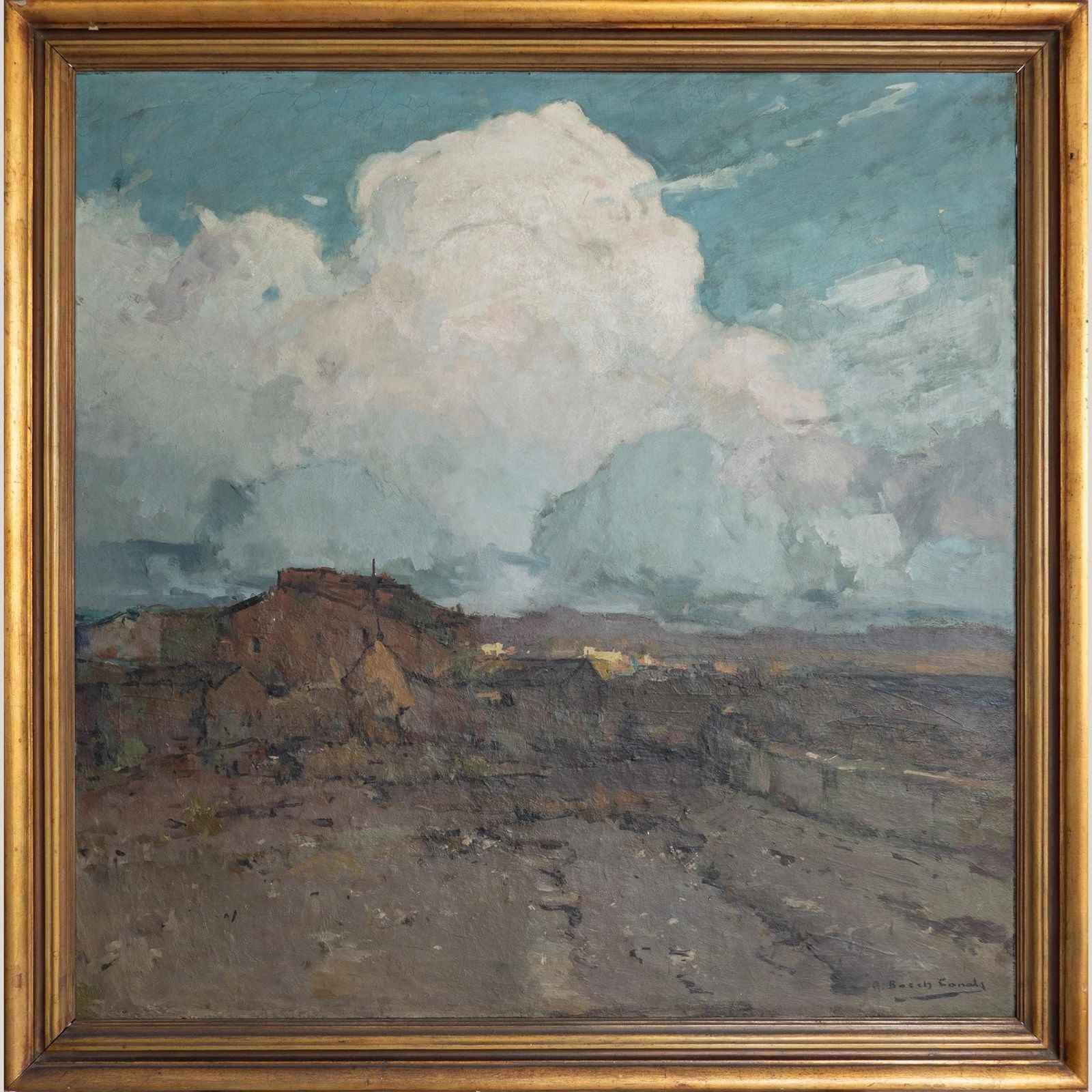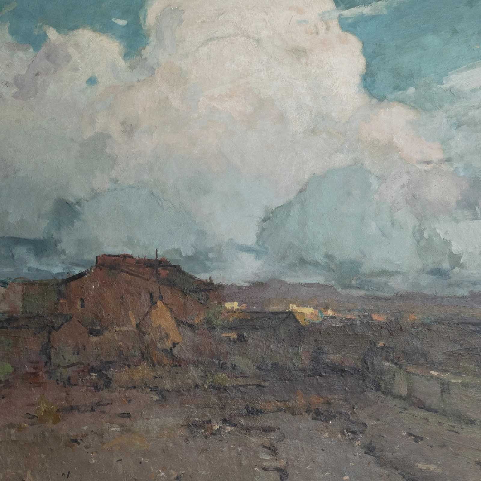 A dramatic rural landscape beneath a vast cloud-filled sky, likely depicting a village scene in Catalonia. Earthy tones and dynamic brushwork evoke a sense of stillness and solitude.
