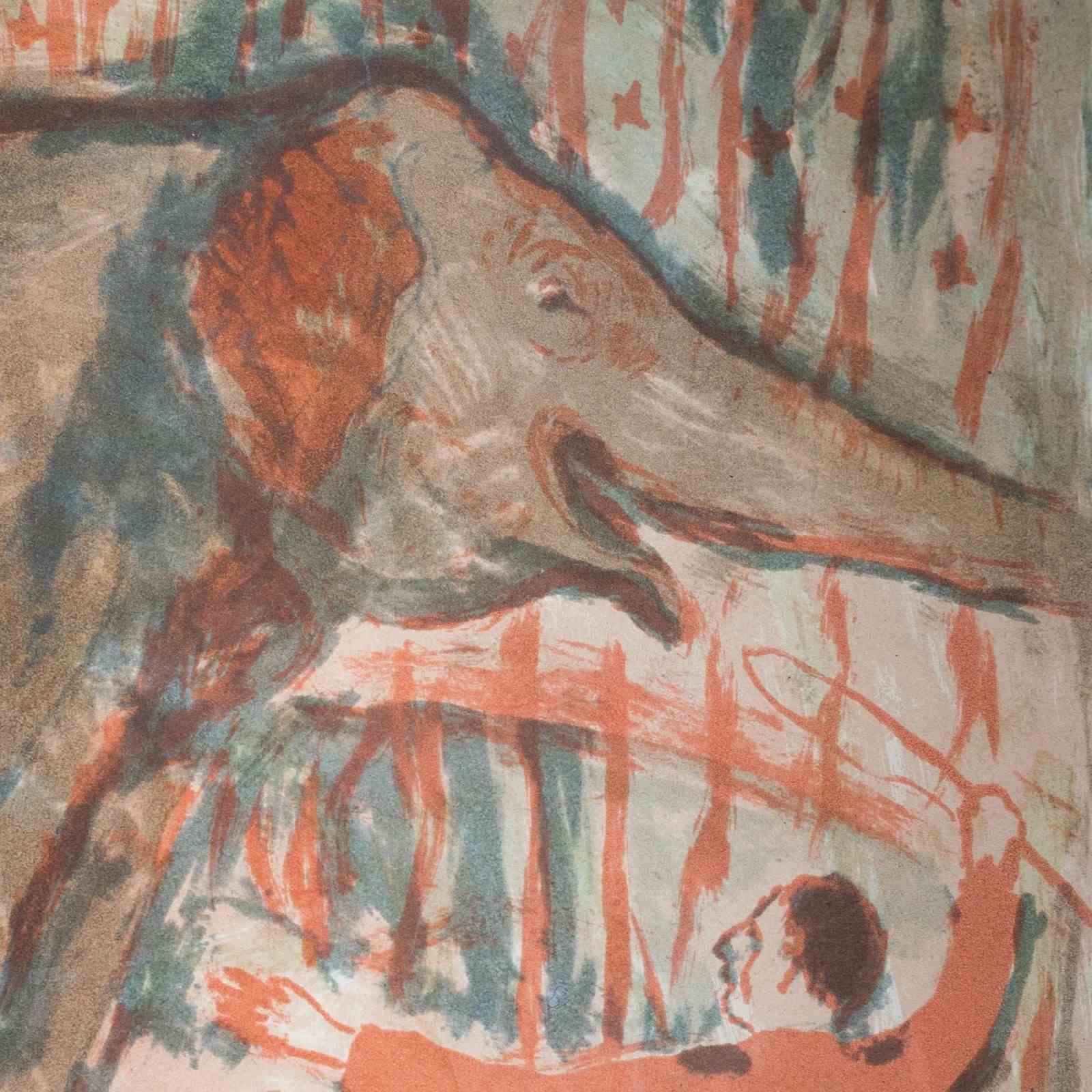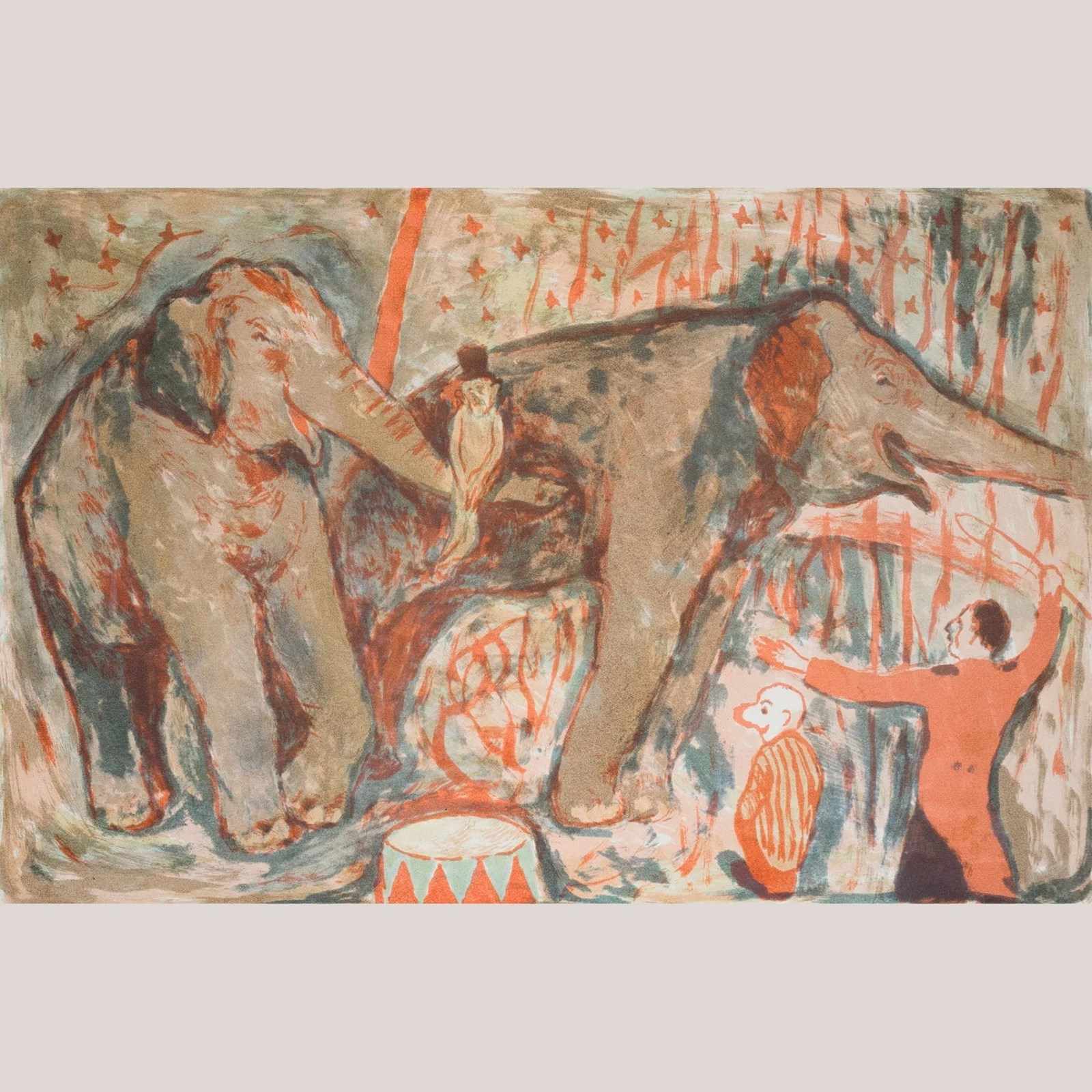 This original signed and numbered lithograph depicts a lively circus scene with two elephants performing inside a ring while a ringmaster and clown stand nearby observing the act. The composition is rendered in a limited palette of muted grey-blue and warm red tones, with expressive linework and layered lithographic textures creating movement and atmosphere within the performance setting. Stylized figures, simplified forms, and graphic contrasts reflect the character of mid-20th-century European figurative printmaking.