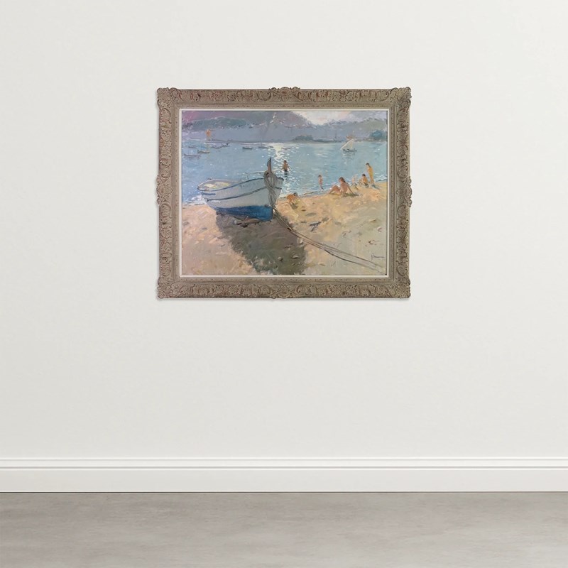In the foreground, a traditional fishing boat is rendered with rich, textured brushwork and moored in a sweeping shadow, while bathers and children animate the shoreline under a luminous Mediterranean sky. Munné’s skillful handling of light and atmosphere, hallmarks of the Catalan Luminist tradition, is evident throughout the composition.