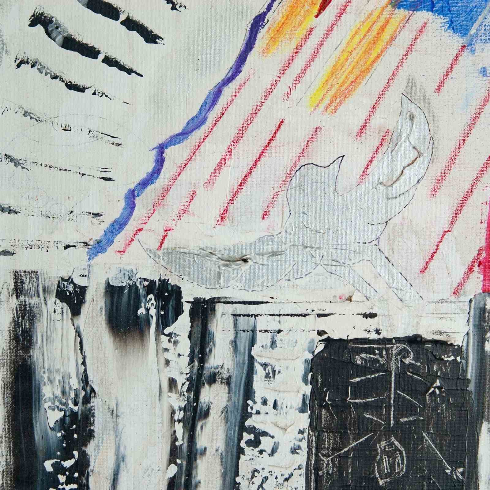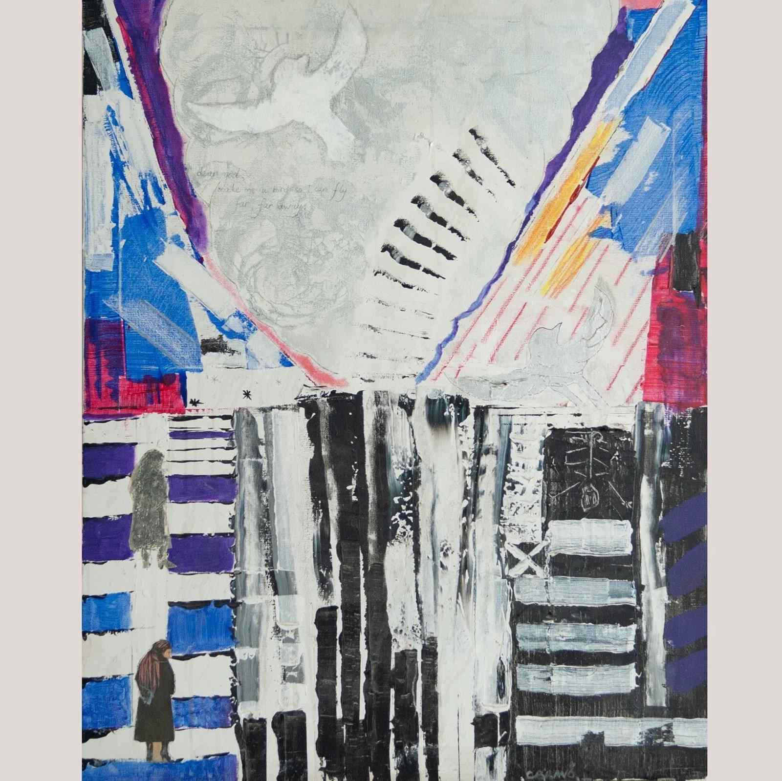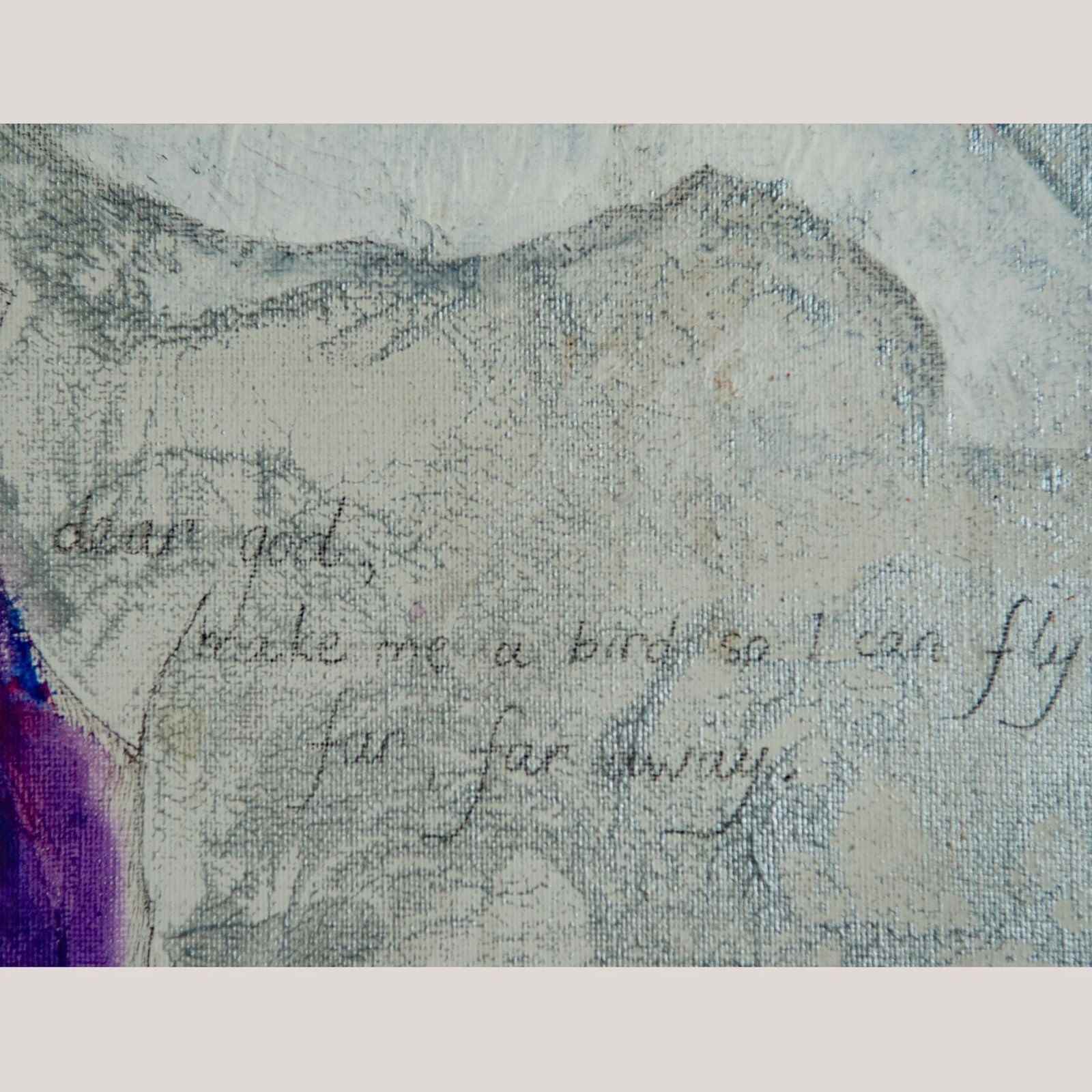 This striking abstract mixed-media painting signed C. Bravo combines bold geometric structure with lyrical emotion. Vertical black and white bars create a sense of rhythm and confinement, while vivid accents of violet, crimson, and blue energize the composition. Above, a faintly drawn bird soars within a pale sky, accompanied by the handwritten phrase, “dear god, make me a bird so I can fly far far away.” The integration of text, texture, and layered pigment evokes longing and transcendence. The artist’s technique reveals a balance between disciplined design and expressive freedom, resulting in a deeply atmospheric composition that bridges abstraction and narrative. Its tactile surface and visual poetry make it a compelling focal point in any refined contemporary setting.