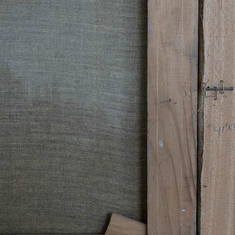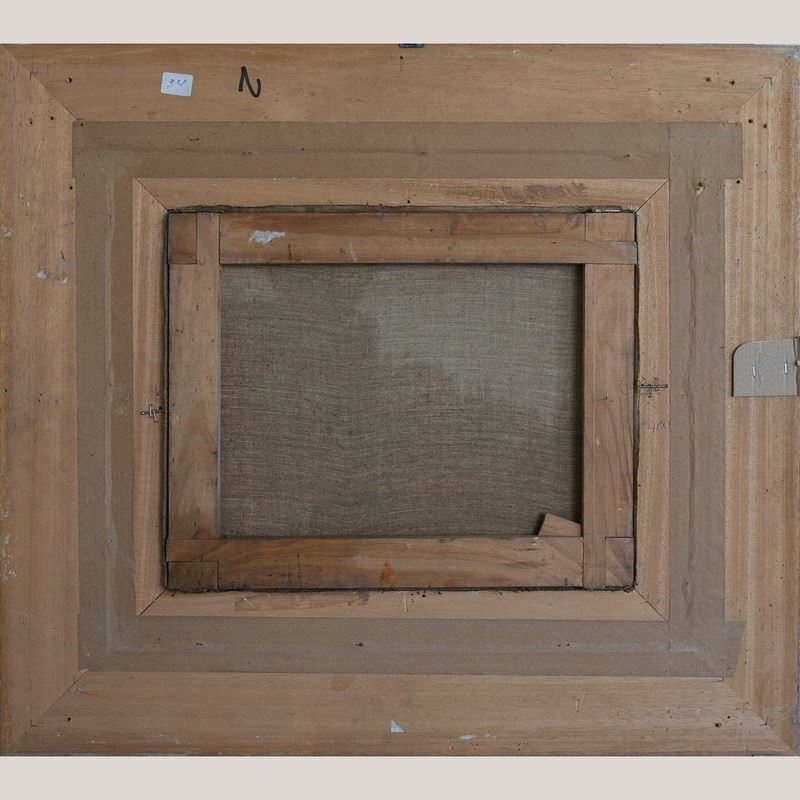 Good. Molded wood and stucco frame with a silver-toned patina, showing minor flaws and signs of wear.