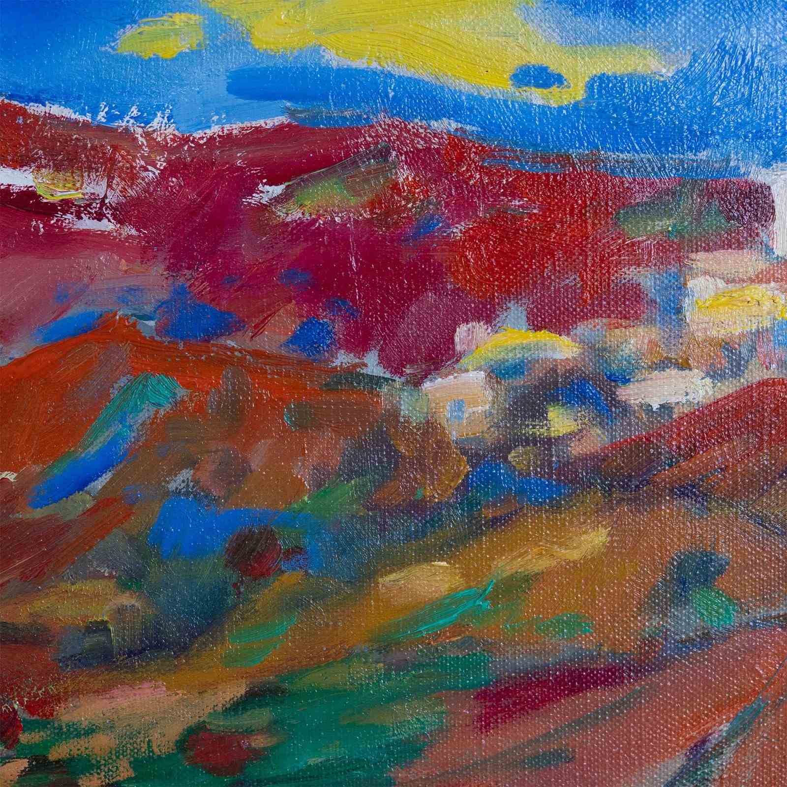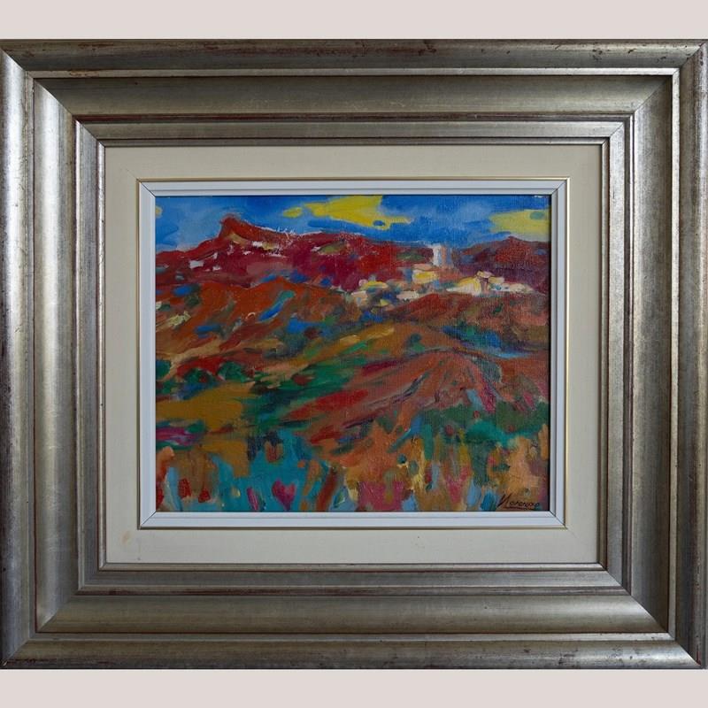 This oil painting portrays a mountainous landscape bathed in warm, vivid light, with reds, ochres, and greens applied in broad, expressive strokes. Deep blues and yellow highlights in the sky heighten contrast and energy. Rather than a literal view, the work offers a subjective interpretation where color and texture convey emotion over detail. The loose, gestural brushwork and intense palette evoke Expressionism and Mediterranean Fauvism, emphasizing mood and luminosity over realism. Though unsigned, the piece reflects the artistic pursuit of transforming nature into an expressive, poetic vision.