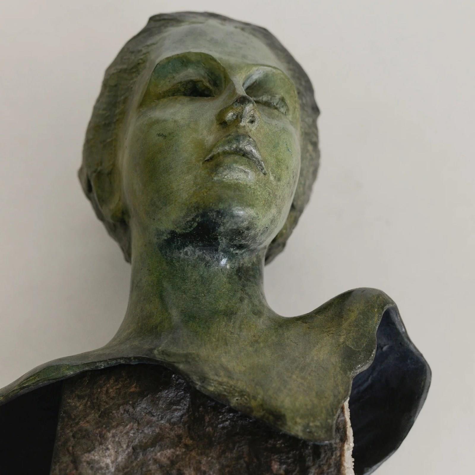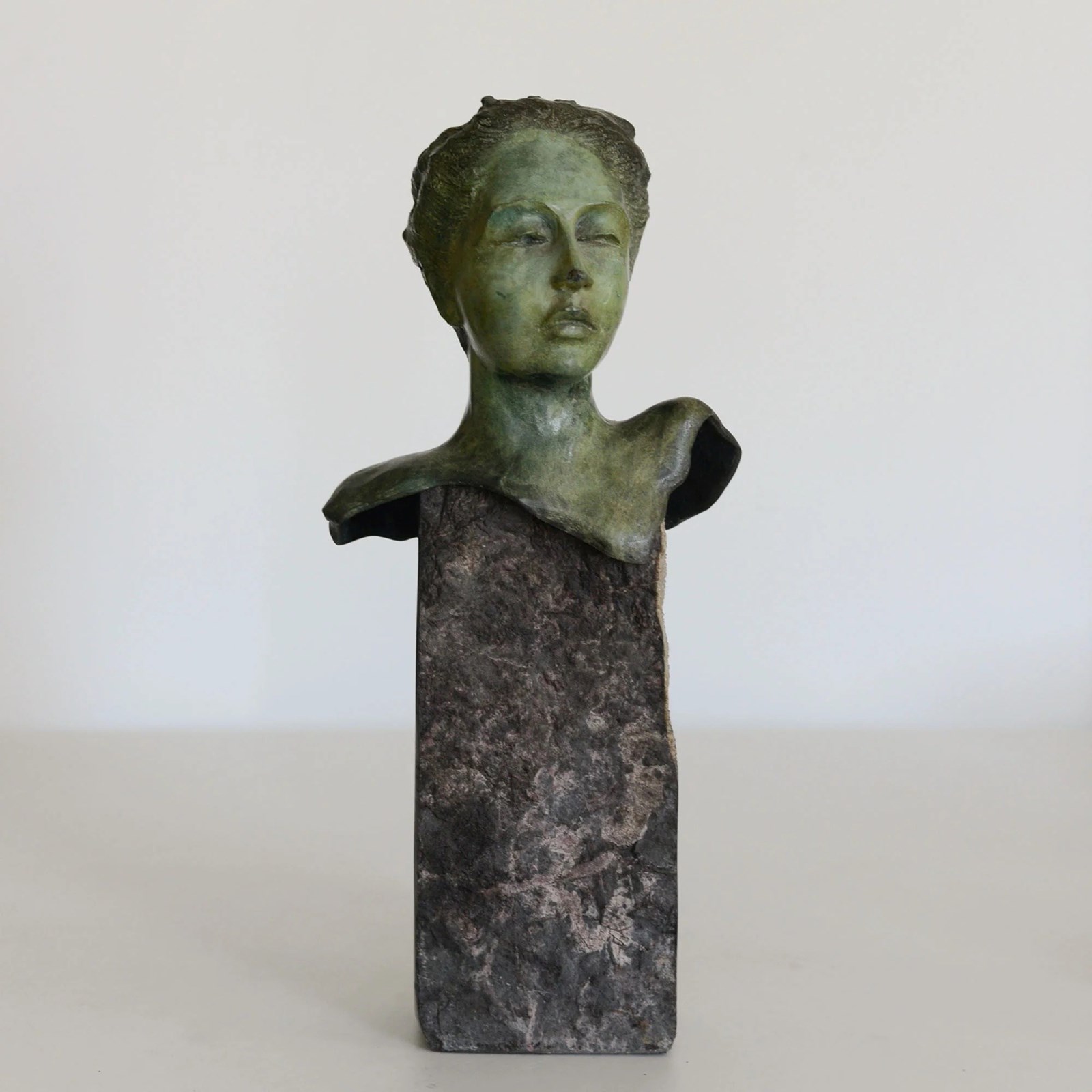 This sculpture represents a female bust executed in patinated bronze and mounted on a vertically oriented stone base. The figure features simplified delecate facial modeling, an elongated neck, and gently defined shoulders. The bronze surface displays a green patina with visible tonal variation. The stone base is left rough-textured, creating a clear material contrast with the refined upper form. The work is signed with an unidentified mark and numbered 3/6, indicating a limited edition.