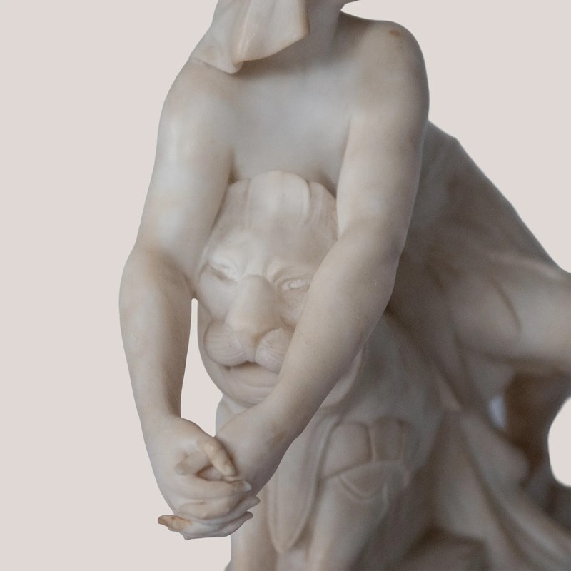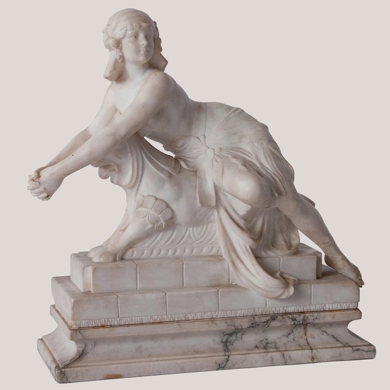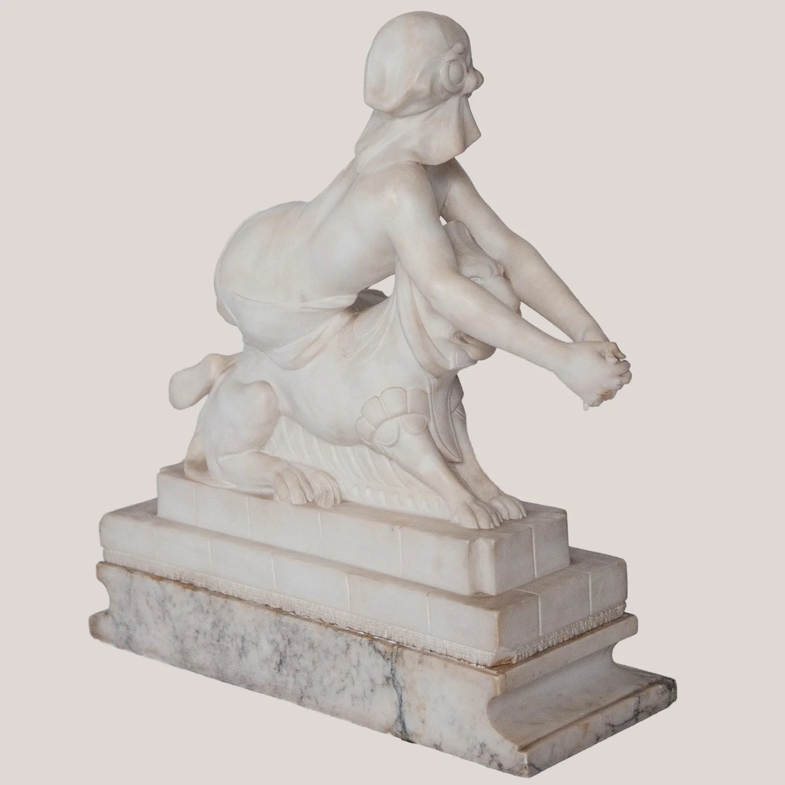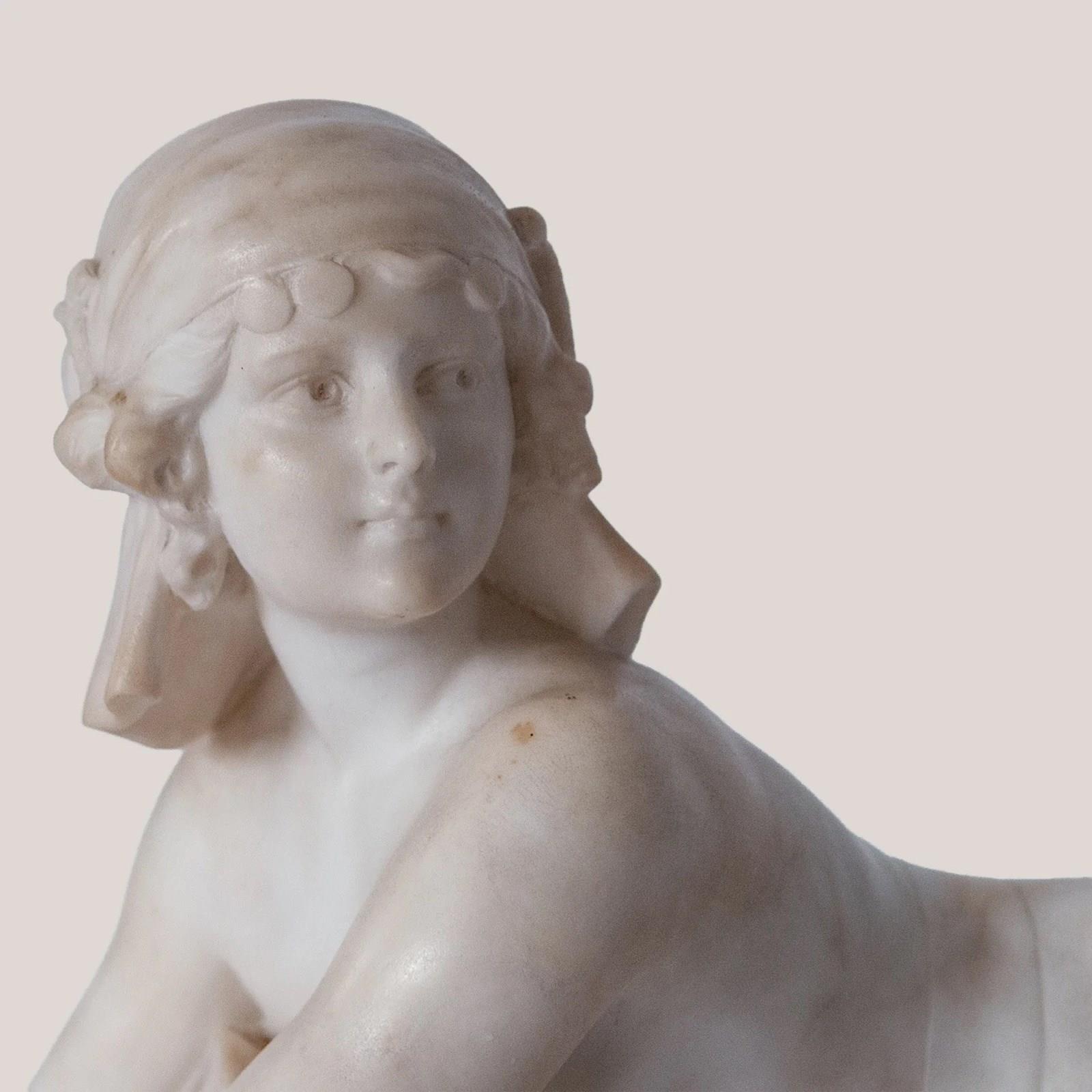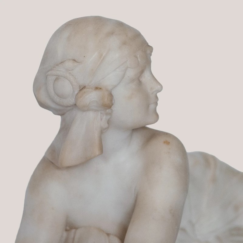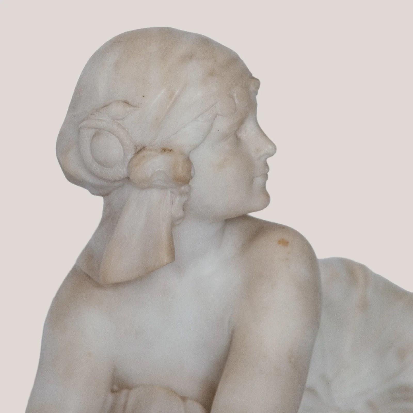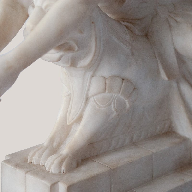 This finely carved sculpture by C. Cipriani presents a seated female figure poised on top a stylised mythical creature, executed in alabaster, possibly marble, with delicate modelling and refined classical details. The pale stone surface emphasises the soft transitions across the drapery, anatomical contours, and serene facial expression. Her extended arms and gentle twist of the torso create a dynamic yet balanced composition, while the stepped architectural base introduces a structured contrast to the fluid modelling above. The work reflects the early 20th-century Italian academic tradition, blending neoclassical elegance with romanticised genre elements. Its harmonious proportions and polished craftsmanship give the piece a distinguished presence well suited to sophisticated display environments.