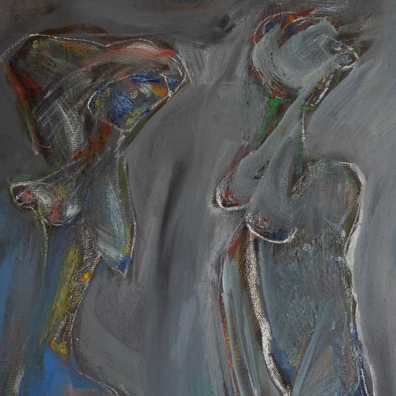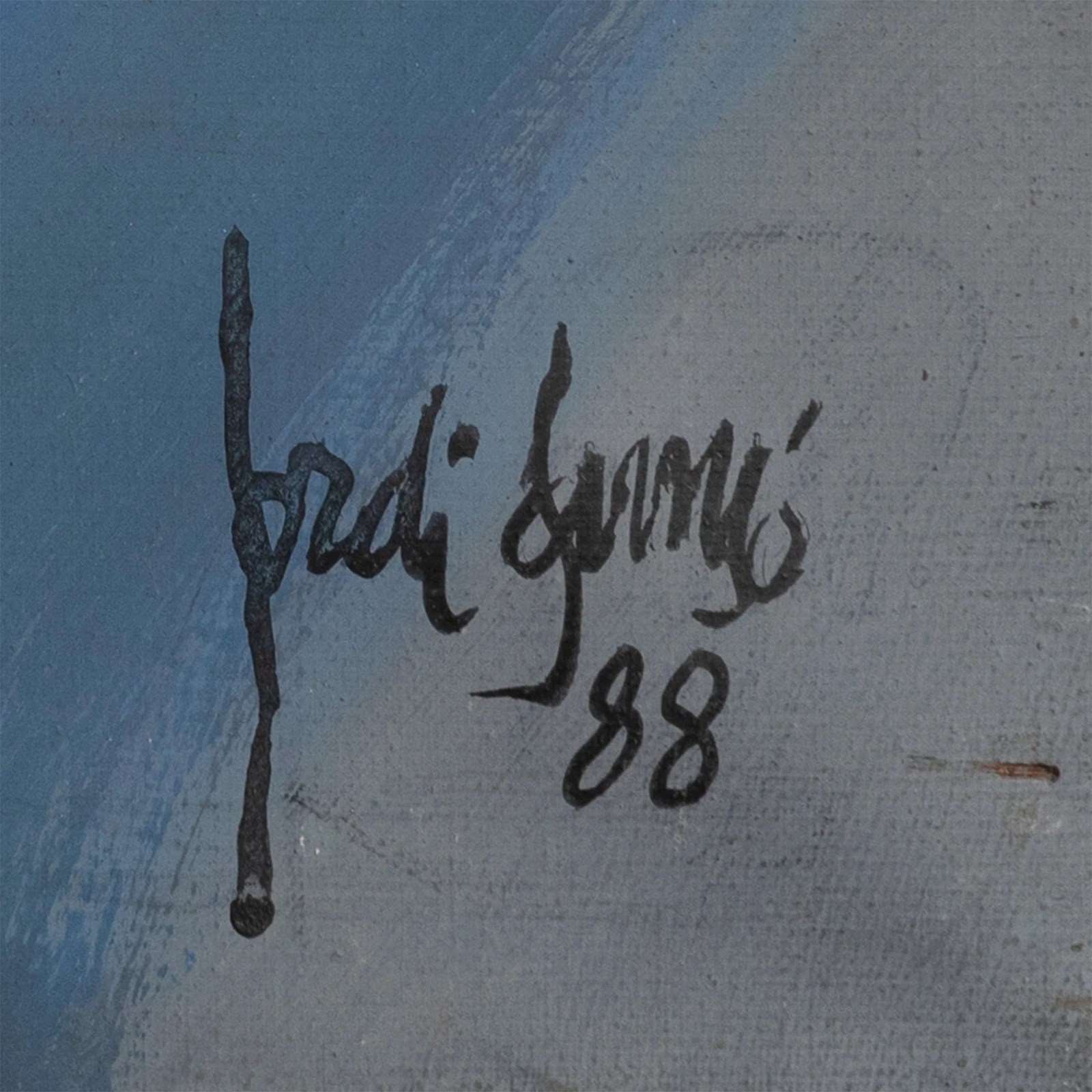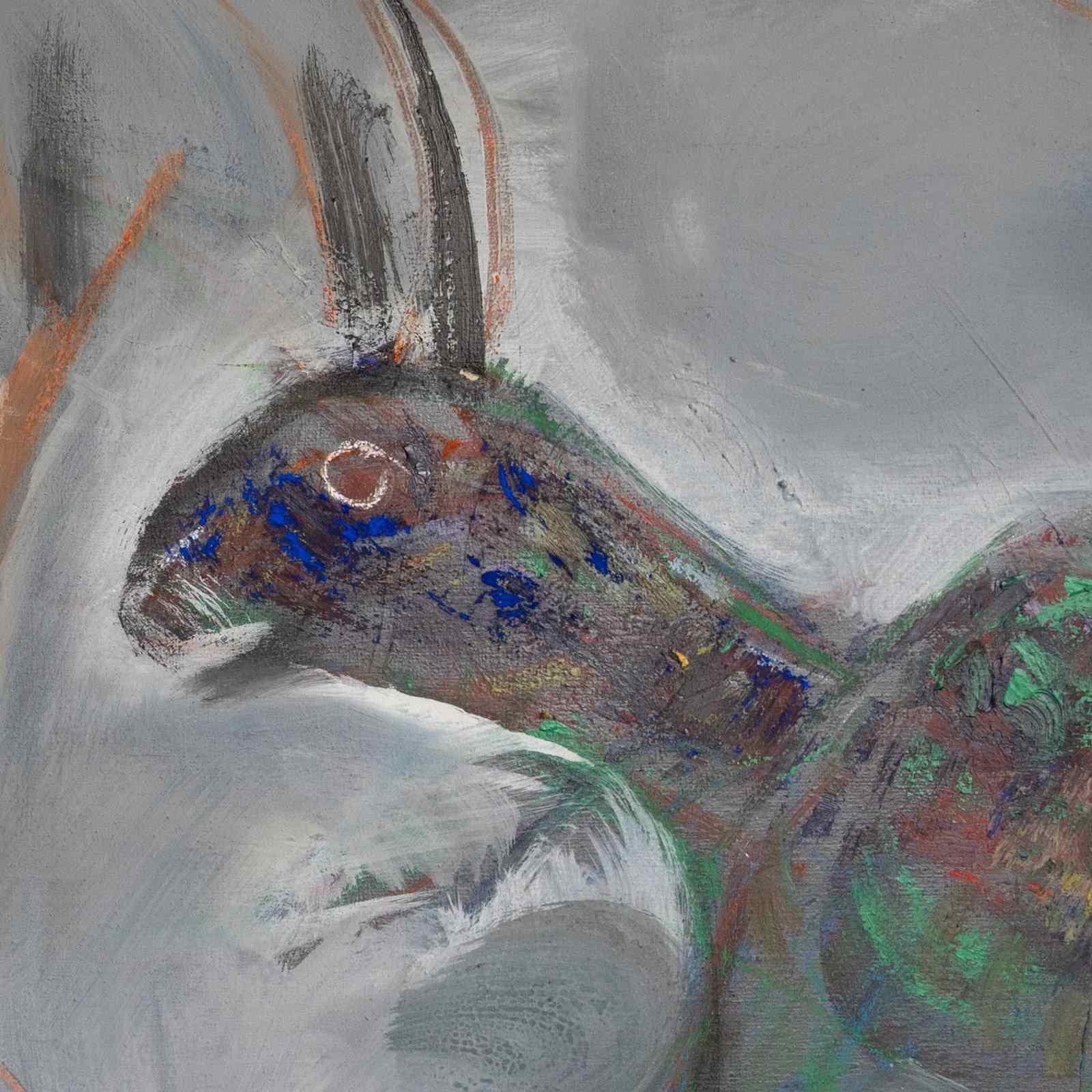 Jordi Samsó’s 1988 composition captures a haunting convergence of human and animal forms in a dreamlike, expressionistic space. Rendered in gestural, fluid strokes and a moody palette of slate grey, smoky blues, and rust-toned accents, the scene evokes a sense of tension and movement. Two abstracted female figures emerge from the shadows, their postures charged with both vulnerability and strength, as a vividly textured hare approaches from the right—its presence both mystical and symbolic. Samsó’s expressive brushwork and bold contour lines create a charged, visceral surface, while translucent overlays of color lend emotional depth and ambiguity. The composition reflects the artist’s signature blend of figuration and abstraction, rooted in postwar Catalan modernism. A rare and powerful piece from his mature period, it invites reflection on the boundaries between the human and the animal, the sensual and the surreal. A striking focal point in any thoughtfully curated space.