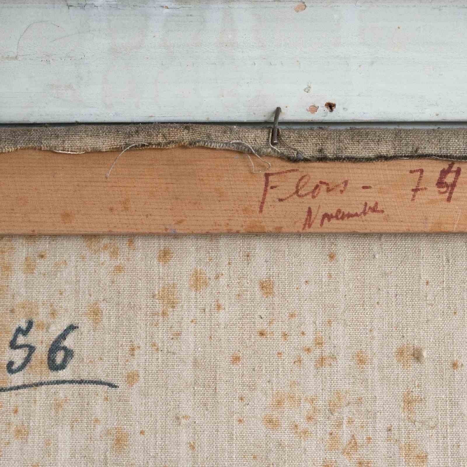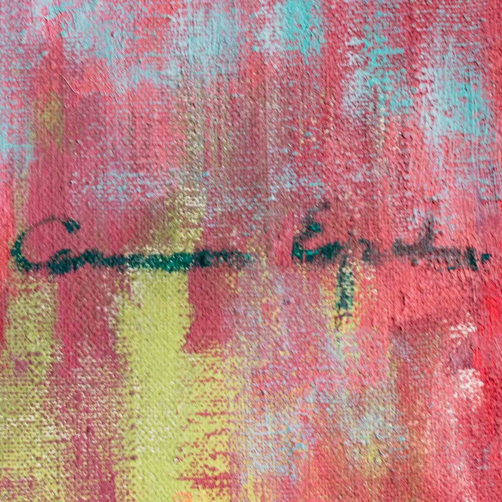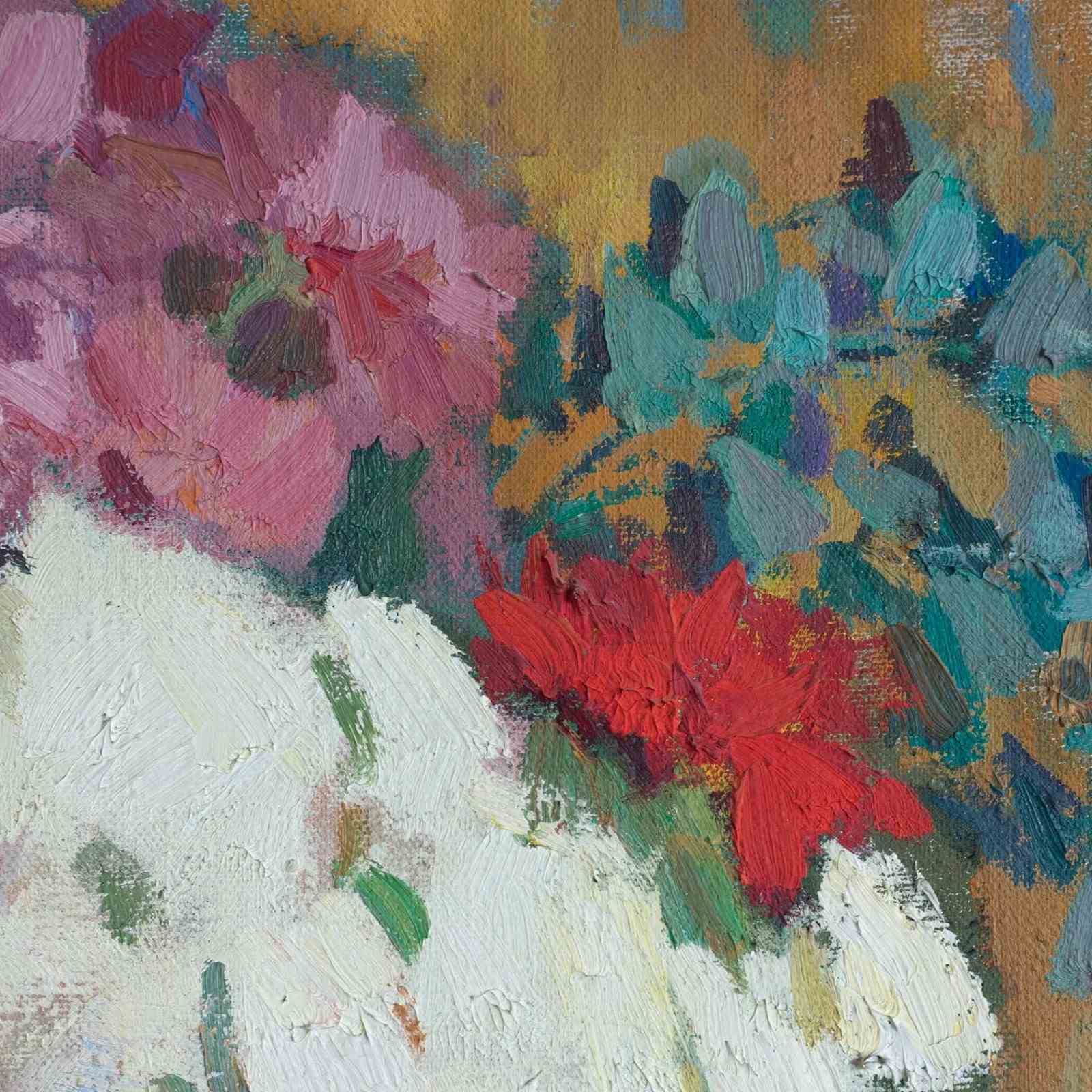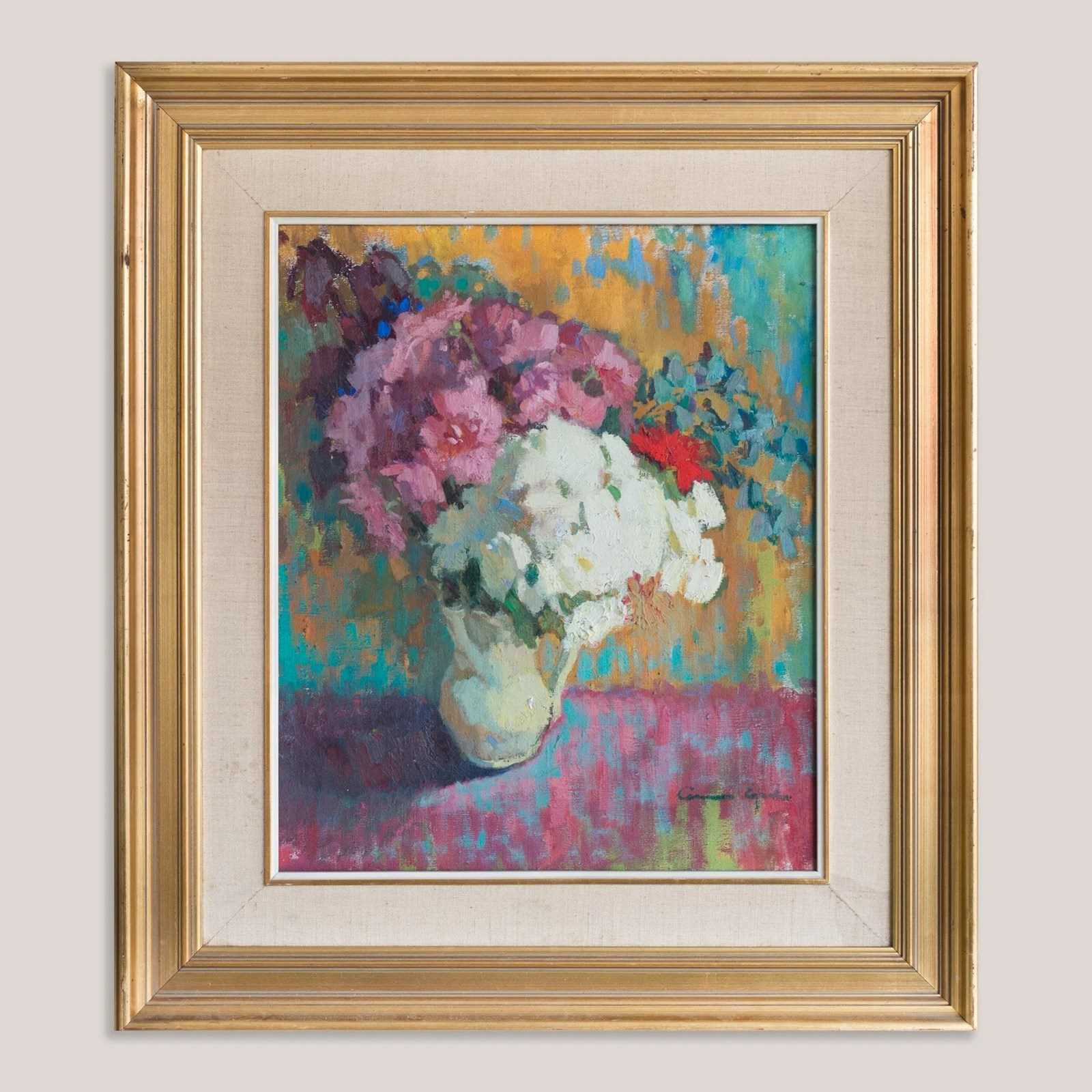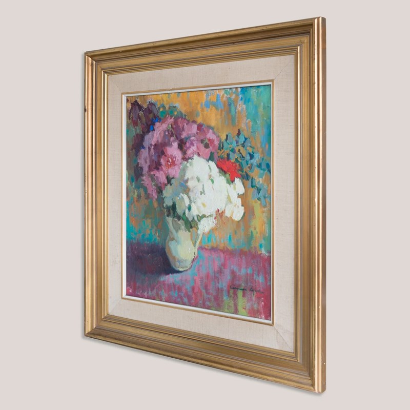 This signed colourist oil painting by a presently unidentified artist depicts a floral still life arranged in a vase, rendered with expressive brushwork and a vibrant, layered palette. Thick, impasto application defines the petals and foliage, while contrasting tones of pink, white, turquoise, and ochre create depth and visual harmony across the composition. The work reflects 20th-century colourist traditions, where form is suggested through colour relationships and painterly texture rather than precise detail.
