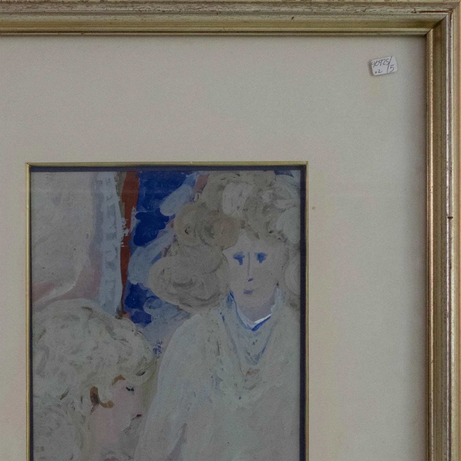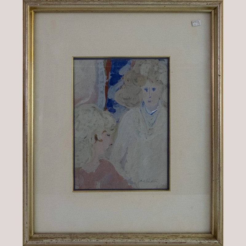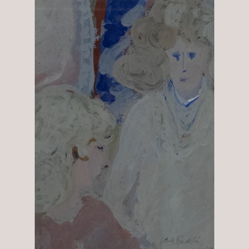 In this serene and evocative portrait, Carlos Cardella explores intimacy through restraint and tone. Two women are shown in close conversation or quiet thought, their faces softly defined with washed edges and delicate contrasts. The palette—muted mauve, ash grey, blush, and pale indigo—creates a hushed, contemplative atmosphere. Gentle modeling and velvety brushwork recall early 20th-century modernist portraiture, with an emphasis on emotional nuance over descriptive realism. The composition’s verticality and subtle color field lend a sense of quiet formality, while the elegant balance between figures and background reflects Cardella’s masterful compositional control. This work exemplifies his talent for capturing tenderness and presence with minimalist means, firmly rooted in the Spanish post-war figurative tradition.