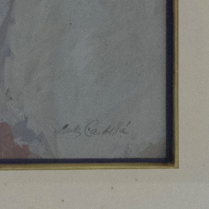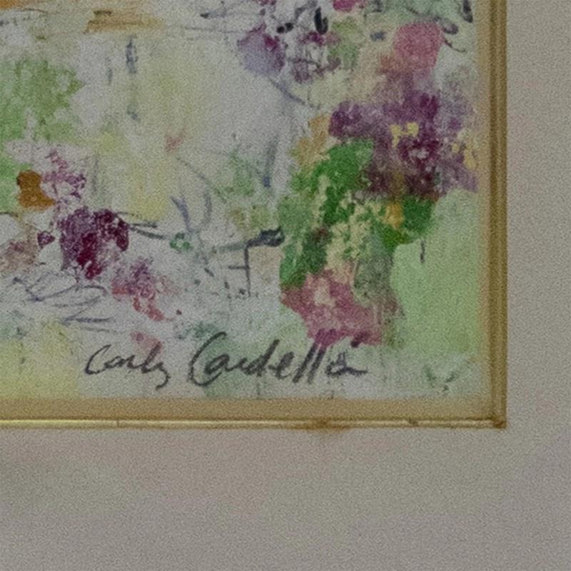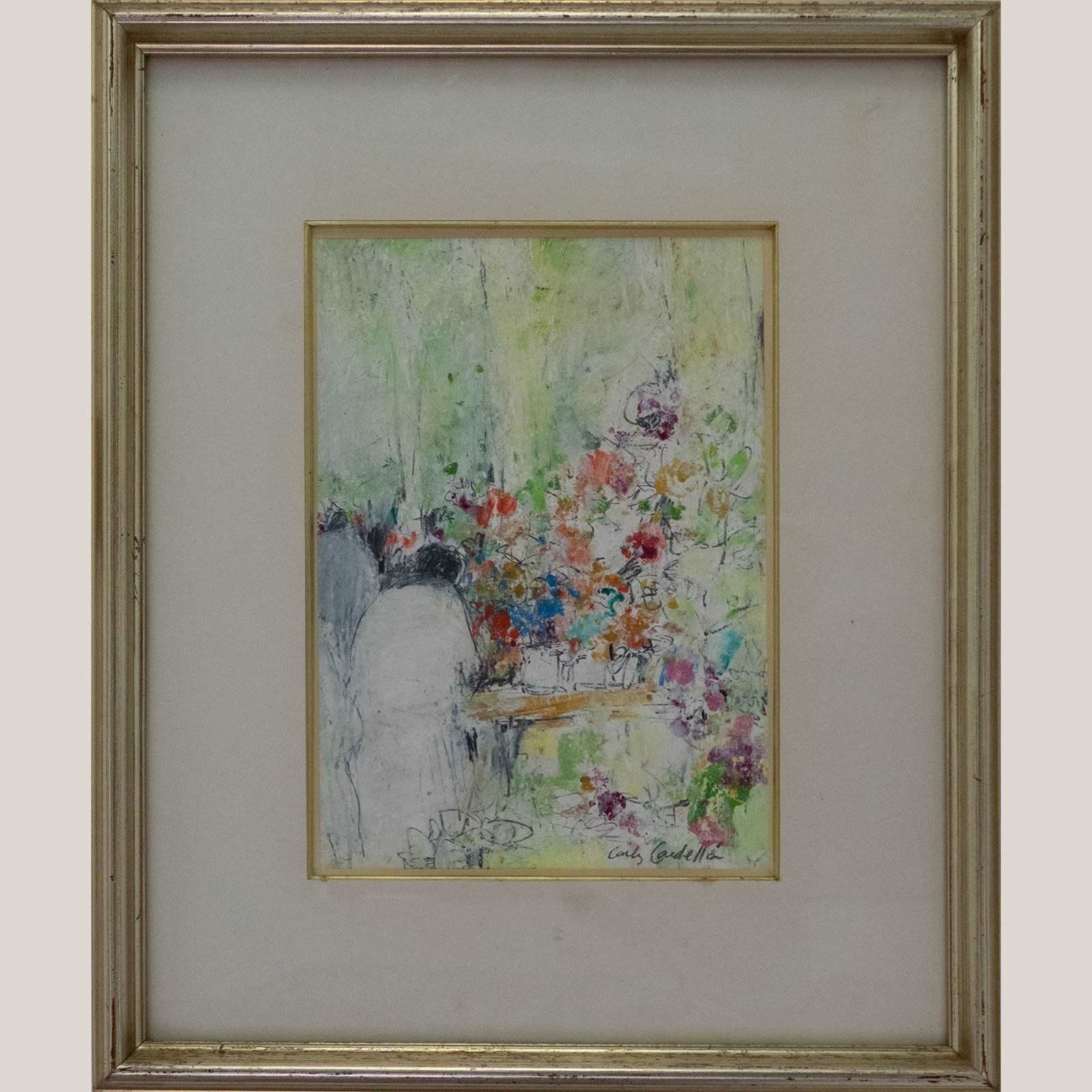 Carlos Cardella’s vibrant floral composition is a celebration of color and spontaneity. Positioned around a softly sketched table, a burst of wildflowers spills across the canvas in layered reds, lilacs, saffron, and sky blue. Light filters through an abstracted green backdrop, dissolving the edges and immersing the figures—two seated silhouettes—in an almost dreamlike haze. The brushwork is instinctive, fluid, and expressive, with blooms suggested through gestural strokes and splashes of color rather than fine detail. Subtle outlines and delicate pencil marks lend structural hints beneath the painterly surface. Cardella’s ability to balance energy with softness results in a dynamic yet calming work that draws from post-impressionist and Mediterranean modernist traditions, bringing visual warmth and lyrical grace to any refined setting.