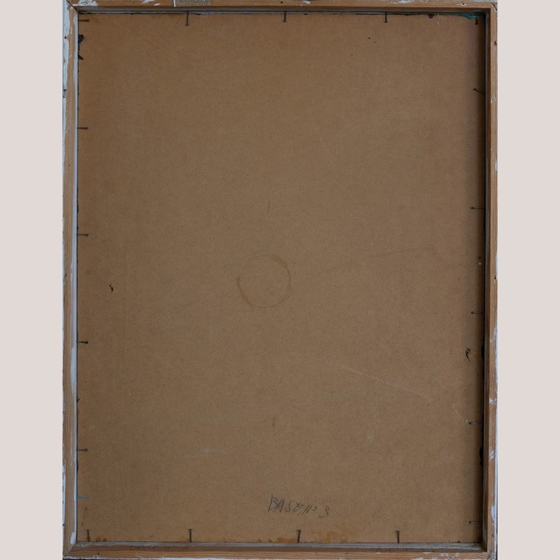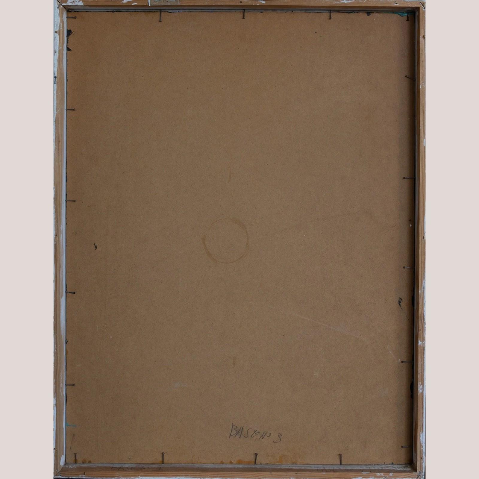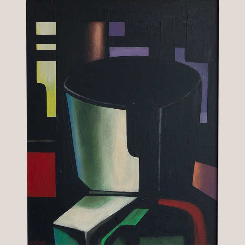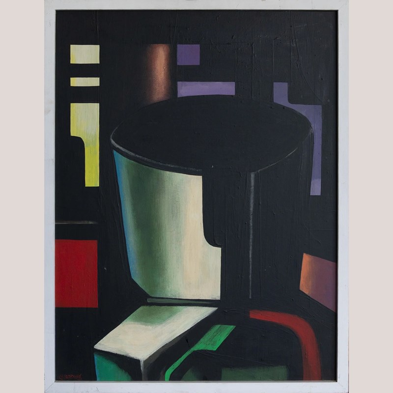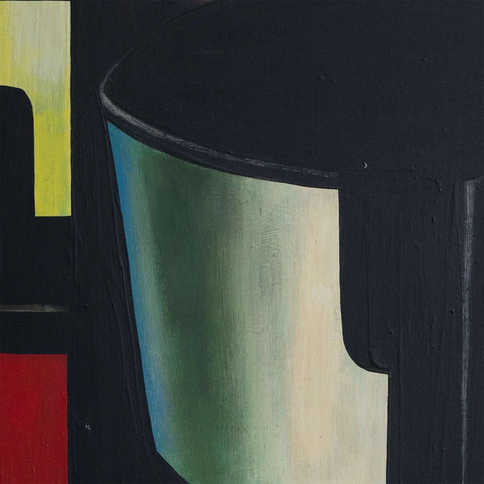 Signed by the artist Cárdenas, this bold and meticulously composed work in oil on board explores the expressive potential of geometric form and spatial tension. At its center, a monolithic cylindrical shape is rendered in softly gradated tones of green, cream, and black, rising against a fragmented field of sharp-edged planes in crimson, ochre, violet, and emerald. The surface is richly textured, with smooth brushwork and confident lines that emphasize the painting’s structural harmony and modernist sensibility. The use of deep black as a backdrop enhances the luminous quality of the surrounding colors, while the interplay between light and shadow creates an illusion of depth and movement. Balancing architectural strength with abstract poetry, this piece reflects mid-century influences and a deep engagement with form, contrast, and composition. Its refined palette and sculptural aesthetic make it a powerful statement piece in any sophisticated, design-conscious setting.