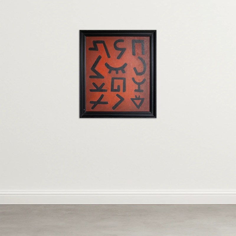 Painted in 1991 by Manuel Rufi Gibert, this commanding abstract work exemplifies the artist’s signature exploration of geometry, rhythm, and surface texture. Against a deeply worked red background, a sequence of bold black symbols unfolds with measured precision, suggesting both coded language and architectural order. The composition’s austerity is offset by the warmth of the chromatic field, which reveals subtle tonal shifts and traces of the artist’s hand beneath the pigment. Rufi Gibert’s refined balance between form and spontaneity places this piece firmly within the lineage of post-war Catalan abstraction, where material presence and visual restraint define meaning. The interplay of flatness and depth, of symbol and silence, makes this painting an elegant statement of visual intelligence and tactile beauty suited to refined modern spaces.