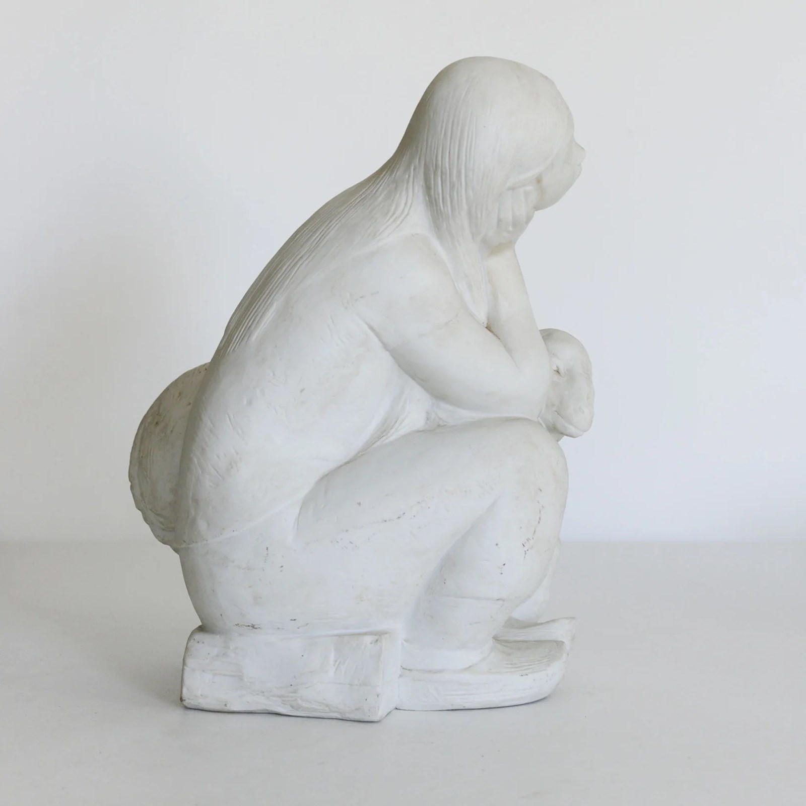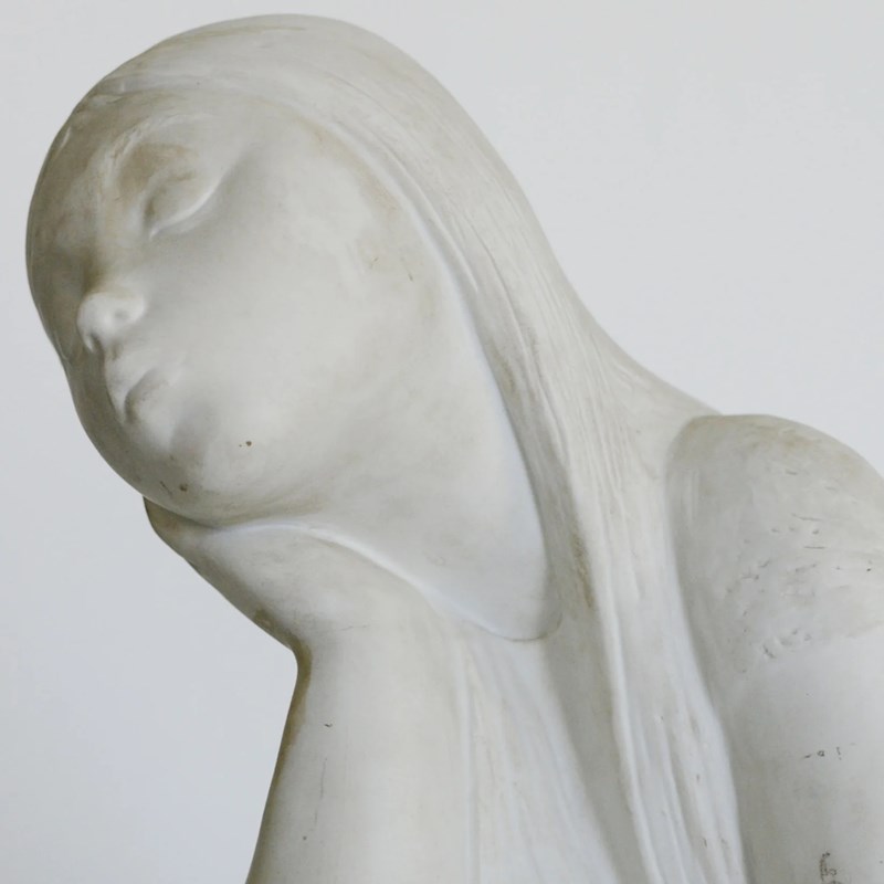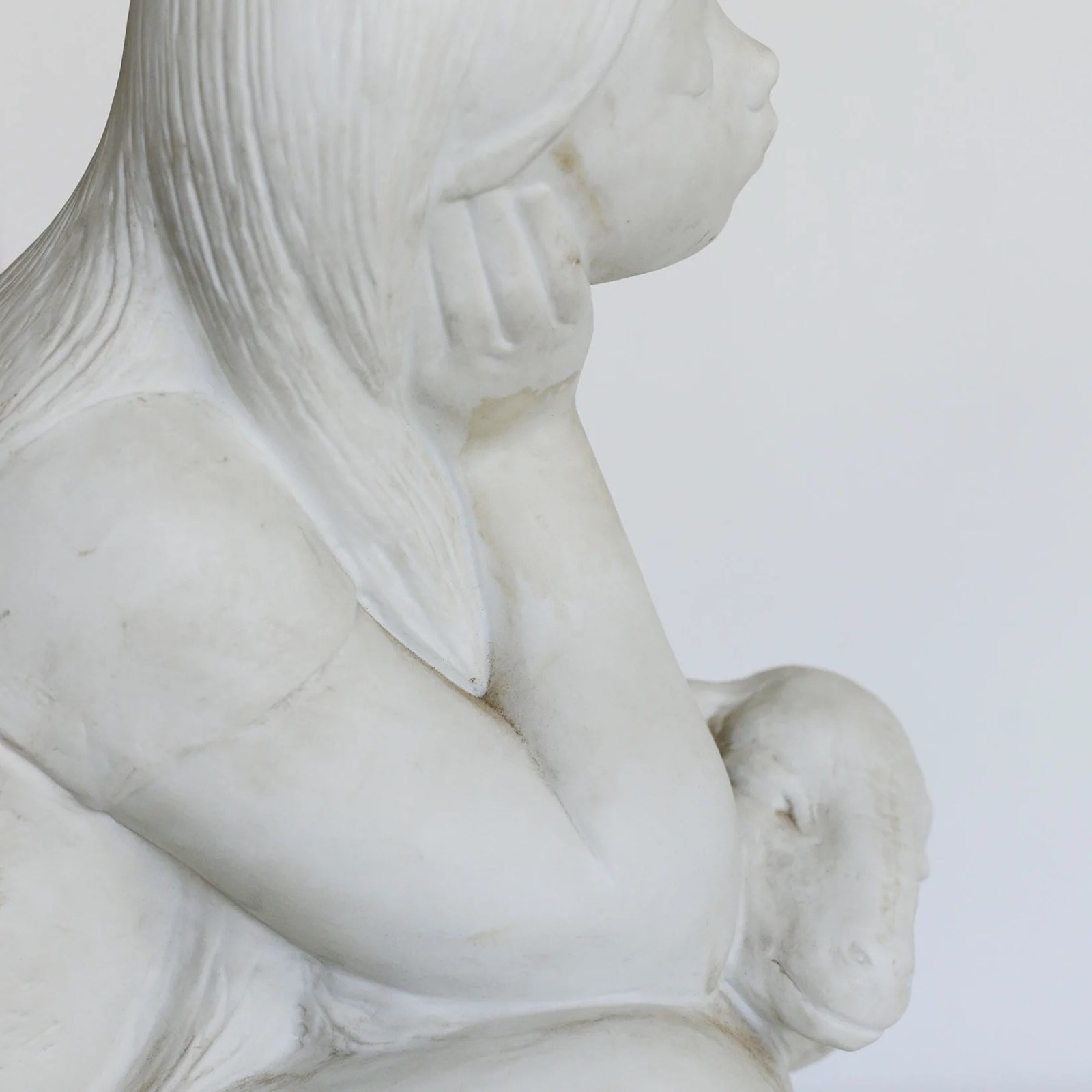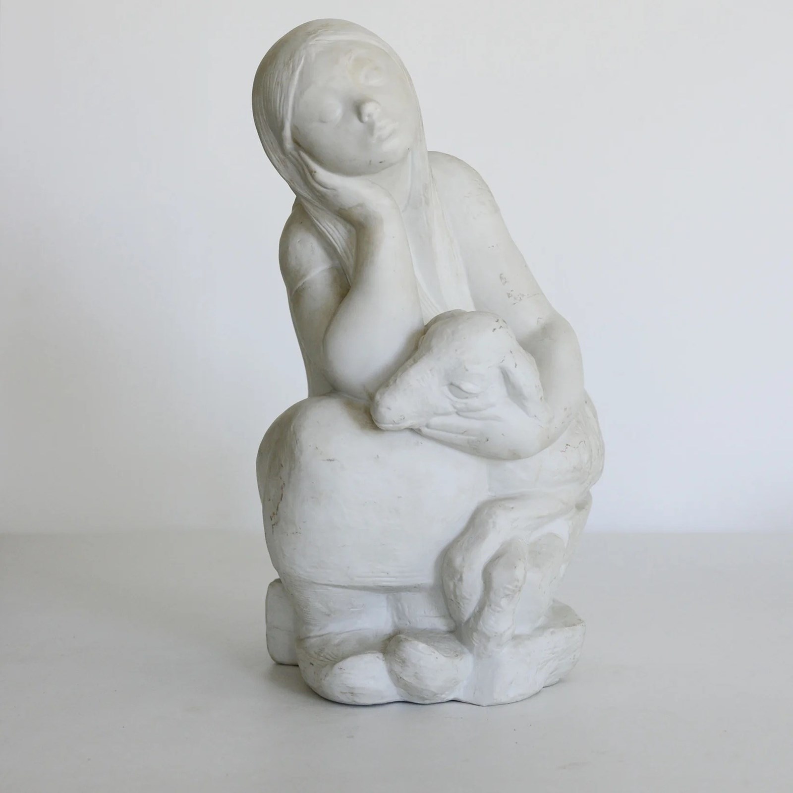 This parian ware sculpture shows a seated young girl resting her head on one hand while holding a lamb across her lap. Made in white parian with a matte finish, the figure is modeled with smooth surfaces and simplified forms typical of late 19th to early 20th century production. The elongated neck, softly defined facial features, and flowing hair reflect neoclassical influences common in Victorian and Edwardian decorative sculpture. The lamb serves as a pastoral motif frequently used in domestic ornamental figures of the period. The compact, balanced composition was intended for decorative display.