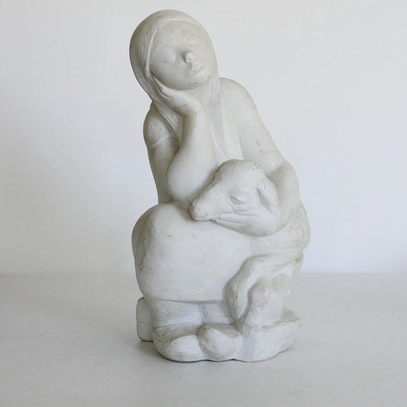 Girl With Lamb - Parian Ware Sculpture - Signed
