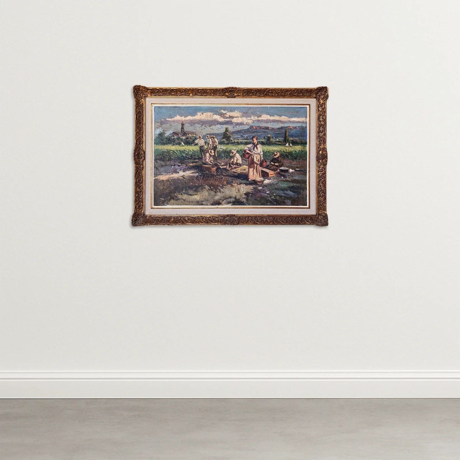 Description: Framed oil on canvas of workers harvesting the crop.