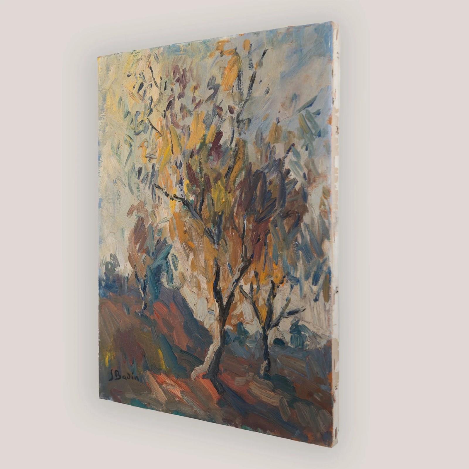 This oil on canvas by Sebastià Badia depicts a simple landscape with two trees positioned on gently rising ground, painted in an impressionist style. The composition is structured around vertical tree forms set against a loosely rendered background. A muted palette of ochre, yellow, blue, and earthy red tones suggests an autumn setting. Brushwork is visible and layered, creating texture and soft transitions of light and color. Depth is conveyed through tonal variation rather than defined perspective. The overall handling reflects mid-20th-century European landscape painting.