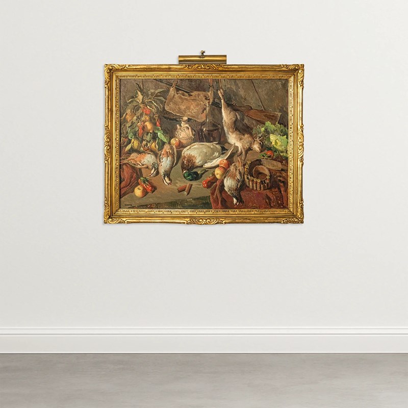 Signed large substantial framed still life study of mediterranean fruit and various wildfowl including the gamekeeper's etire.