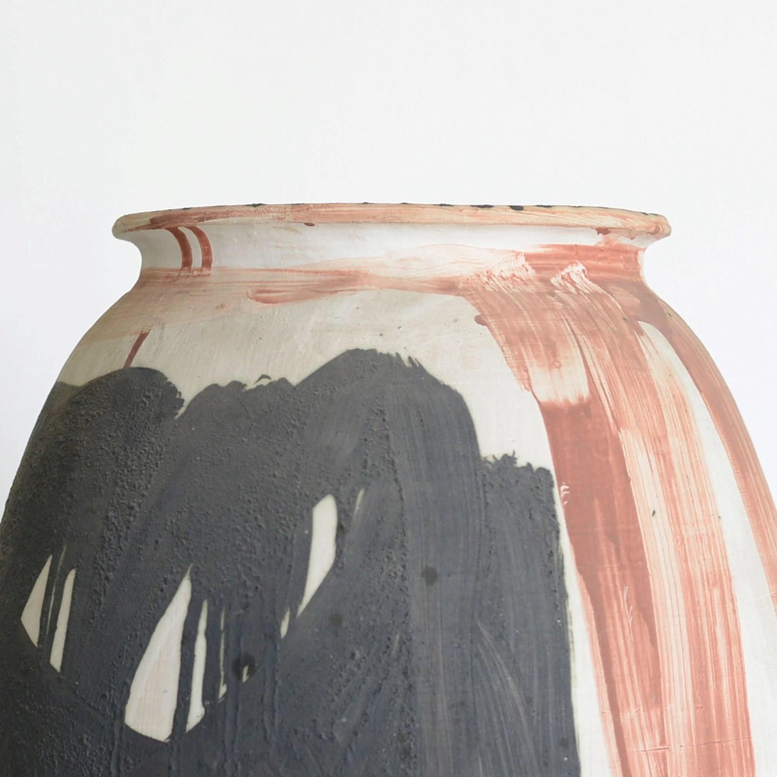 This large studio pottery vessel is an expressive hand-thrown ceramic form, finished with bold abstract brushwork applied directly to the surface. The potter employs a restrained palette of deep charcoal black, warm terracotta, and exposed off-white clay, creating strong visual contrast between painted and unglazed areas. Broad, gestural strokes encircle the rounded body, with visible drips and overlaps that emphasize movement and spontaneity. Thick pigment application produces a tactile surface, while the wide shoulder and slightly everted rim lend the piece a grounded, sculptural presence. The dialogue between painterly abstraction and traditional vessel form reflects late 20th-century studio pottery approaches, where ceramics function as autonomous sculptural works rather than purely utilitarian objects. Its scale and visual weight allow it to stand confidently as a singular sculptural element.