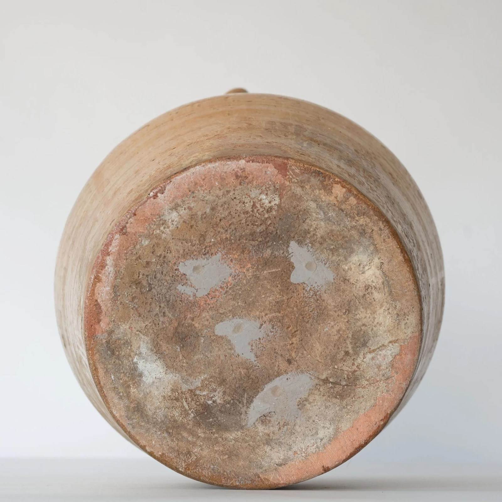 The pot displays age-related wear consistent with its period, including surface patina, abrasions, and firing irregularities.