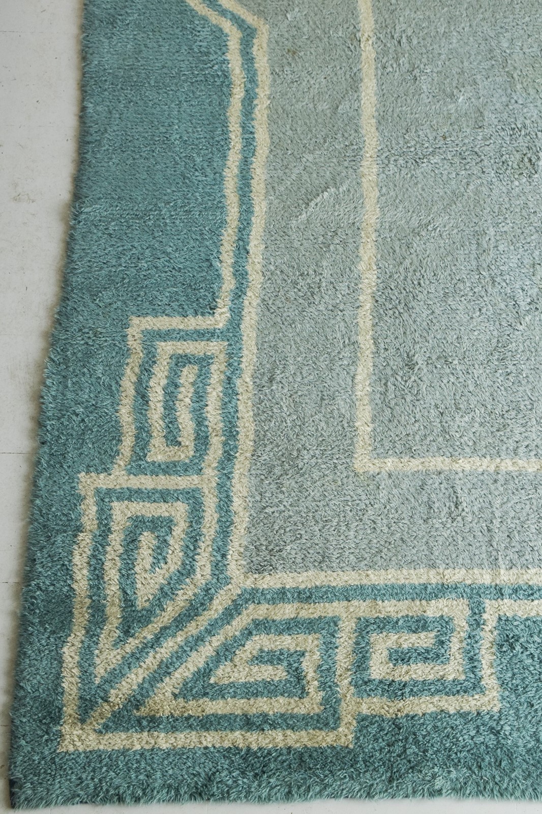 Brighten up your space with this unique rug. With two beautifully complementing tones of blue, this piece is created with a white border pattern reflecting greek or classical design with a modern twist. Approx Date: Second half of the twentieth century Size: H 421 cm x W 274 cm Material: Wool Condition: Some stains. Please see last photographs.