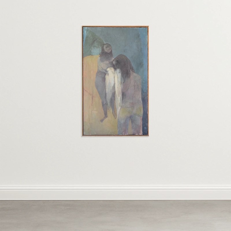 A captivatingly enigmatic piece that strongly echoes the unique Neo-Romanticism of Keith Vaughan (1912-1977). Highly unique and distinctive in its style, this painting depicts two nude female figures holding draped white cloths, which come together to create a form that resembles angel wings, creating a thought-provoking focal point for the composition. The hazy, pastel colours and indistinct forms create an overall dreamlike and ethereal tone for this fascinating piece.