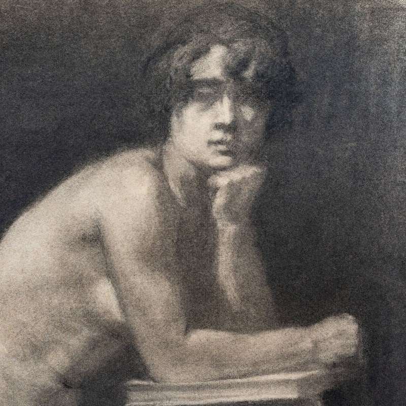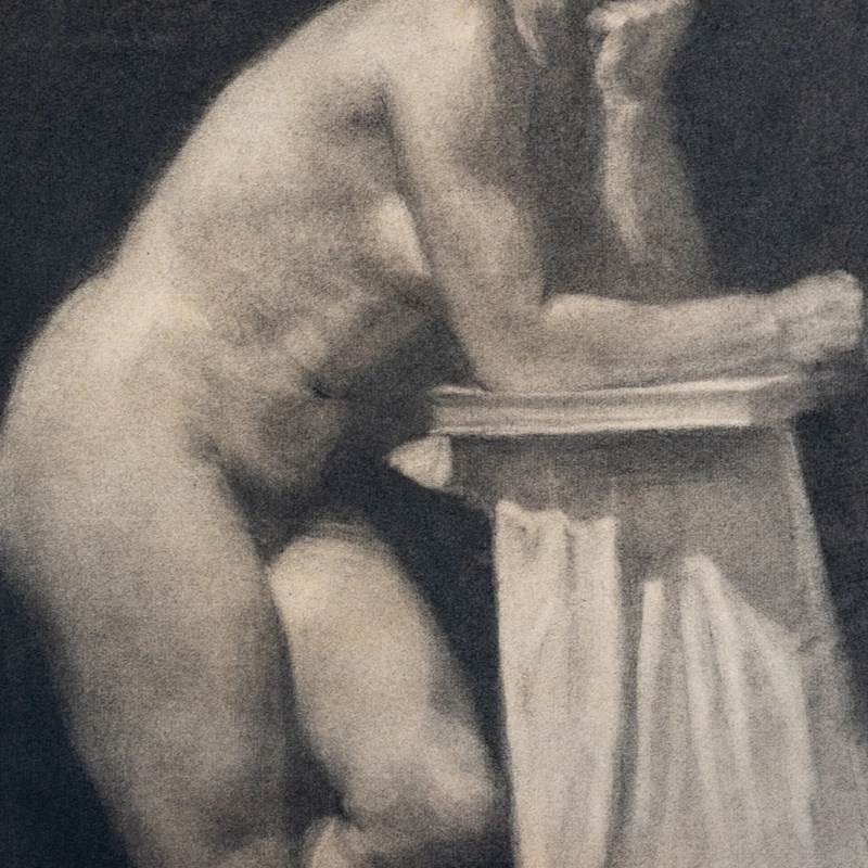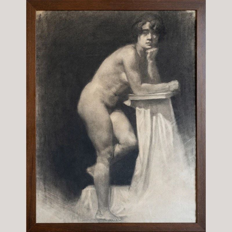 This high-quality charcoal drawing depicts a male nude leaning contemplatively against a draped pedestal, executed with refined tonal control and academic precision. The artist employs subtle gradations of light and shadow to articulate musculature and skeletal structure, allowing the figure to emerge with sculptural clarity from a dark, atmospheric ground. The restrained monochrome palette and softly blended surfaces emphasize volume, balance, and anatomical accuracy rather than expressive gesture. The carefully observed pose and compositional restraint align closely with late 19th- to early 20th-century academic studio practice, where disciplined life drawing formed the foundation of formal artistic training. The calm, introspective mood and controlled chiaroscuro suggest a pedagogical intent rooted in classical ideals. Overall, the work demonstrates accomplished draftsmanship and a sophisticated understanding of form consistent with professional academic instruction.
