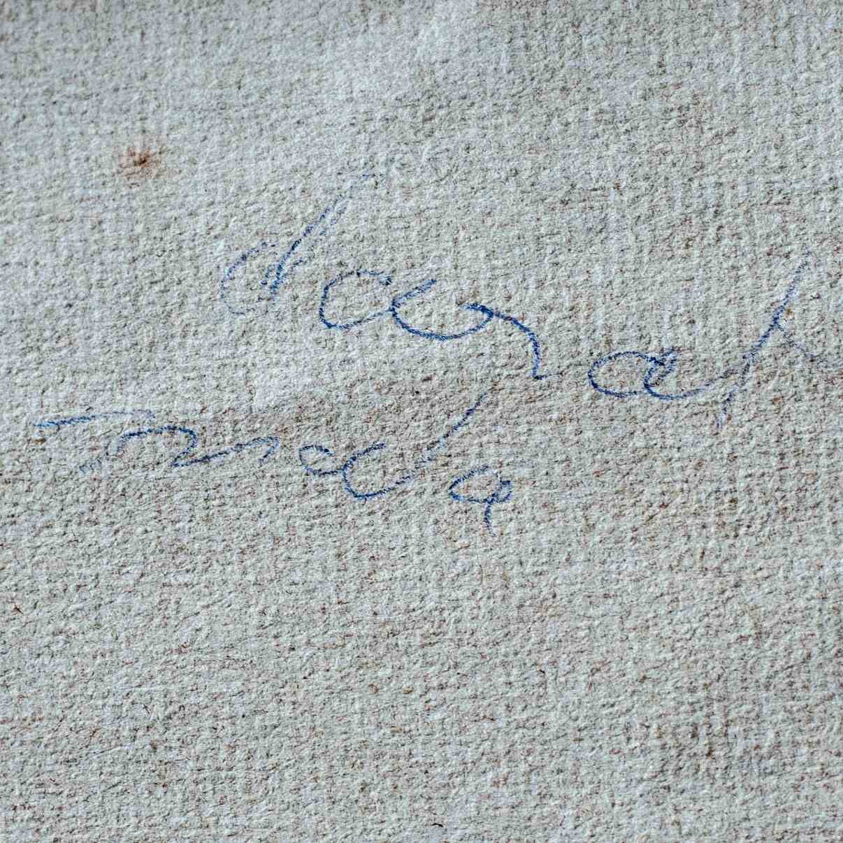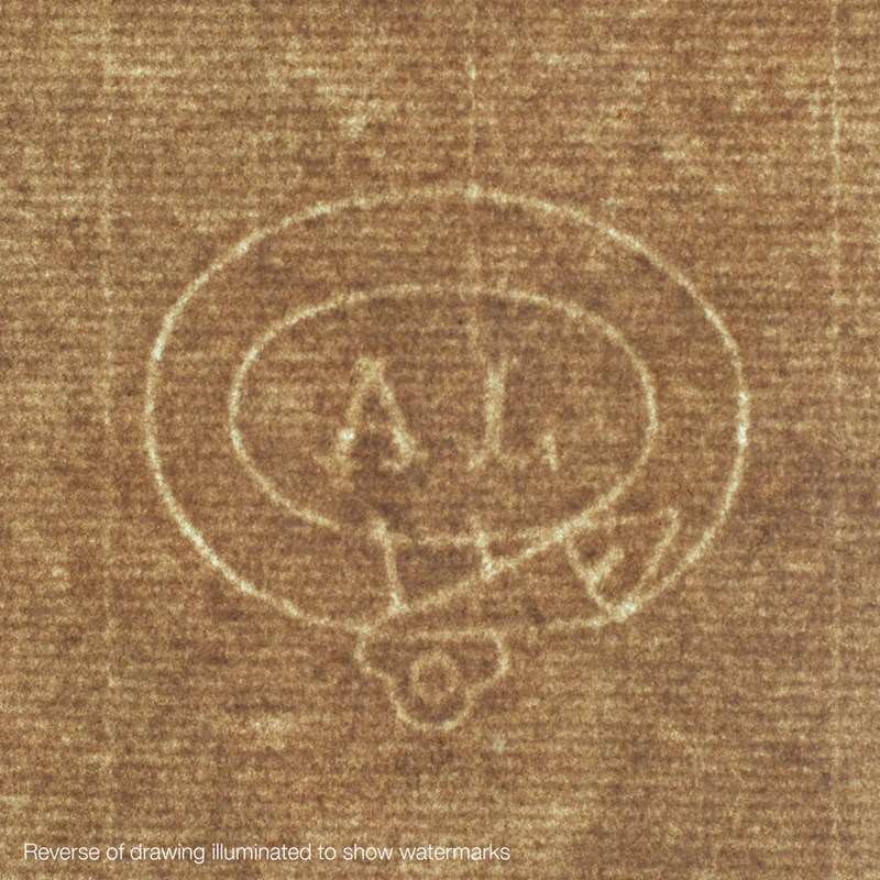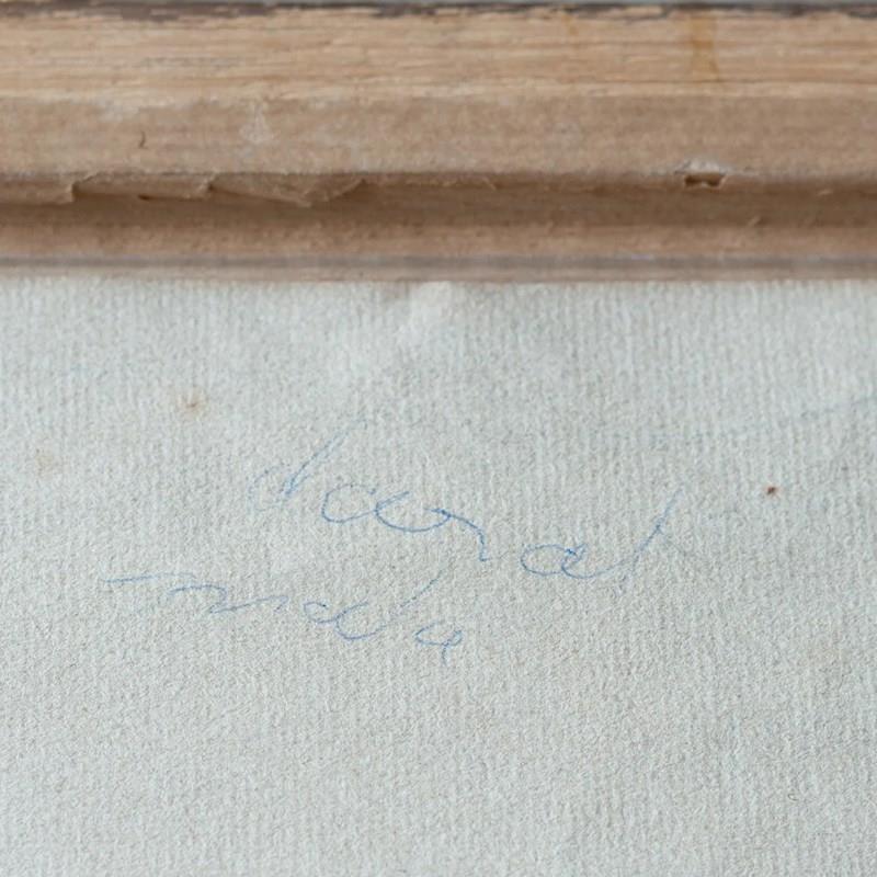 The reverse of the drawing, when illuminated, reveals several significant paper marks. The watermark “INGRES” is clearly legible, identifying Ingres drawing paper, a high-quality surface widely used by professional artists from the late 19th century onward. The vertically oriented watermark “J WHATMAN” refers to James Whatman, the renowned English papermaker whose papers were commonly employed in academic and professional contexts during the 19th and early 20th centuries. An oval stamp bearing the initials “A I” is also visible and is likely a paper mill or distributor’s mark associated with Ingres-type paper rather than an artist’s signature. A blue pencil cursive inscription appears on the reverse but is not fully legible; it does not resolve into an identifiable artist’s name and is consistent with studio notes, ownership marks, or an academic reference.