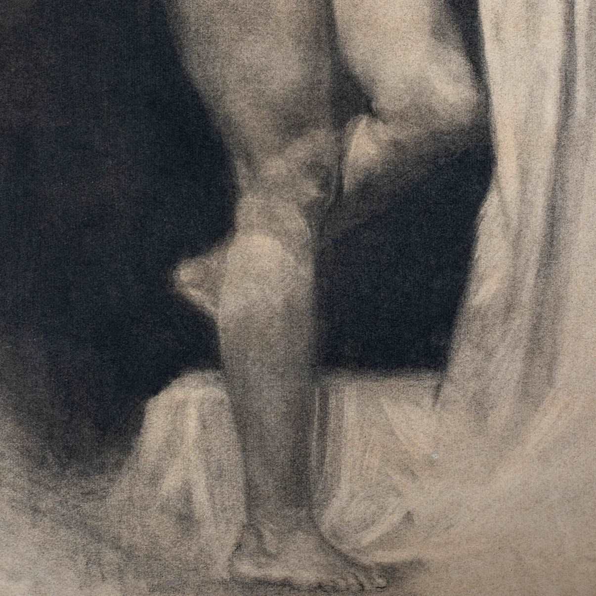 Although the artist remains unidentified, the drawing displays hallmarks of formal academic training associated with European art schools. The precise anatomical study, classical pose, and use of high-quality drawing paper suggest professional-level instruction rather than amateur practice.