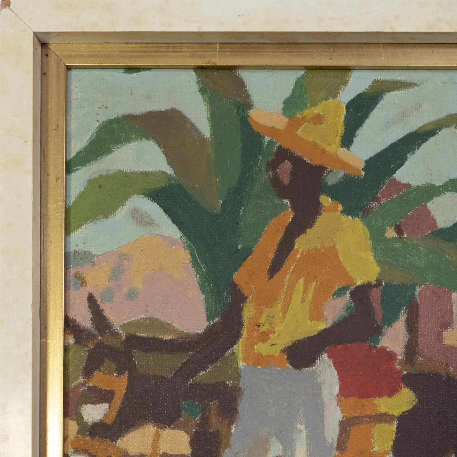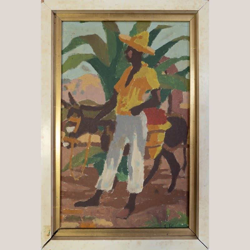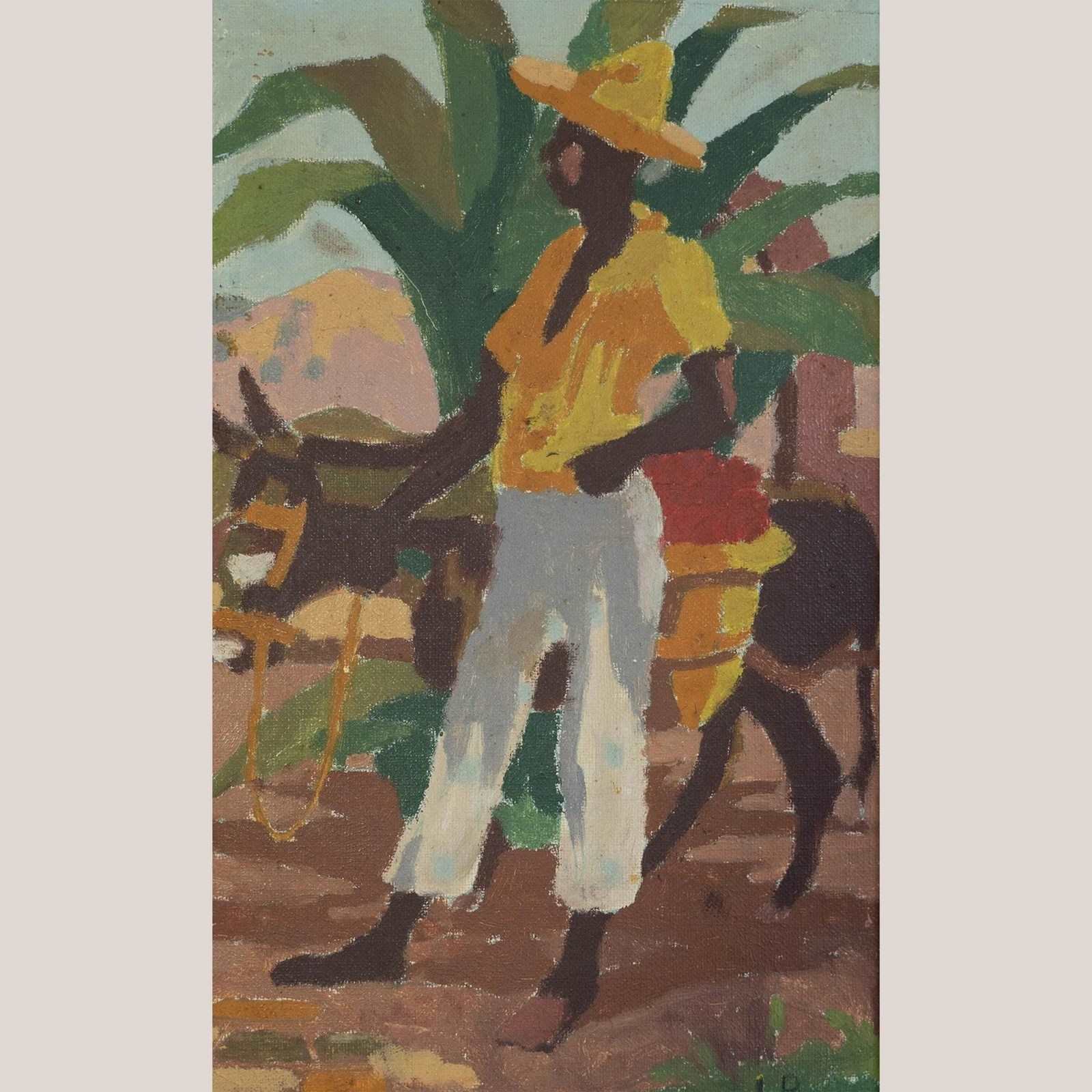 This vibrant oil on board depicts a striking rural scene of a man leading a donkey against the backdrop of bold tropical vegetation. Rendered in a simplified, modernist style, the composition is defined by strong, flat planes of color and a palette dominated by earthy browns, deep greens, and sunlit yellows. The figure, dressed in a vivid shirt and wide-brimmed hat, is silhouetted with confident brushstrokes, while the donkey stands solidly beside him, loaded with goods, suggesting themes of labor and tradition.