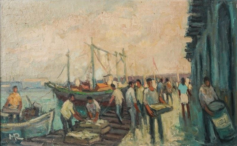 Description: Frame impressionist oil on canvas of fishermen unloading their days catch at mariners al port d'arenys